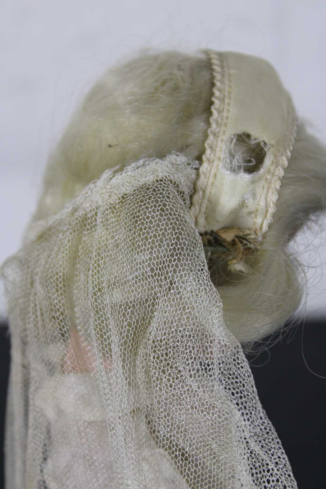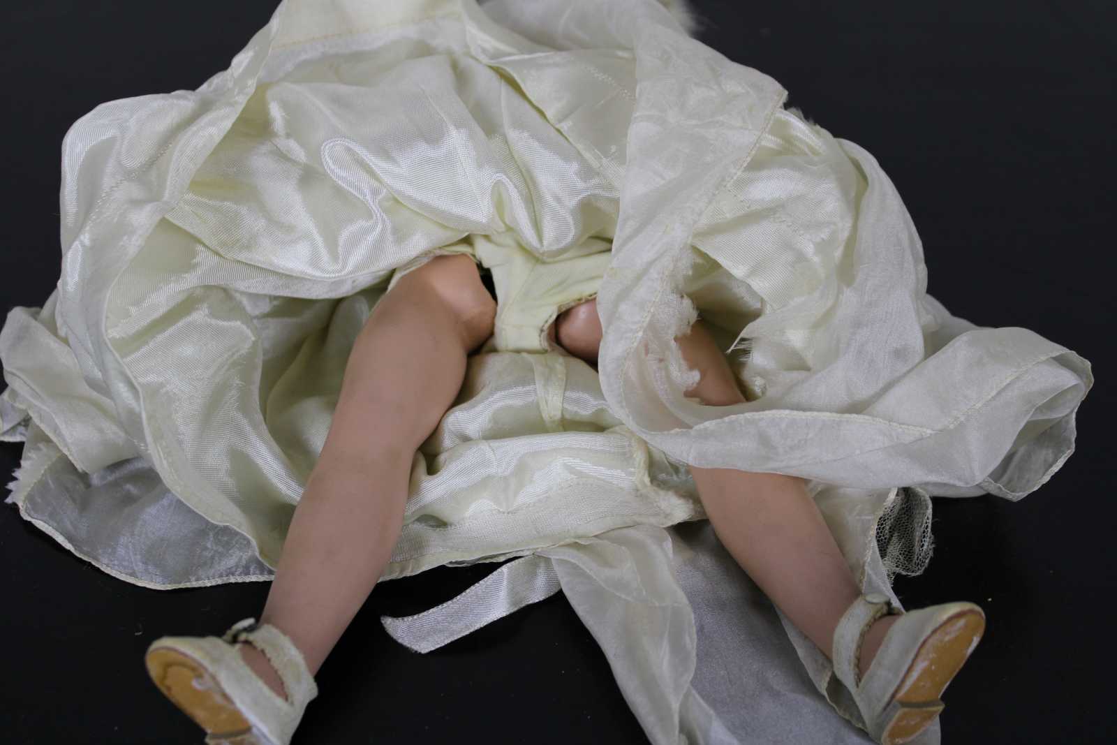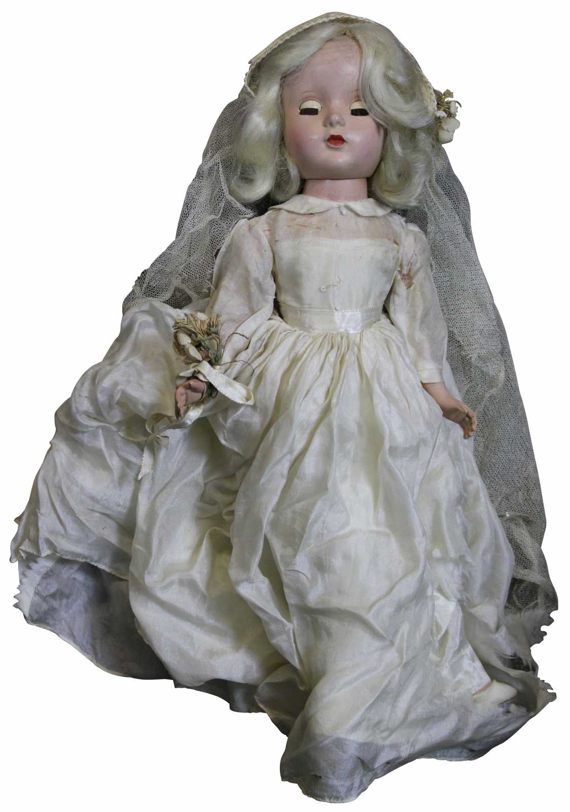 Vintage mid century Madame Alexander doll dressed as a bride with blonde hair, blue, sleep eyes, a cap veil and long sleeved chiffon gown.