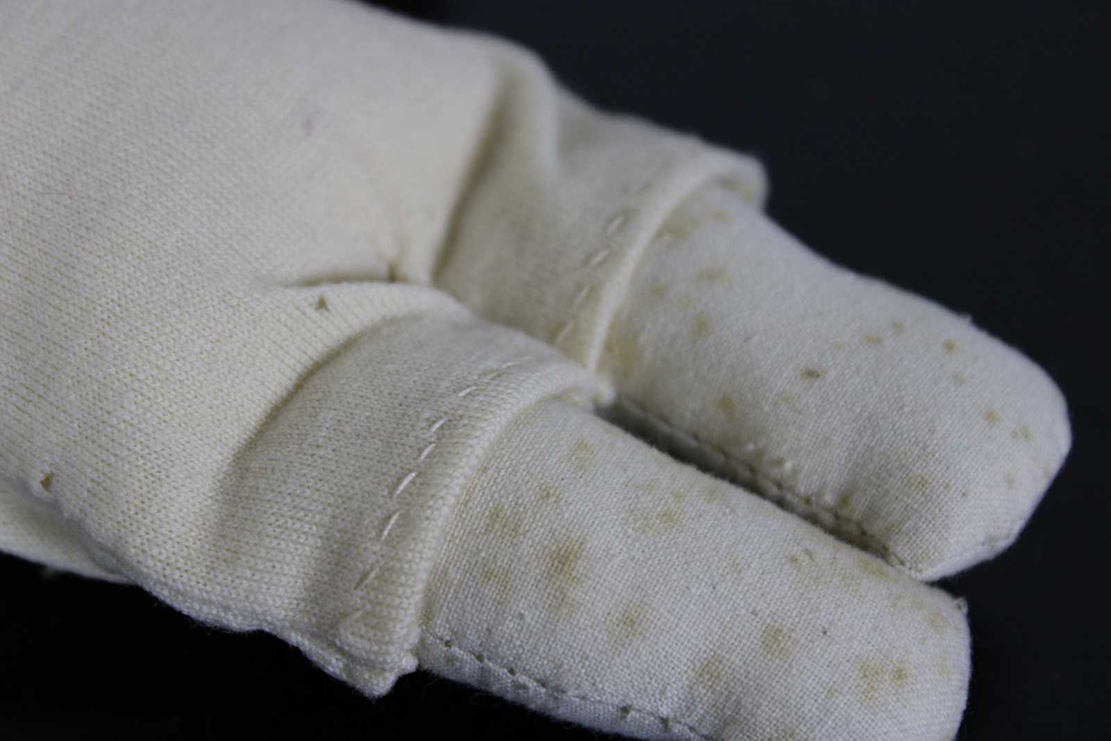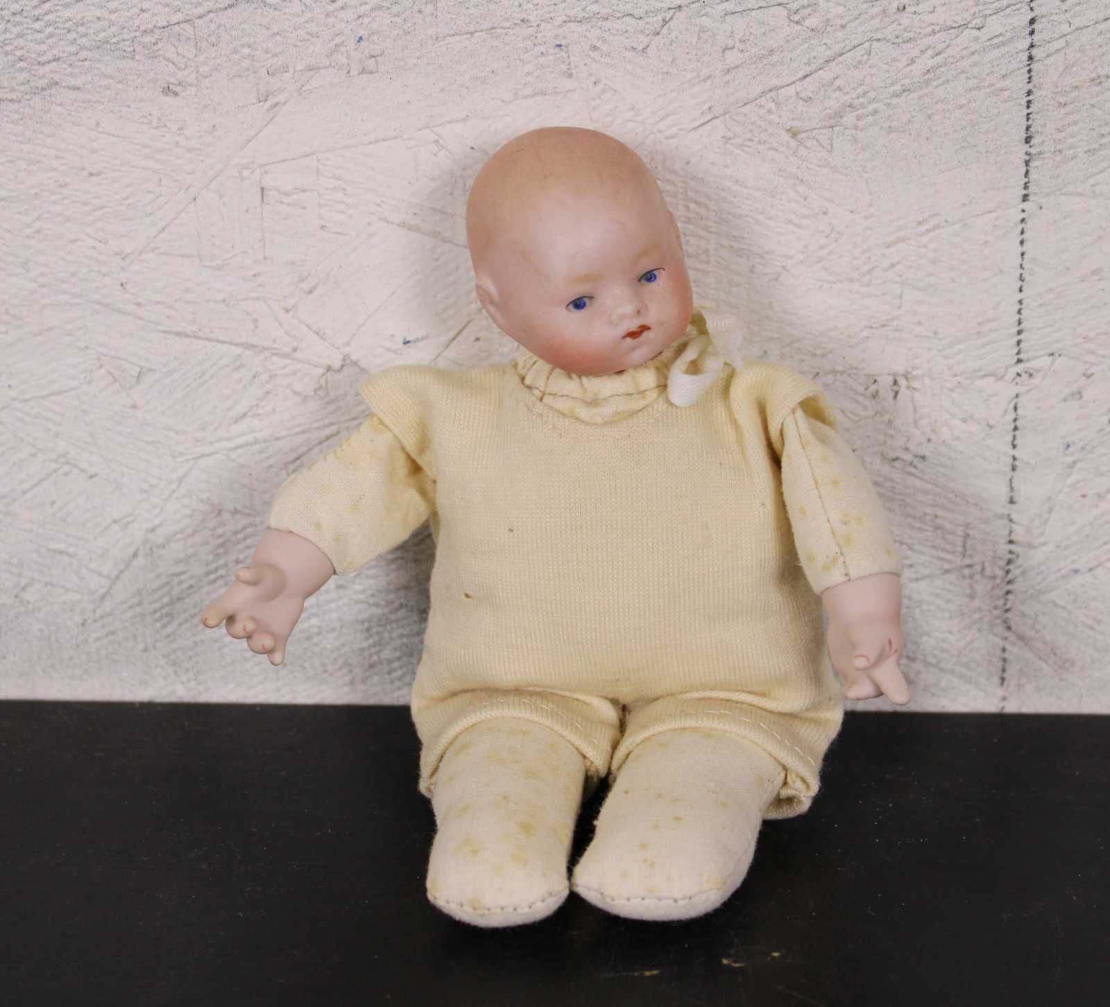 Antique Grace Putnam Bye-Lo baby doll with german bisque head and hands, cloth body, and painted features; dressed in long white gown and bonnet.