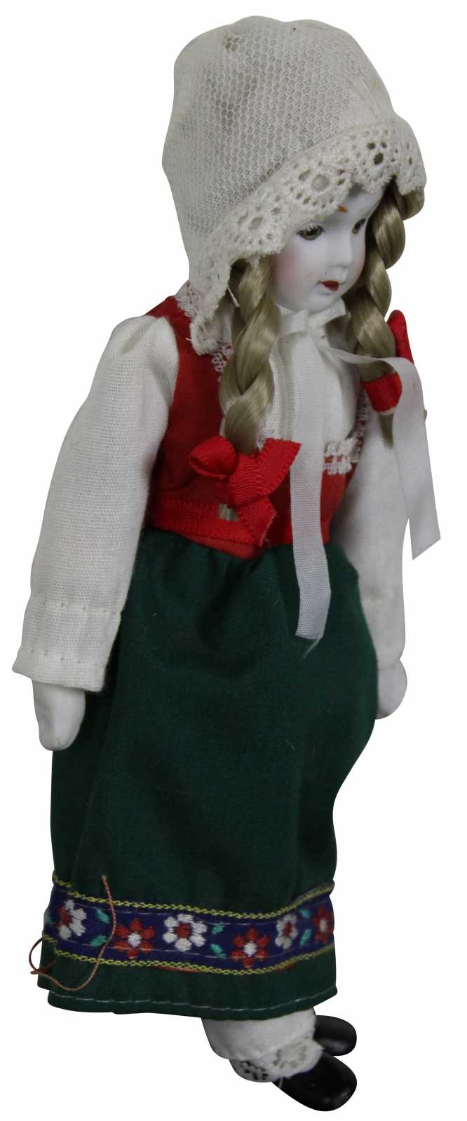 Vintage bisque doll with painted features, blonde hair on braids, dressed in a European traditional folk costume.