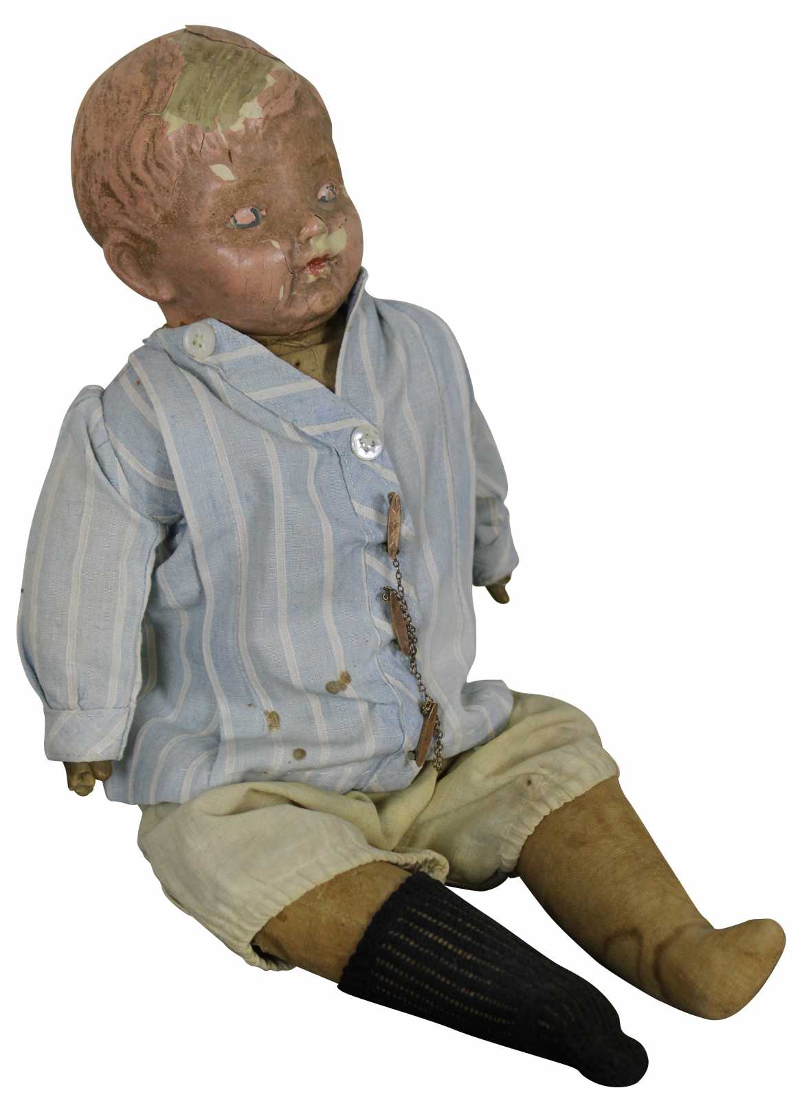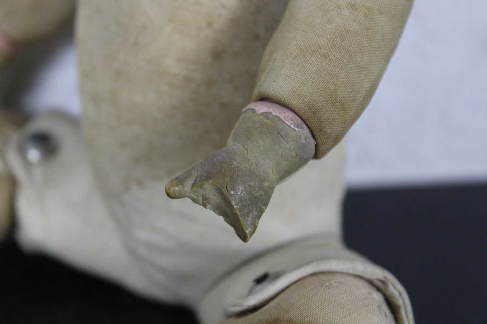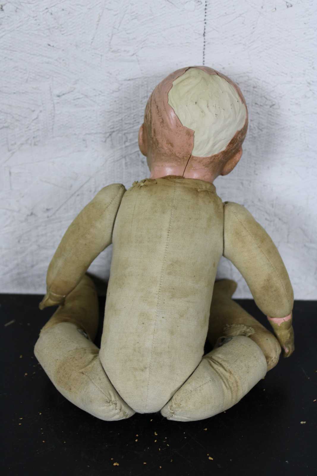 Fair Condition - Dirt/heavy chipping to head; missing fingers; stains/discoloration to fabric; split in leg; couple of patches; missing sock.