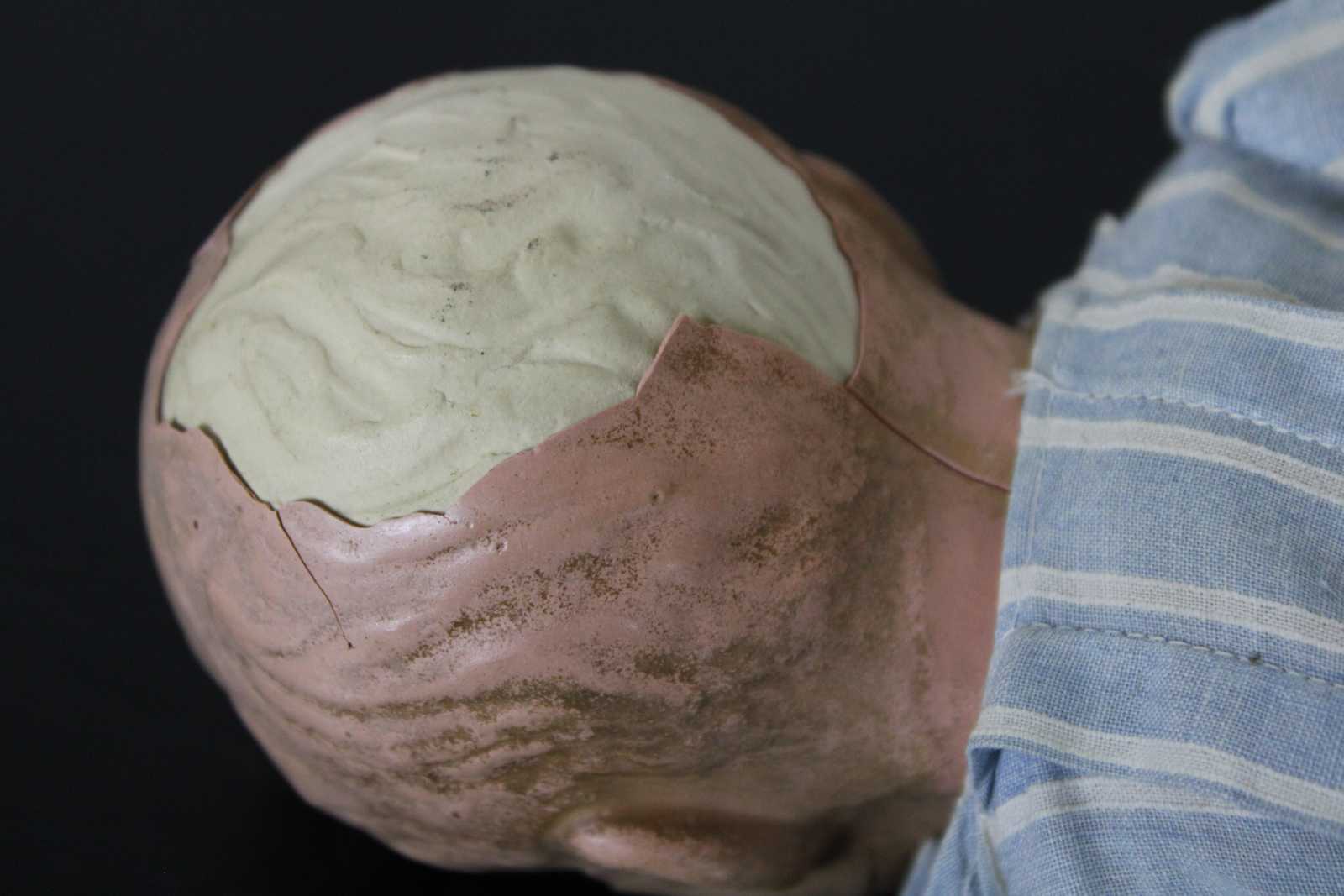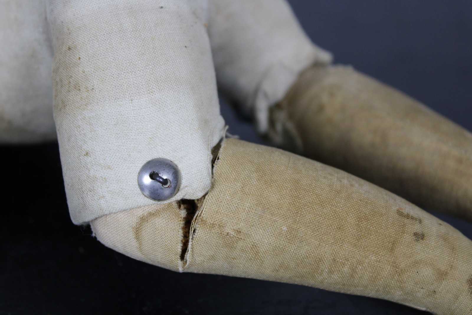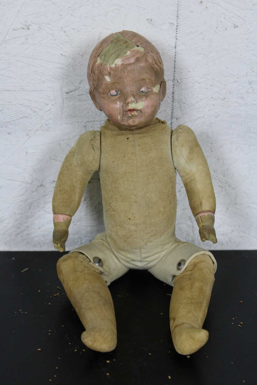 Fair Condition - Dirt/heavy chipping to head; missing fingers; stains/discoloration to fabric; split in leg; couple of patches; missing sock.
