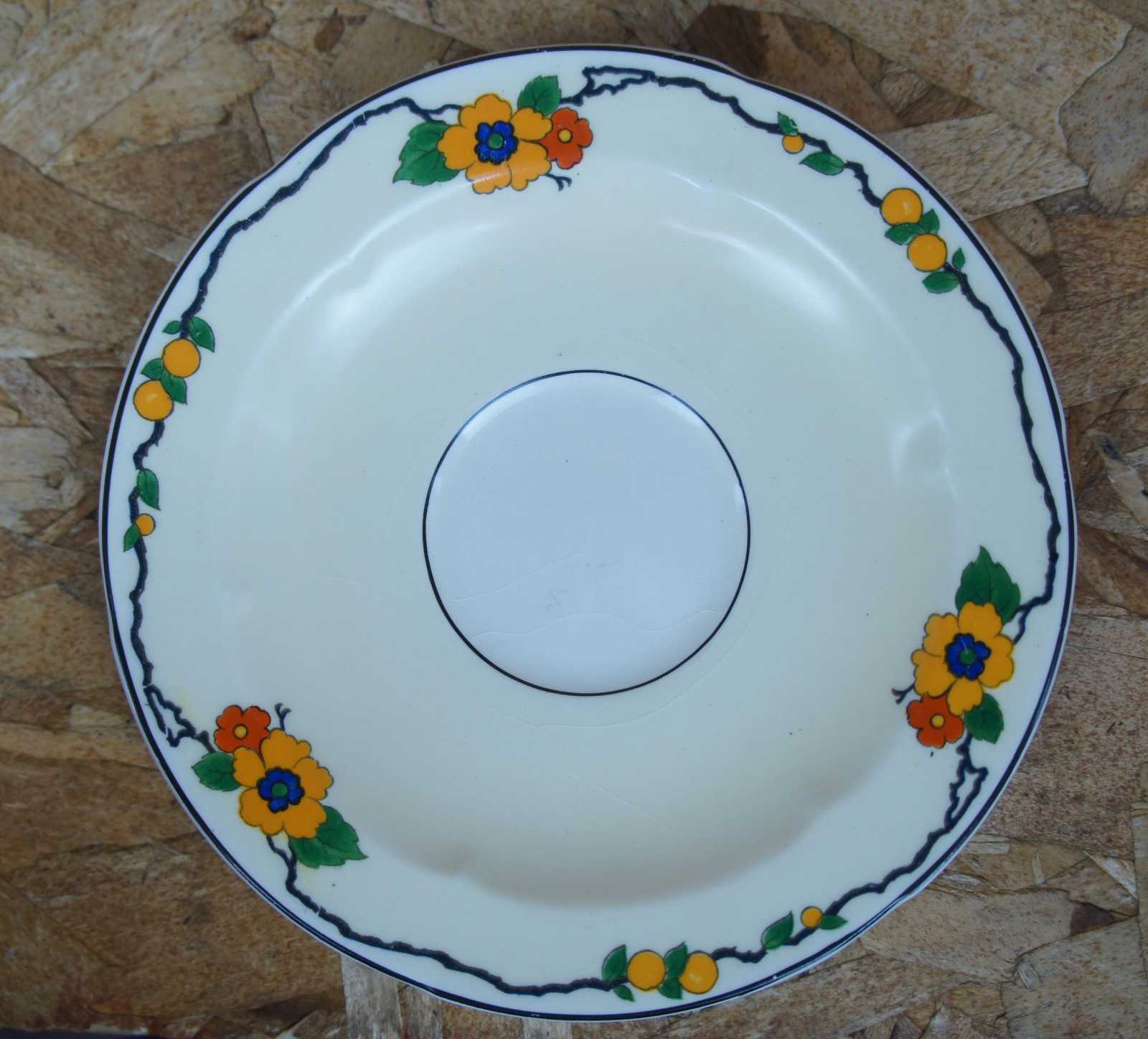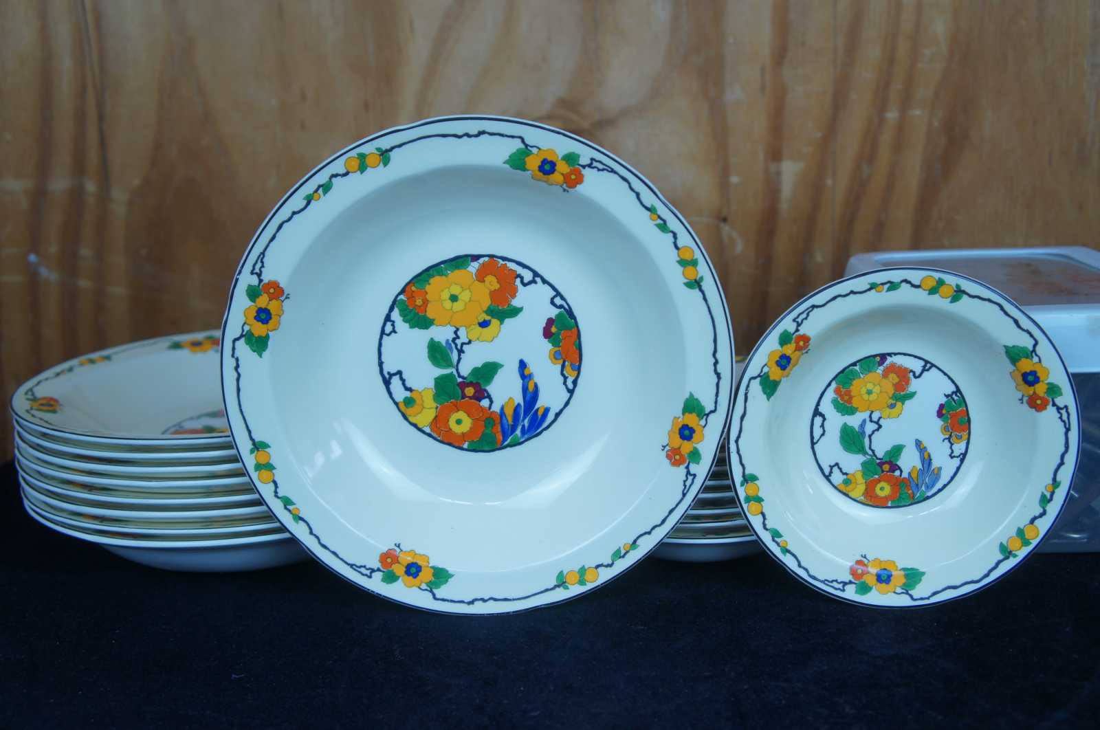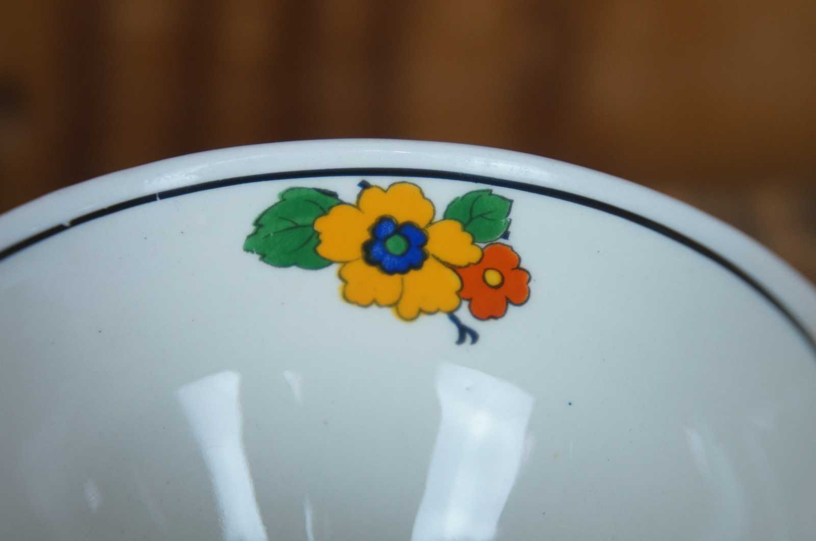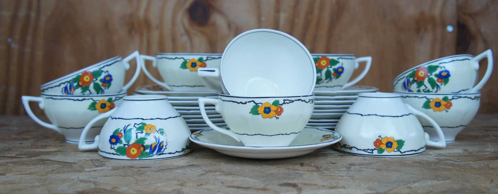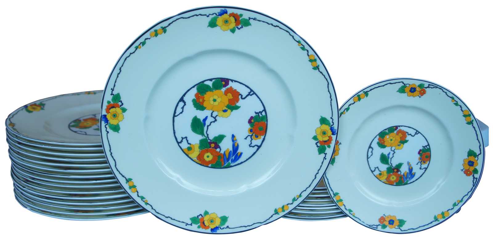 Rare antqiue English eighty five piece china tea / coffee and dinnerware set by W.H. Grindley & Co Ltd featuring Art Deco styling with vibrant Ivory flowering pattern of yellow, green orange / red, blue and purple. Circa 1920s.