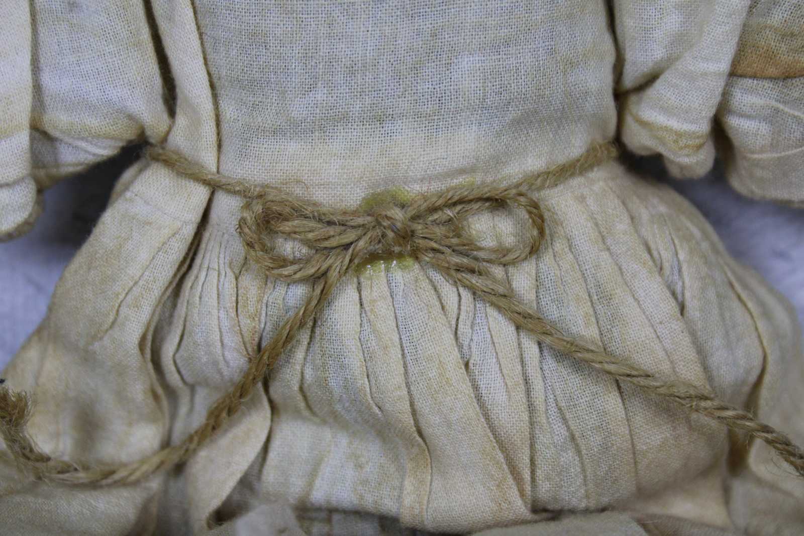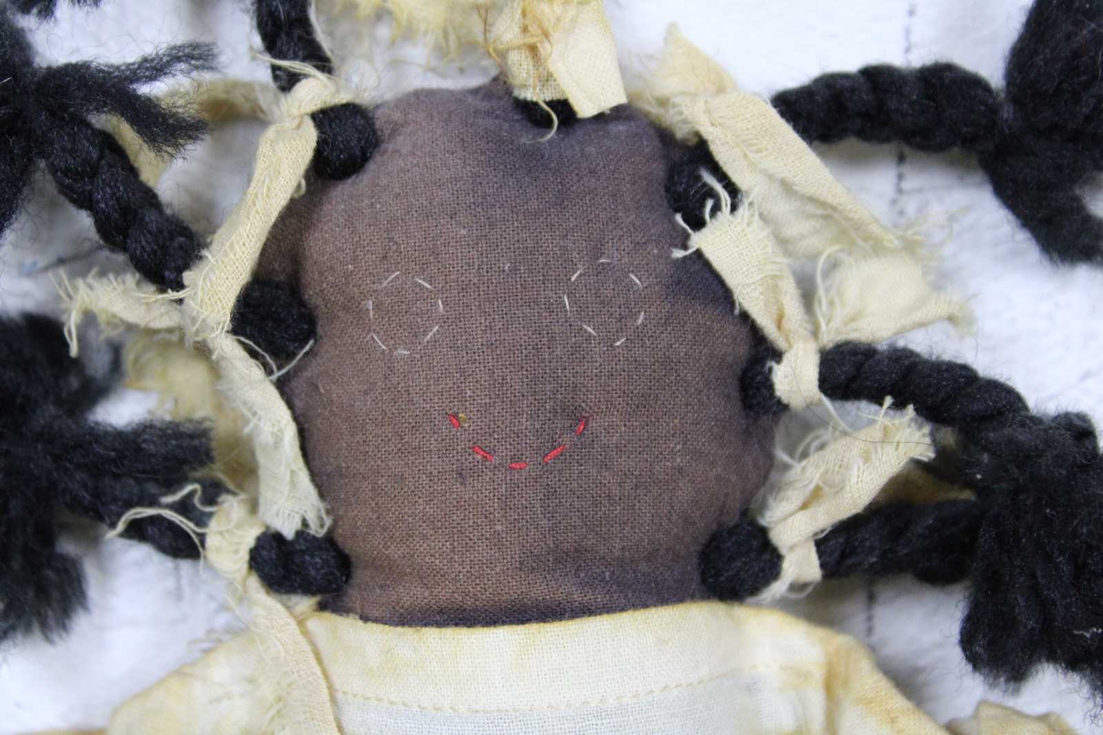 Antique African American folk art style rag doll with hand stitched features, braided hair and a simple 19th century dress.