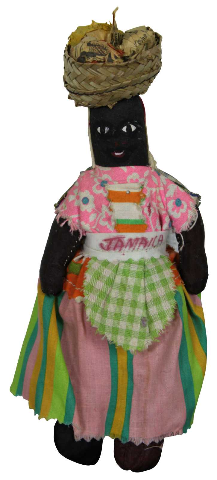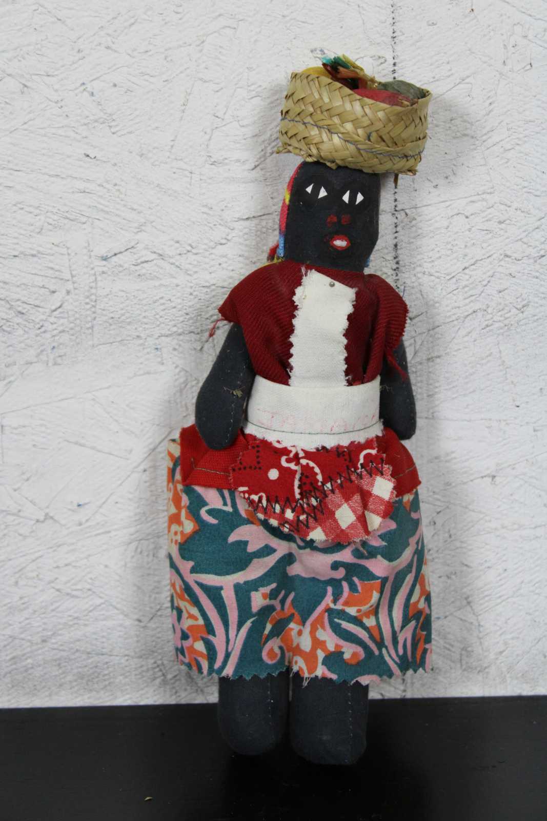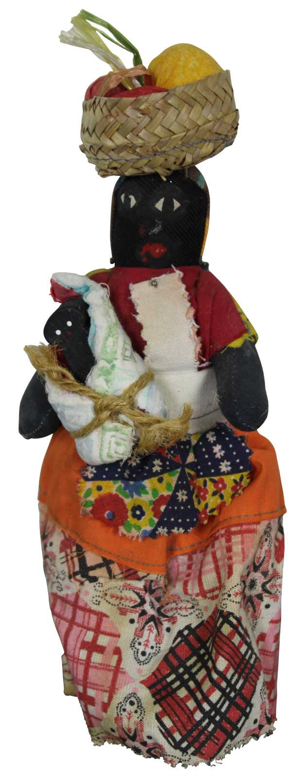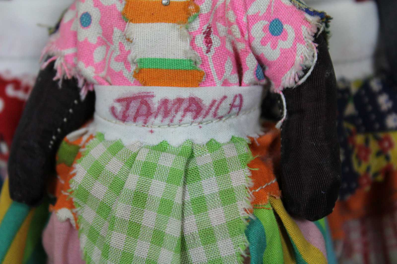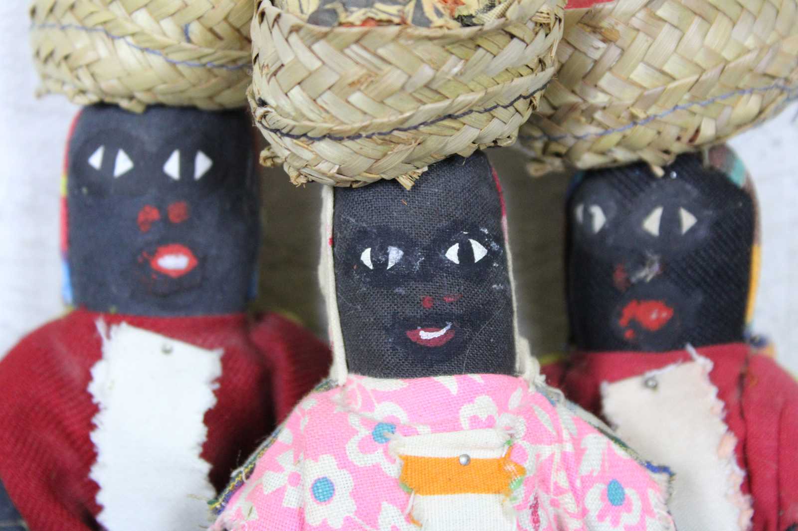 Lot of five vintage Jamaican folk art cloth dolls, three dressed in bright cotton prints with baskets on their heads, one small wooden infant figure, and one wood and cloth doll ornament.