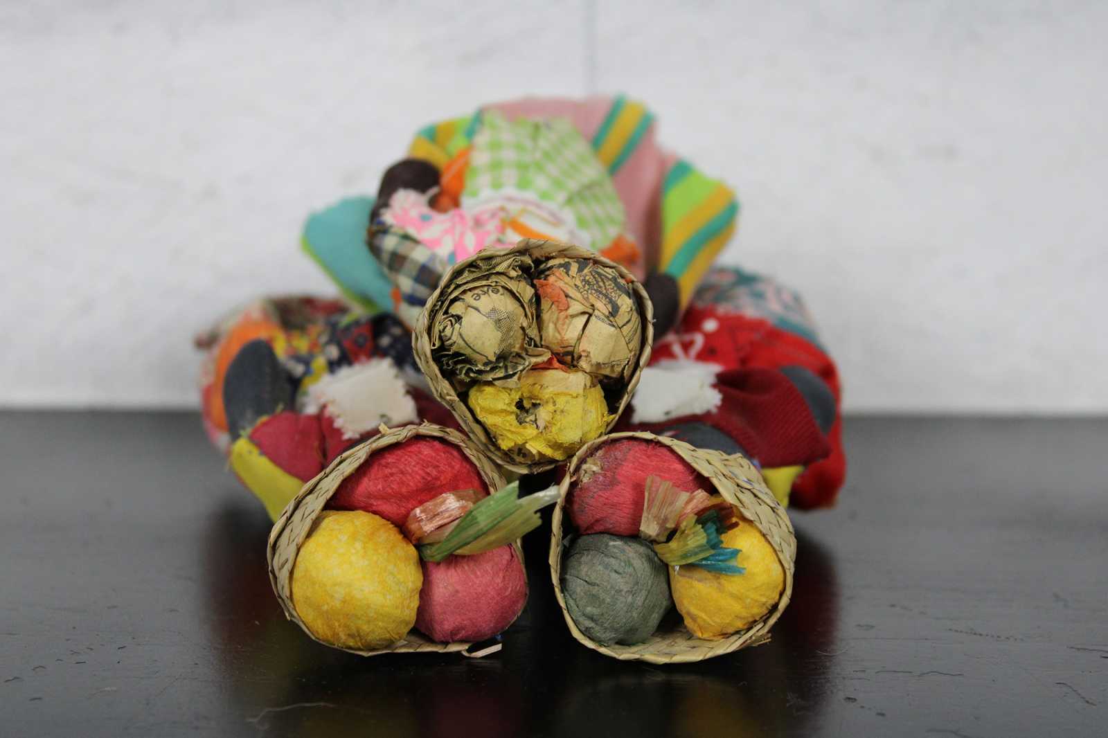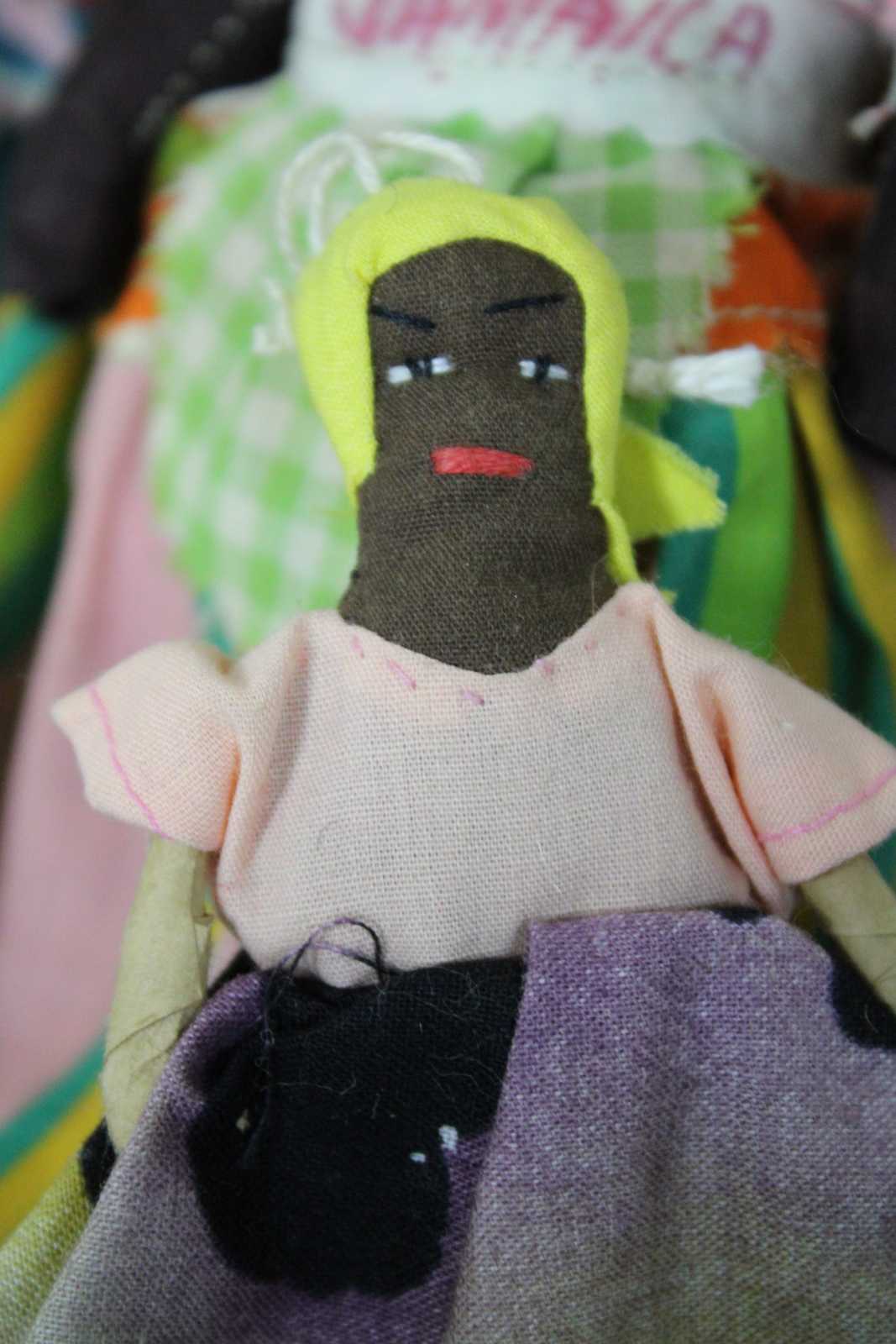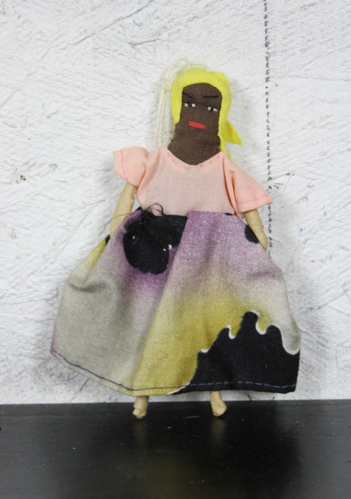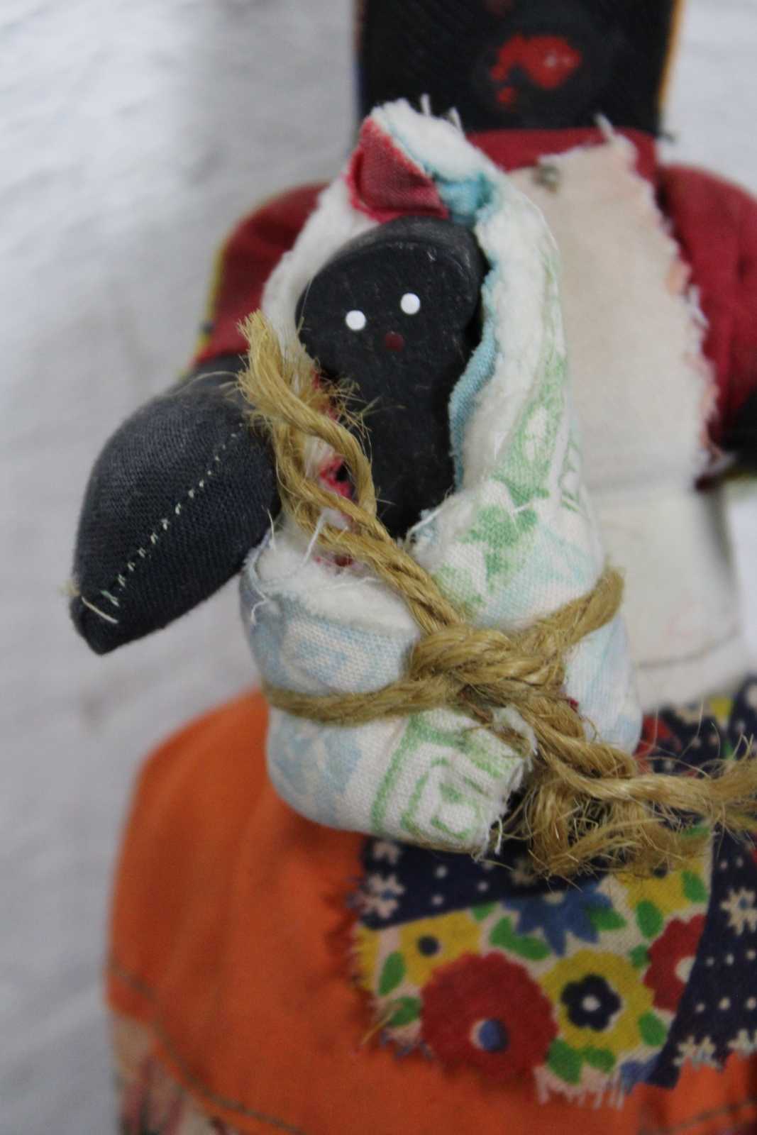 Lot of five vintage Jamaican folk art cloth dolls, three dressed in bright cotton prints with baskets on their heads, one small wooden infant figure, and one wood and cloth doll ornament.