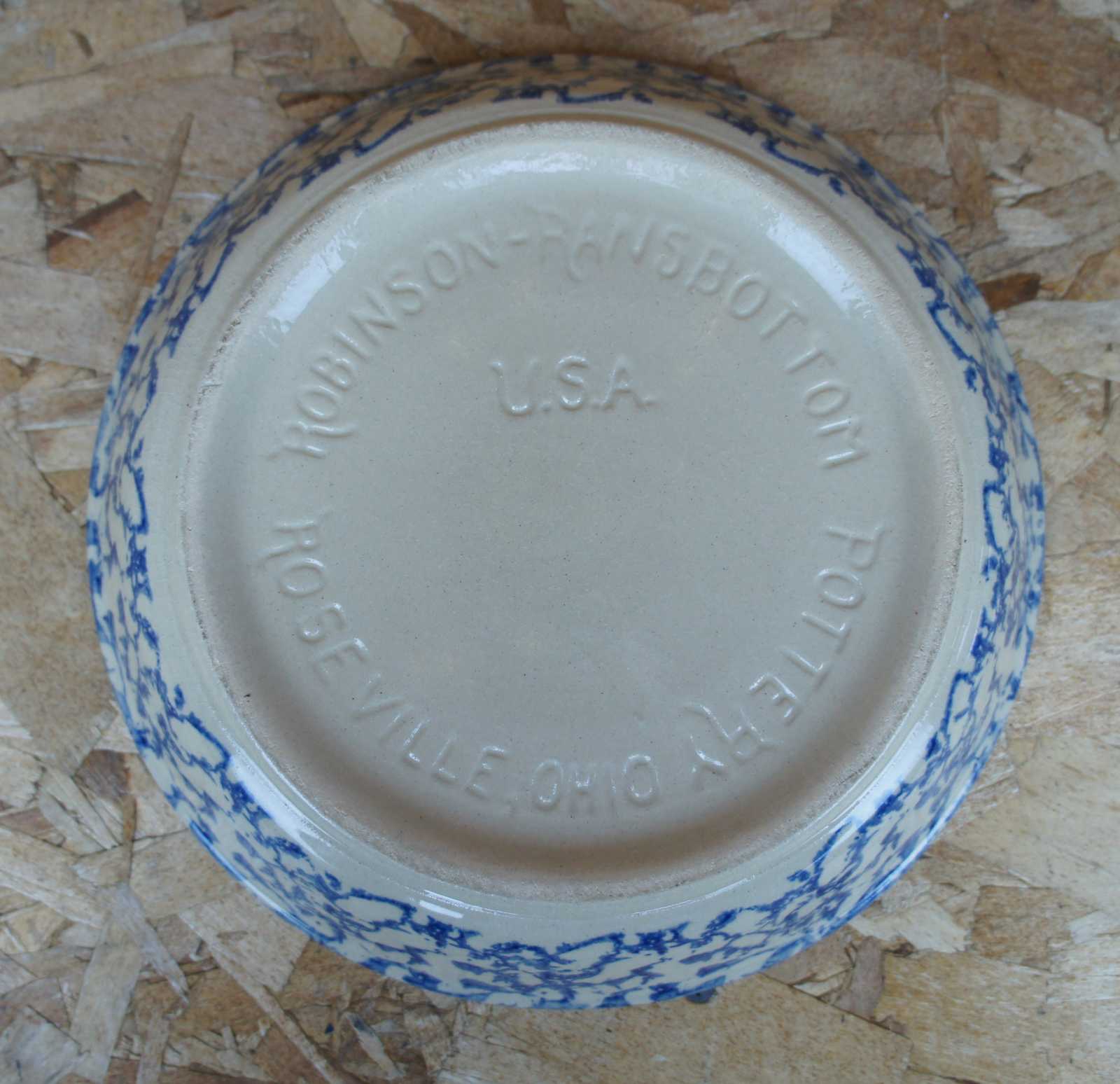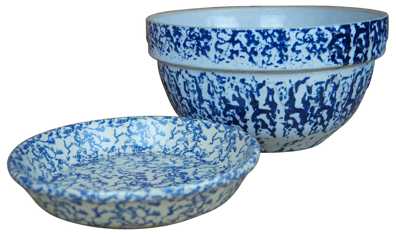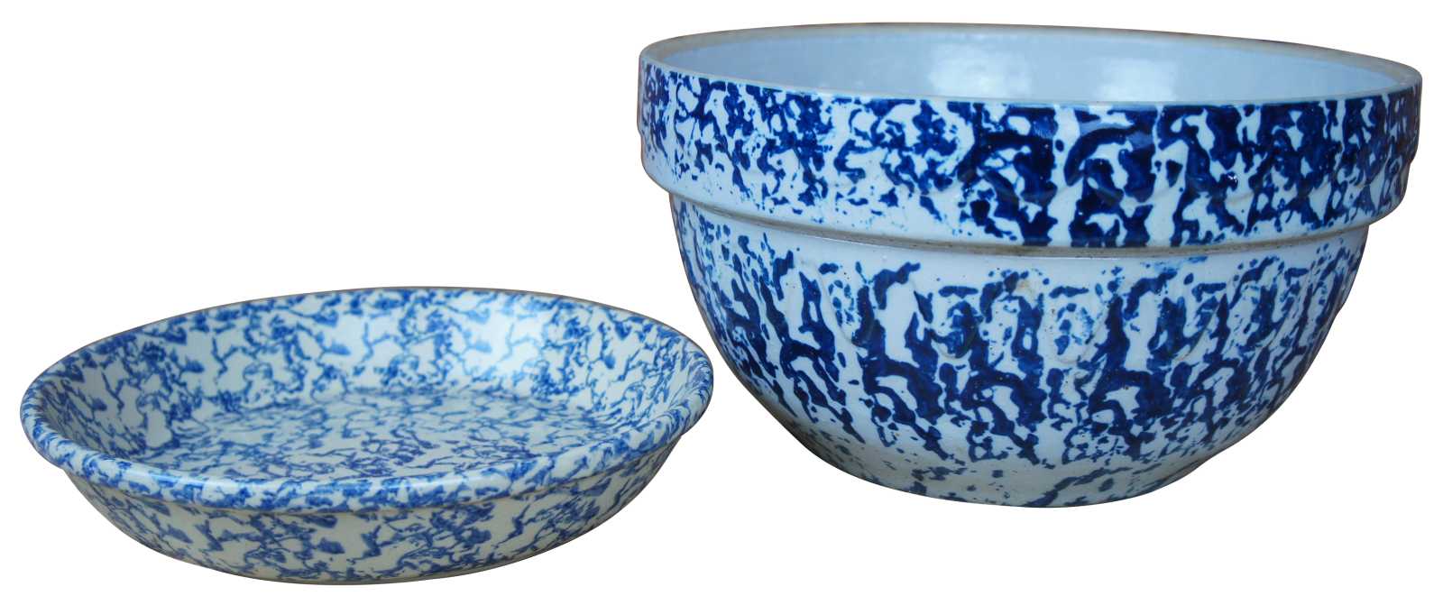 Two vintage spongeware pottery serving / mixing bowls. Attributed to Robinson Ransbottom Pottery of Roseville Ohio, RRP USA.