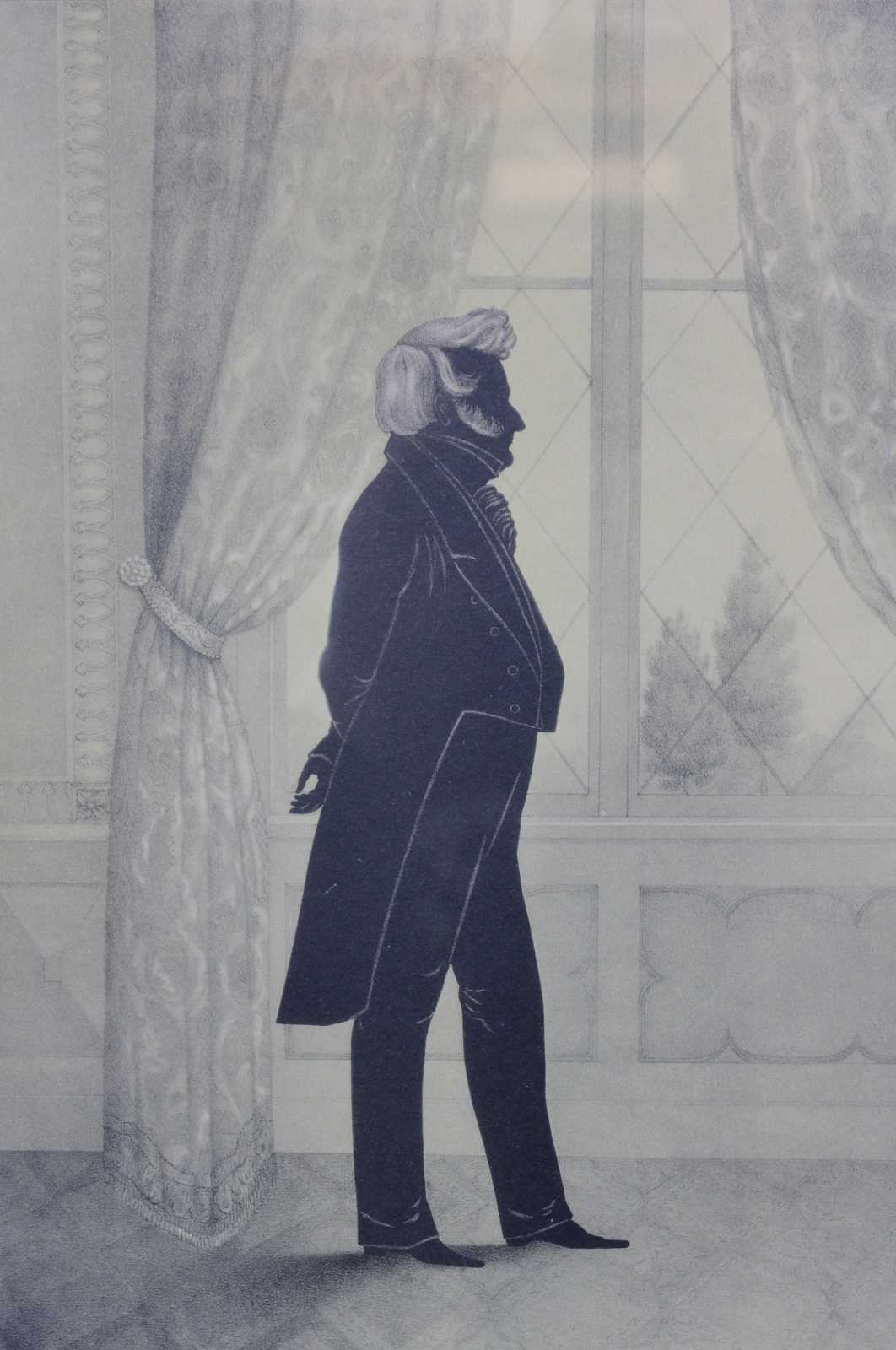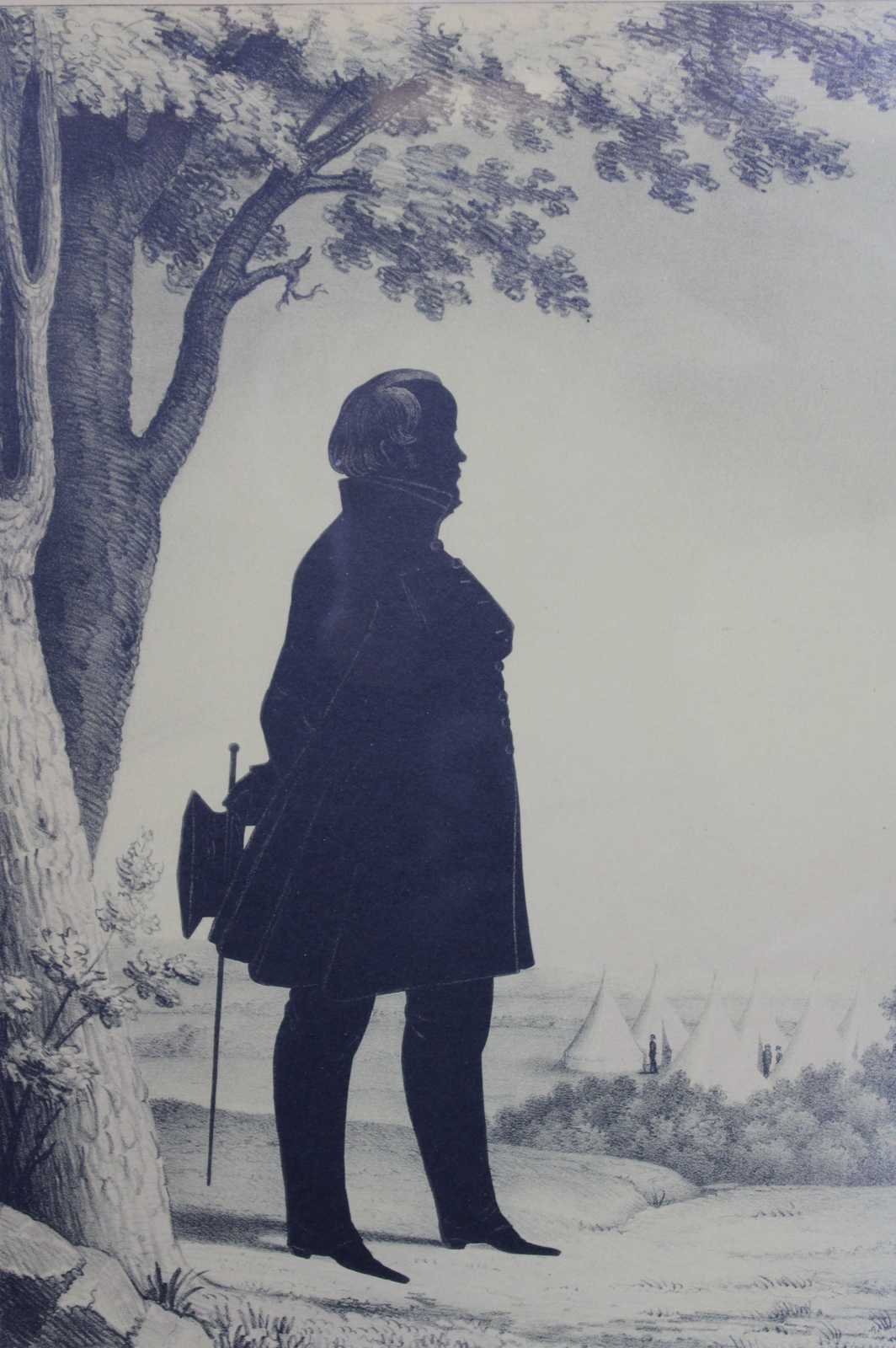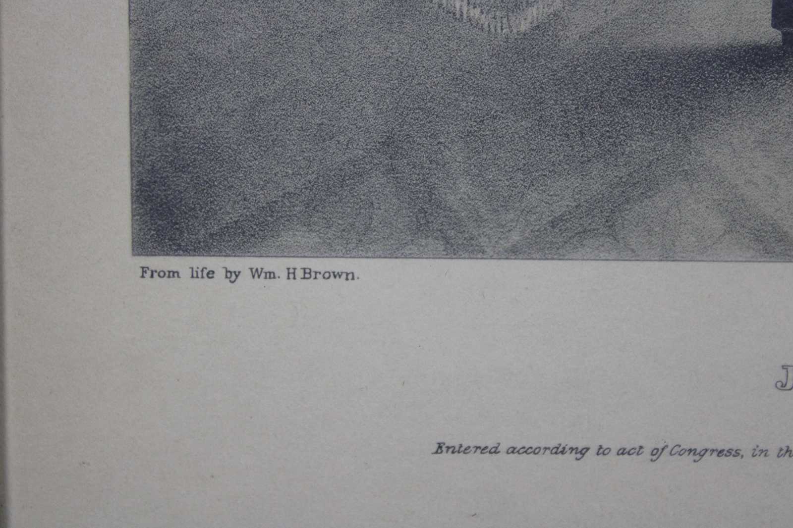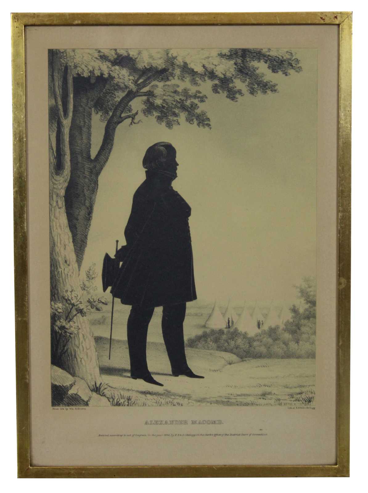 William Henry Brown and his wife, Emmaline, left Philadelphia around 1859 and settled in a small railraod community of Saxton near Altoona, PA. He had gone there to work on the railroad, since photography had put him out of work. By 1865 he had moved to Erie, PA and was married to Margaret Horrell. They had two sons. She died shortly thereafter and he moved to Wilcox near Kane, PA. Later he lived with a niece in Georgia then married a third time to Sarah Conrad. After her death he returned to South Carolina. Connecticut Historical Society still has the 6 foot silhouette of the ""Dewitt Clinton"" locomotive he had done in 1831. They also have 14 prints he gave them in 1853 of silhouettes that are not part of the Portrait Gallery. A traveling artist, William Brown was a portrait painter and silhouettist, whose subjects were distinguished persons, especially in Philadelphia, New England, and Charleston. Brown was especially noted for a series titled ""Portrait Gallery of Distinguished Americans"", published in 1846 as a book of lithographs from his full-length silhouettes. Also included were biographies of the subjects.