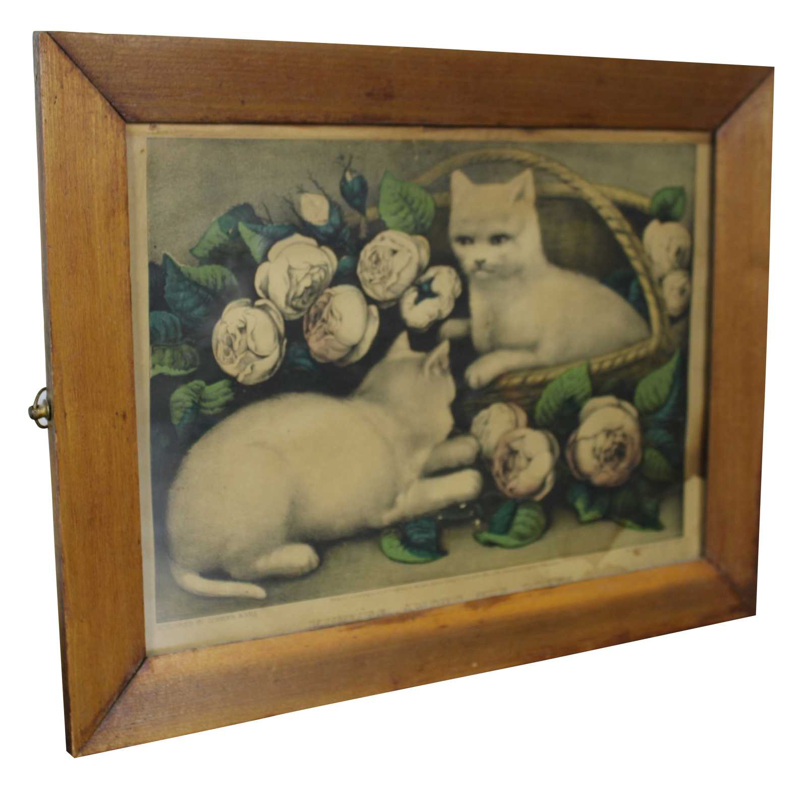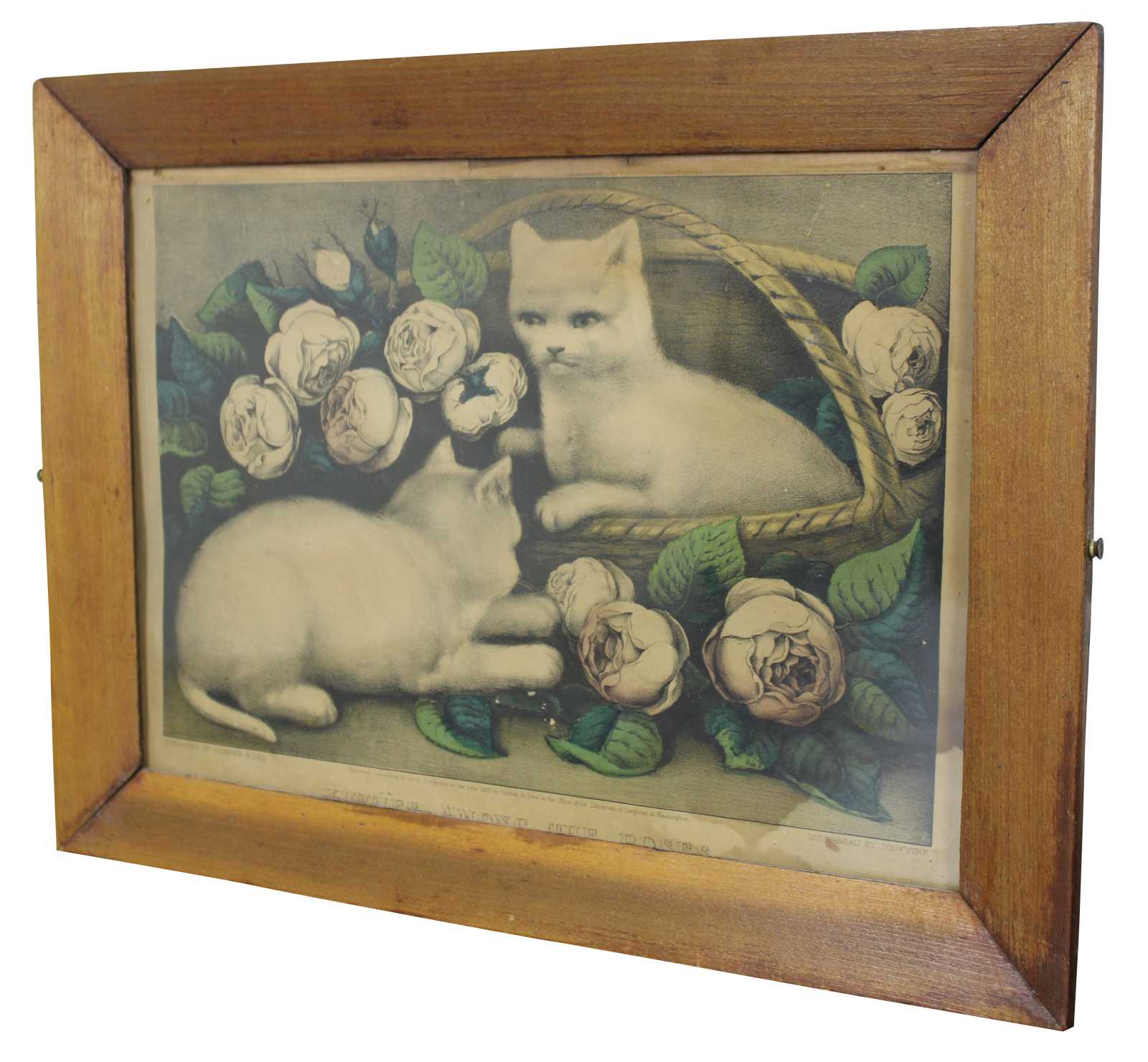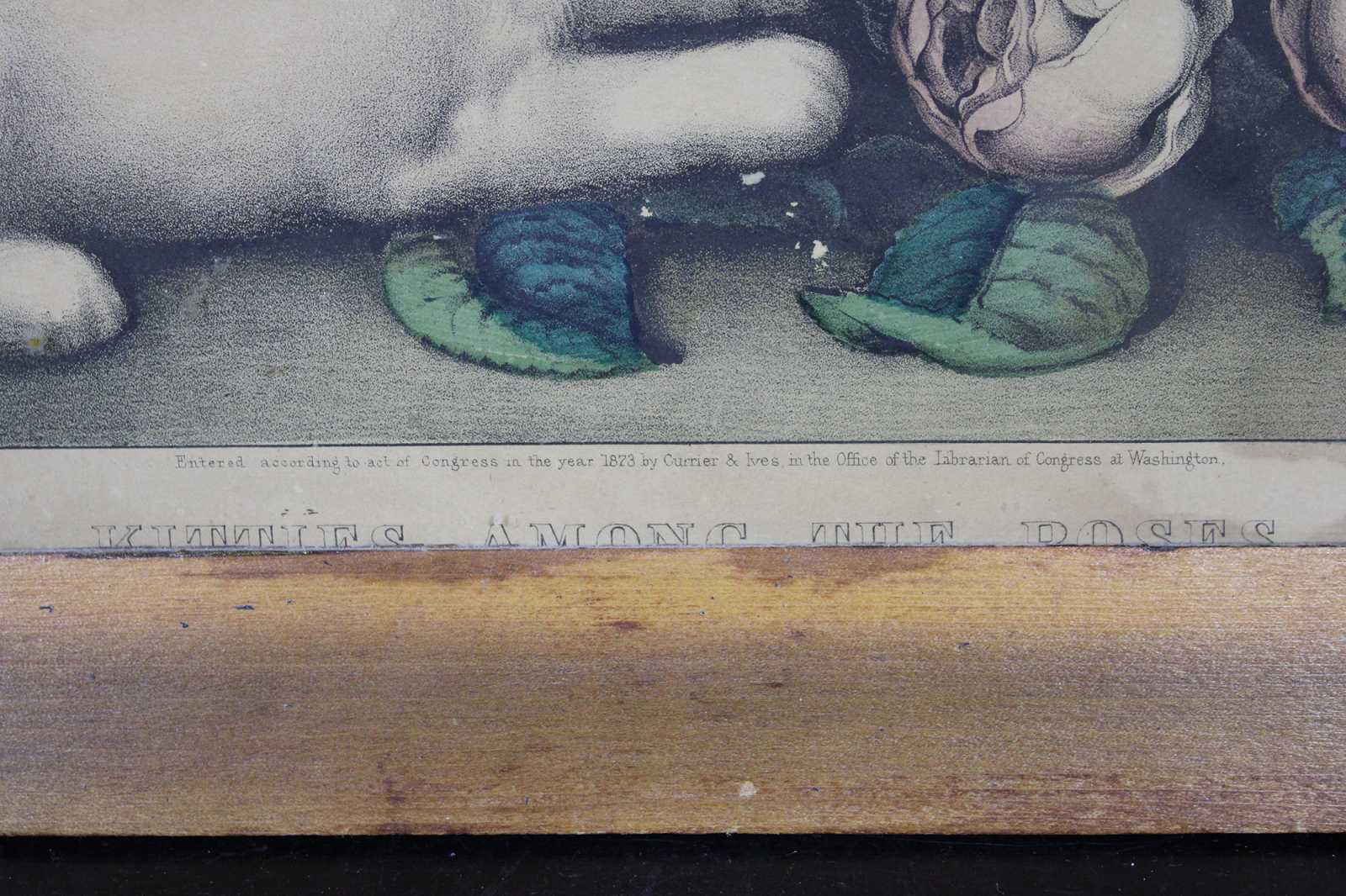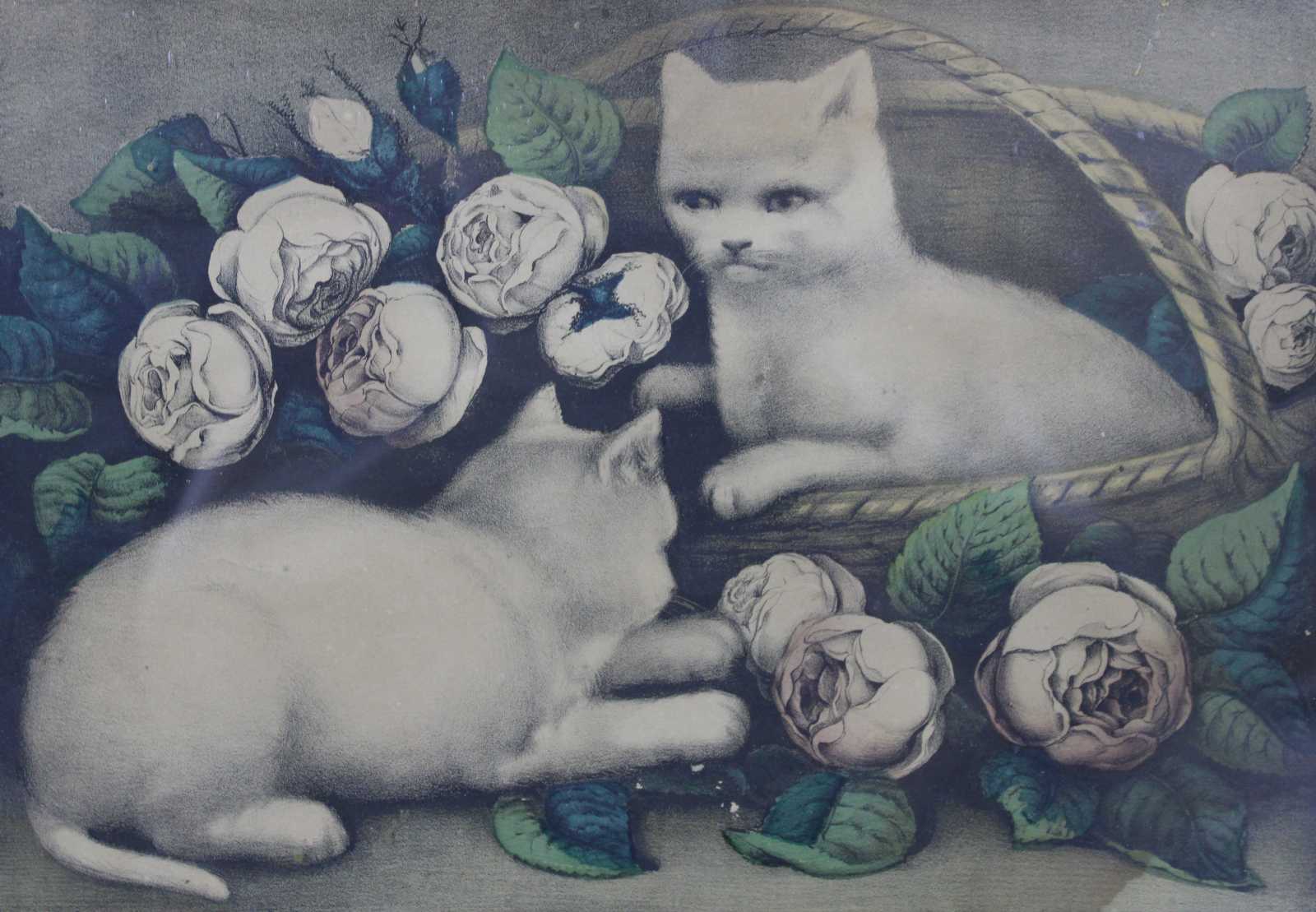 Antique 1870s Currier & Ives colored lithograph print titled “Kitties Among the Roses.” Kittens, cats.