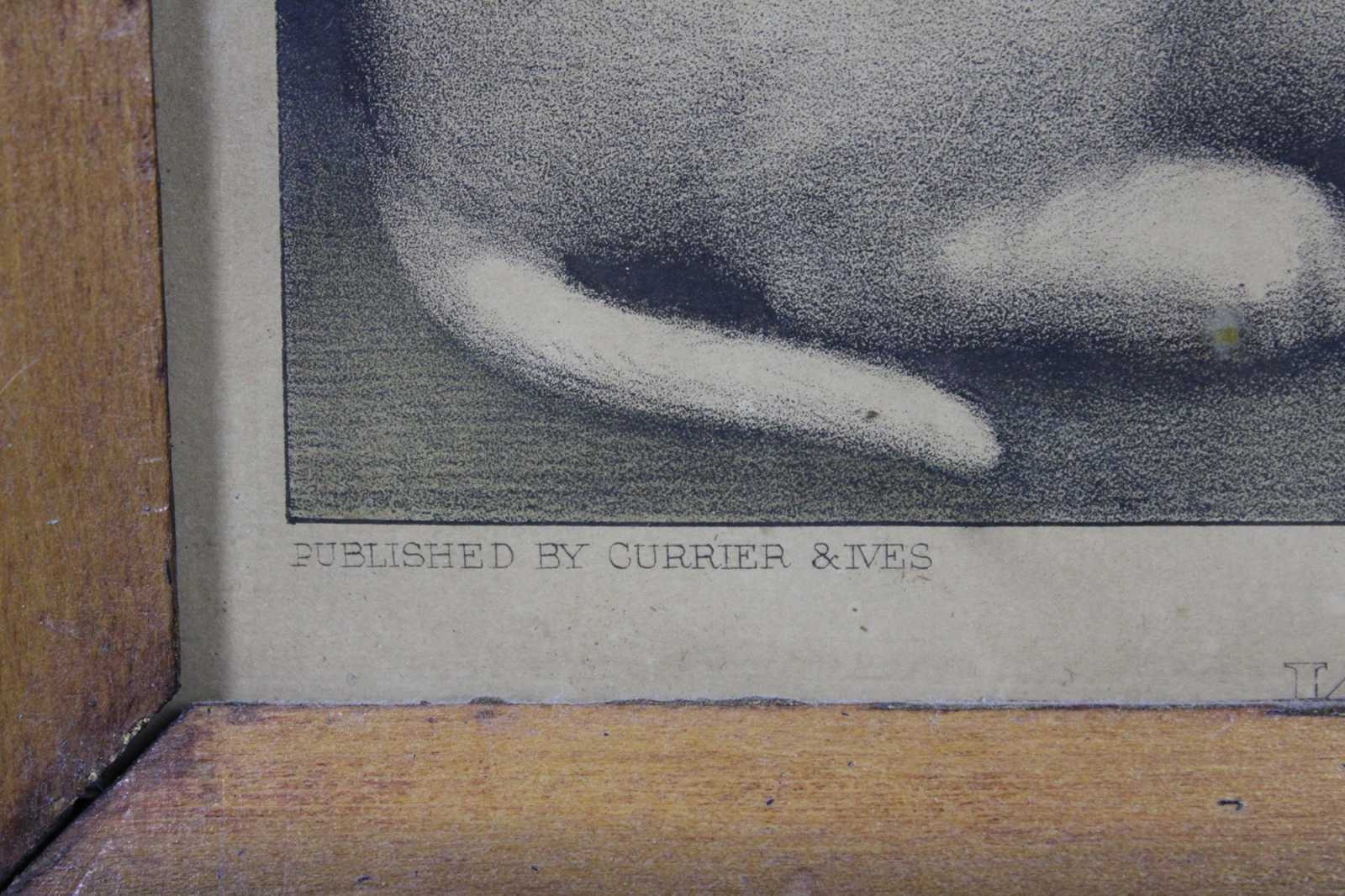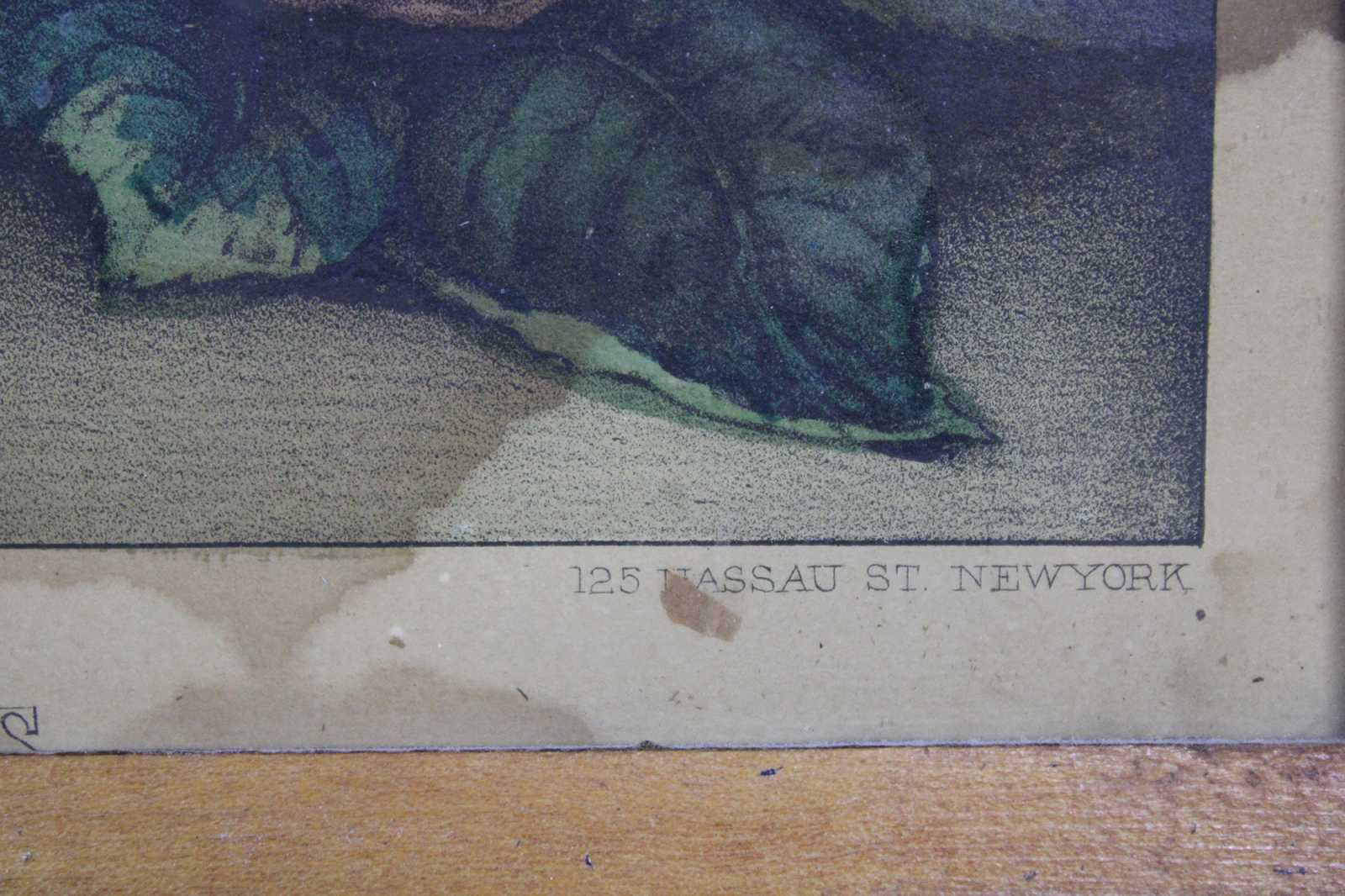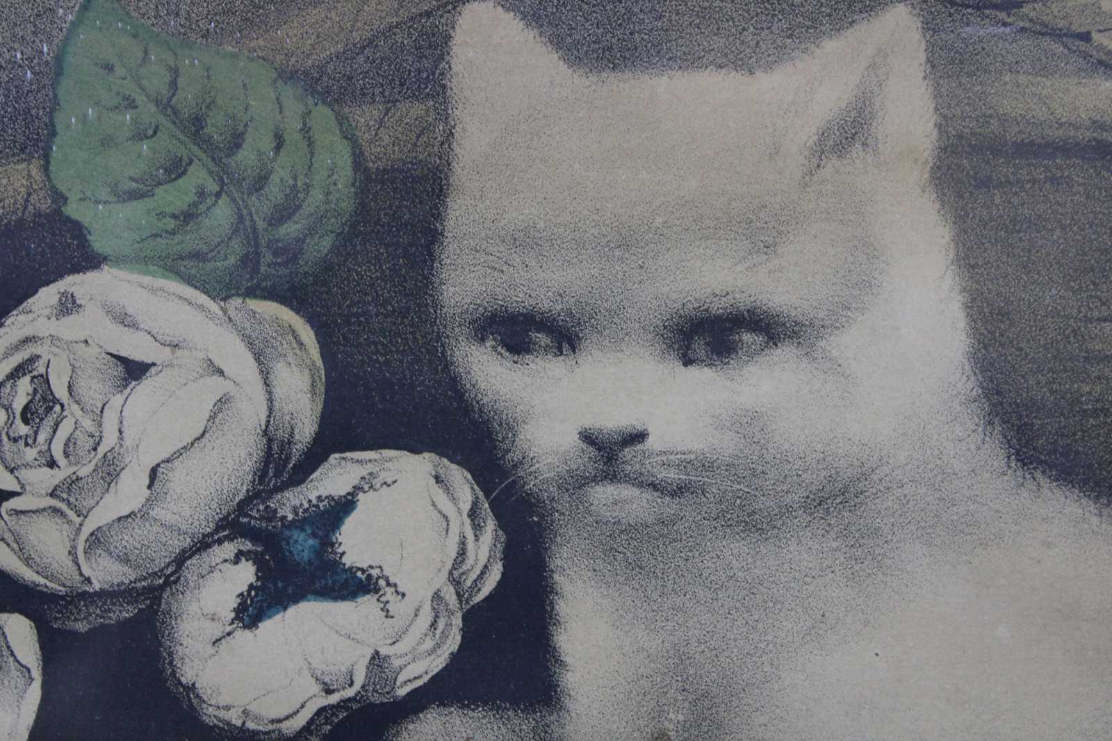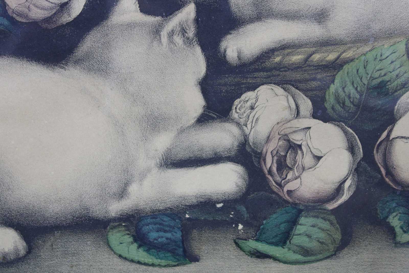 Antique 1870s Currier & Ives colored lithograph print titled “Kitties Among the Roses.” Kittens, cats.