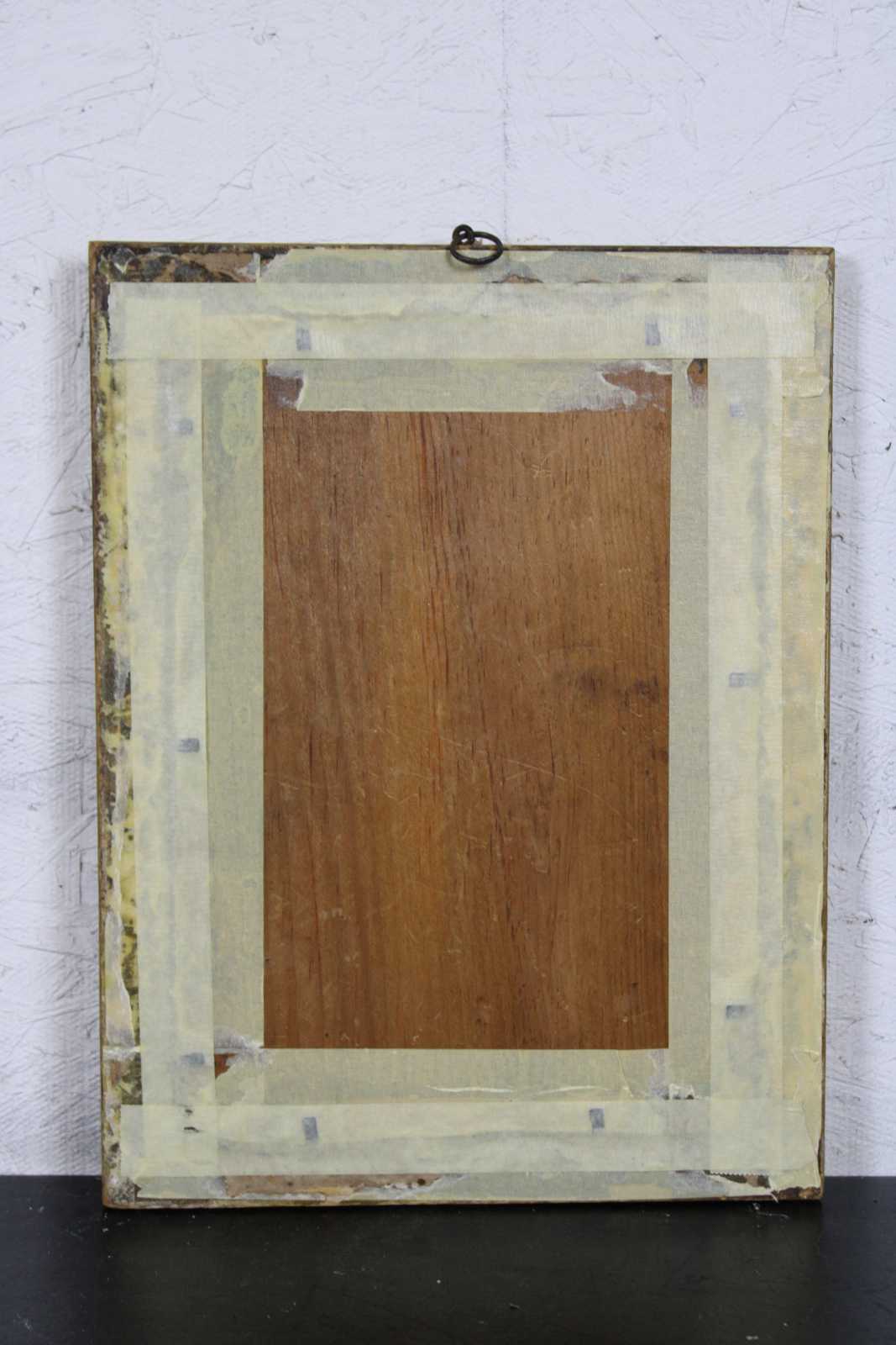 Antique pencil and watercolor portrait painting of a young boy in a blue dress and pants standing by a table with book in hand.