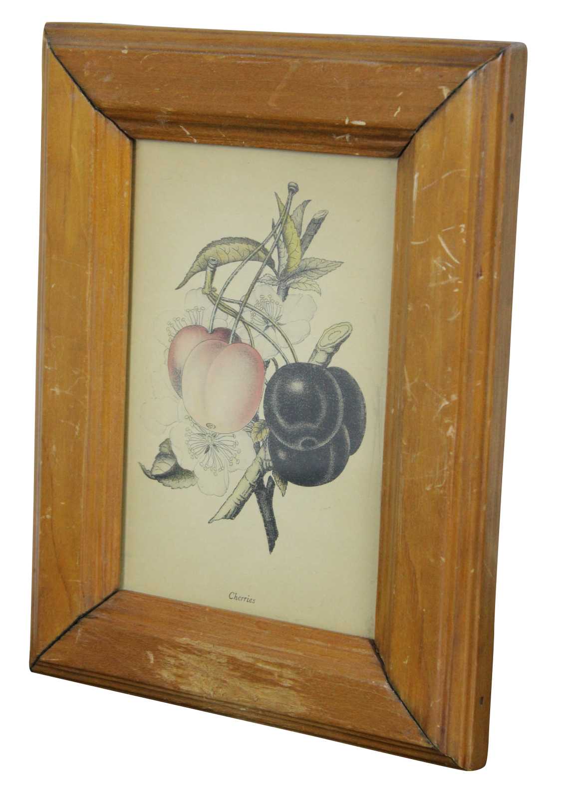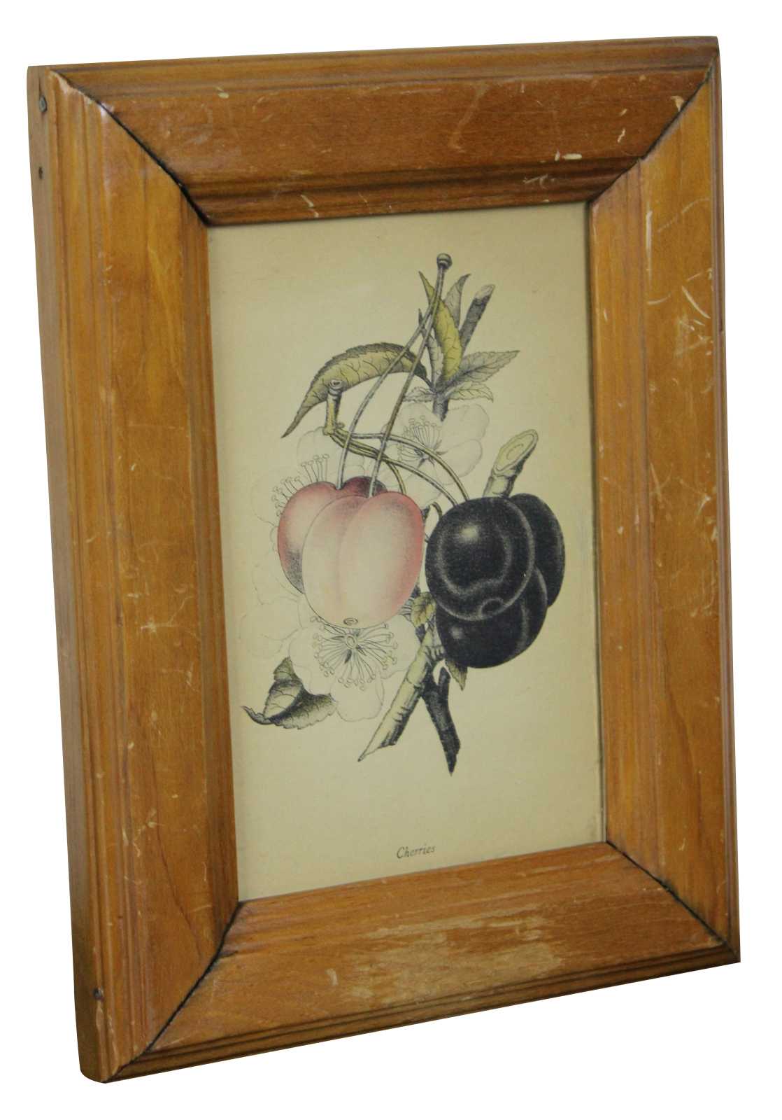 Antique botanical lithograph print of a branch of cherries.