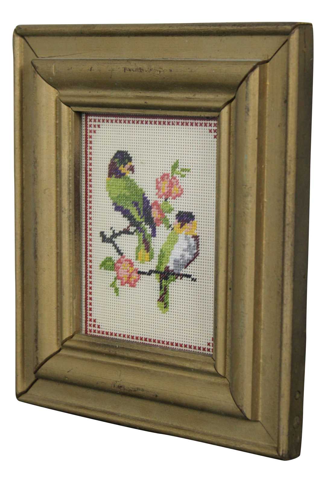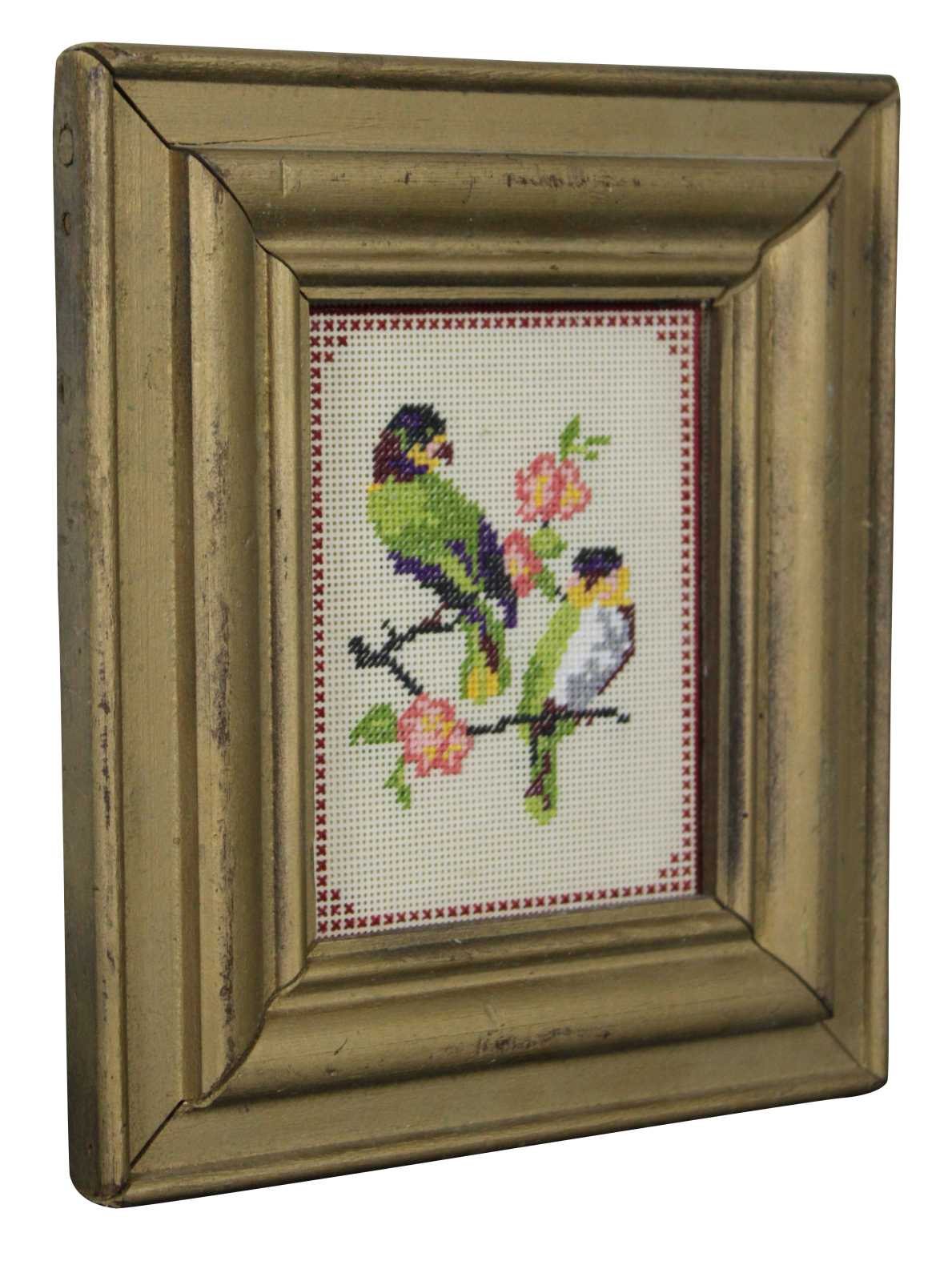 Antique cross stitched tableau of two parrots on a flowering branch.