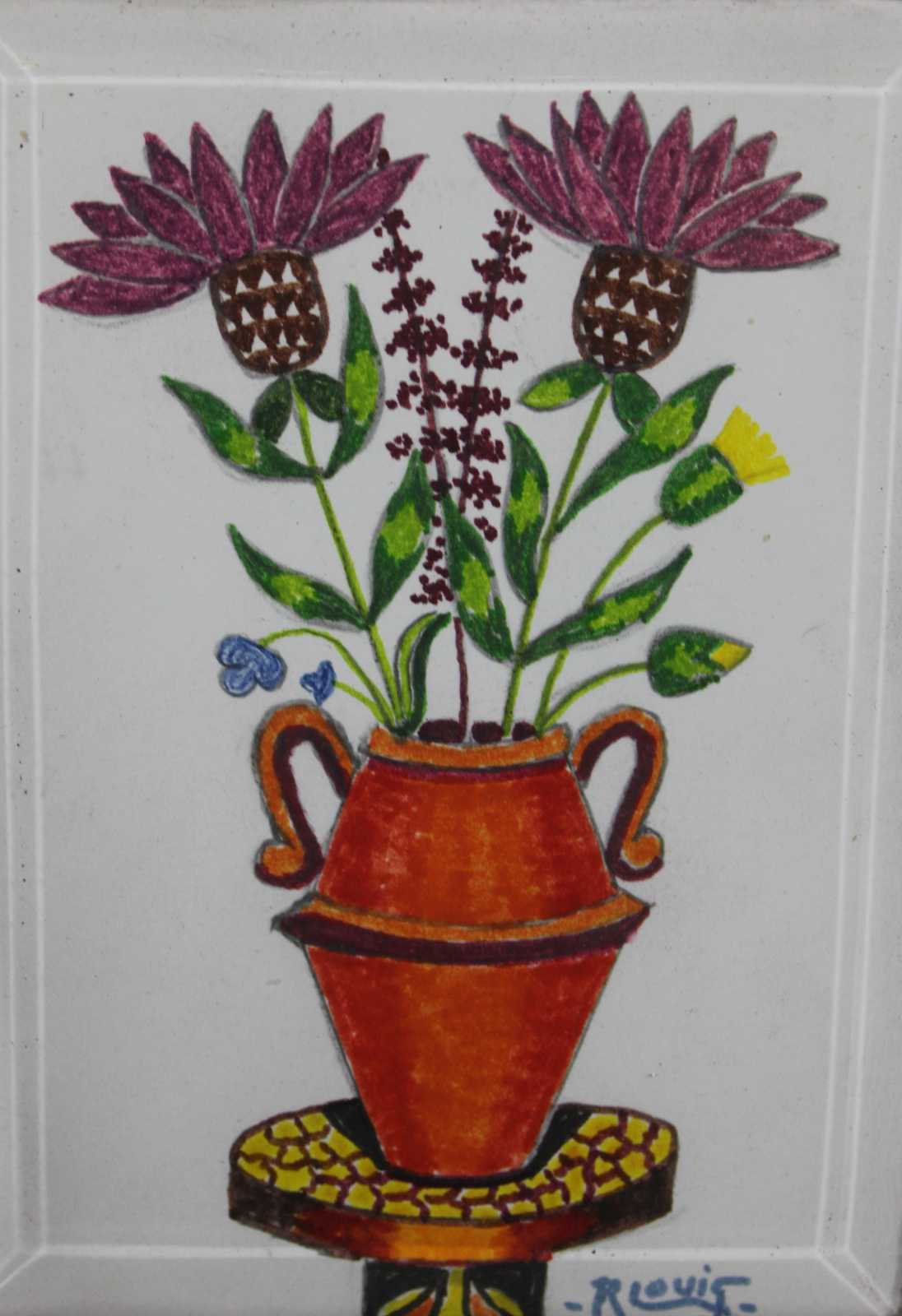 Antique still life painting of flowers in an orange vase, signed R. Louis. Beautifulyl framed in a desktop or wall setting with a black finish and brass accents.
