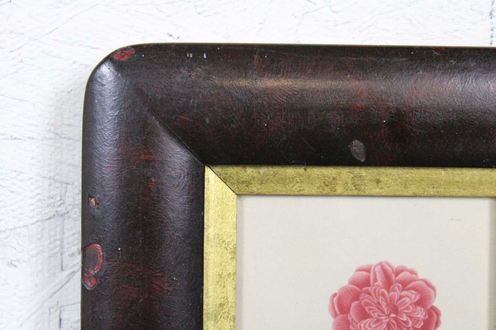 Antique small scale botanical engraving of a pink Camellia Anglica by J.J. Jung. “Camellia Anglica (Vers.)” From N. Remond’s Iconographie Du Genre Camellia ou collection des Camellias les plus beaux et les plus rares peints d’après nature dans les serres de Mr. l’Abbé Berlese par J.J. Jung. Paris, 1839-43. Stipple and line engraving by Oudet.” “Produced from 1839—1843 by Lorenzo Berlèse (1784—1863), the greatest 19th-century scholar on the subject of camellias, Iconographie du Genre Camellia comprises 300 partly hand-colored plates. Engraved by Dumenil, Gabriel and Oudet and printed in Paris by N. Rémond, the subtlety and coloring of these plates is comparable in many ways to Redouté’s Les Roses. Beautiful in groupings of four, six, or eight images, the camellias vary in color from ruby red to pink, white, and variegated.