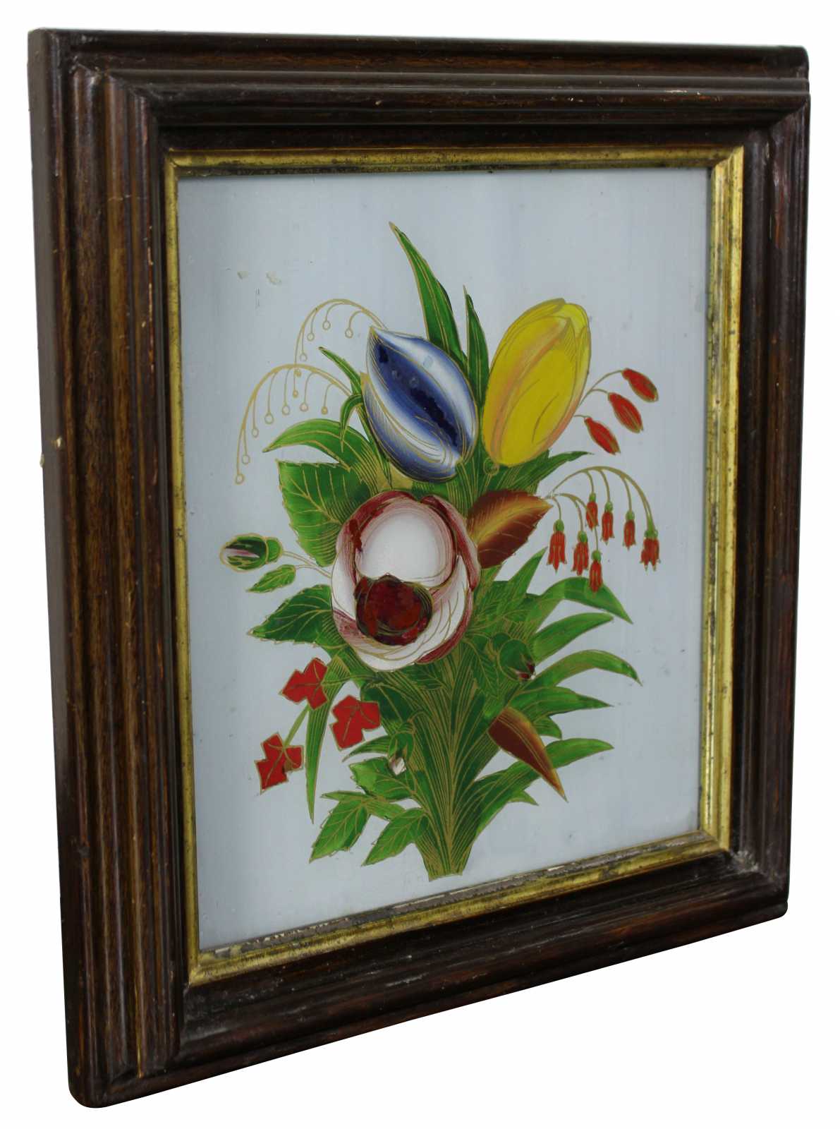 Antique floral botanical still life oil painting, reverse painted on glass, featuring a brightly colored flower arrangement with gold gilded accents.