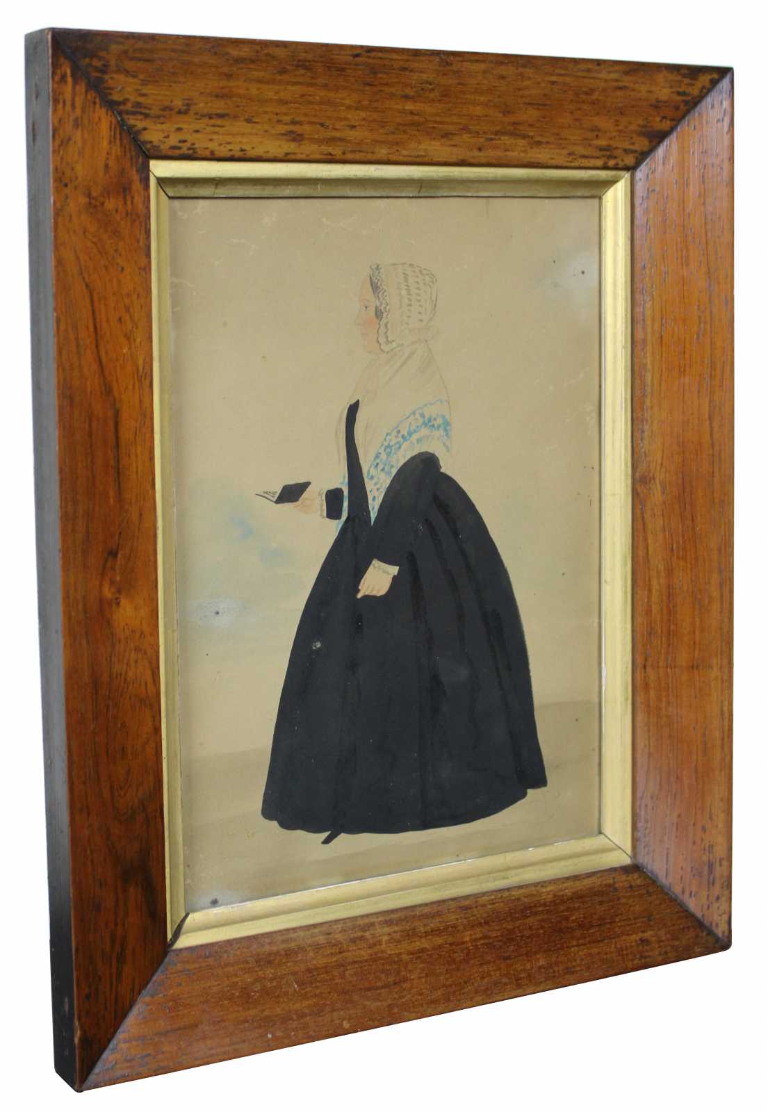 Antique primitive mid to early 19th century framed full length folk art silhouette portrait painting of a woman in black with an embroidered shawl and bonnet, holding / reading a book.