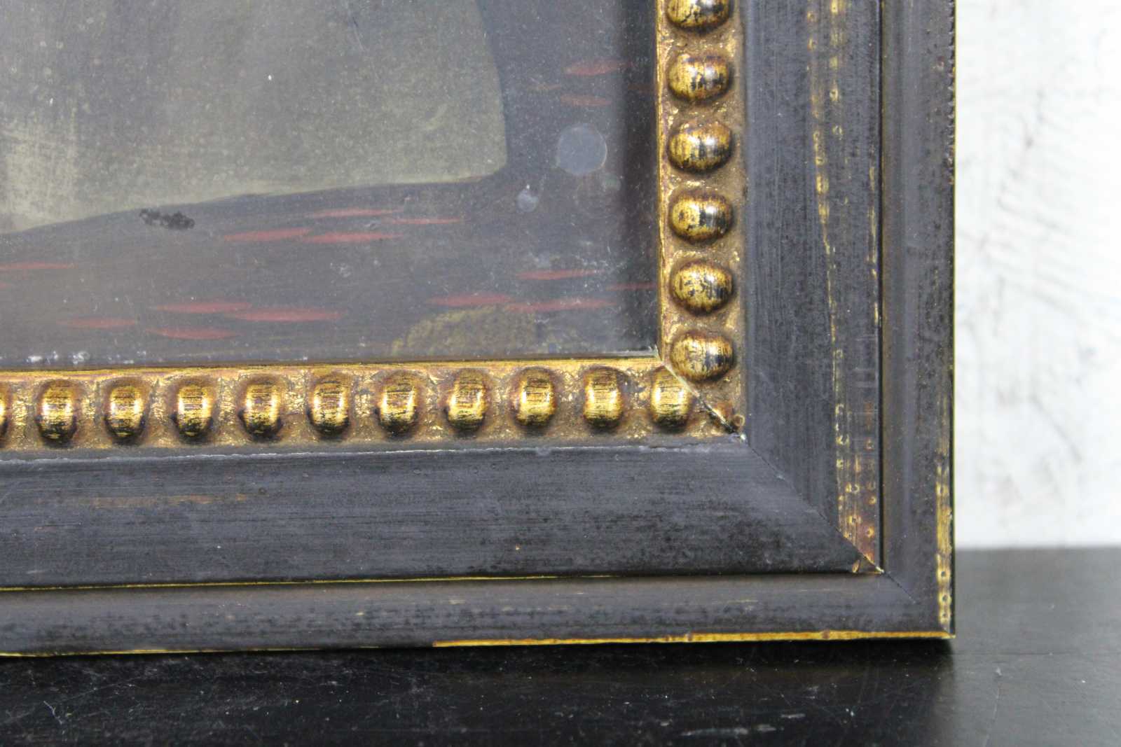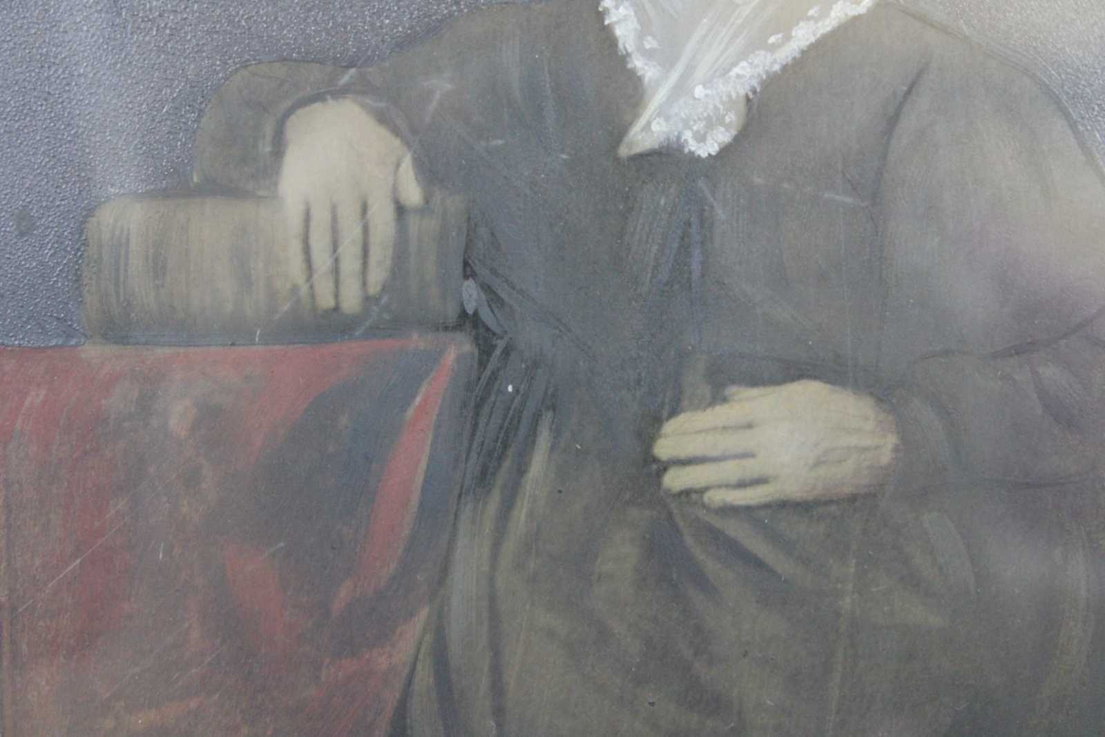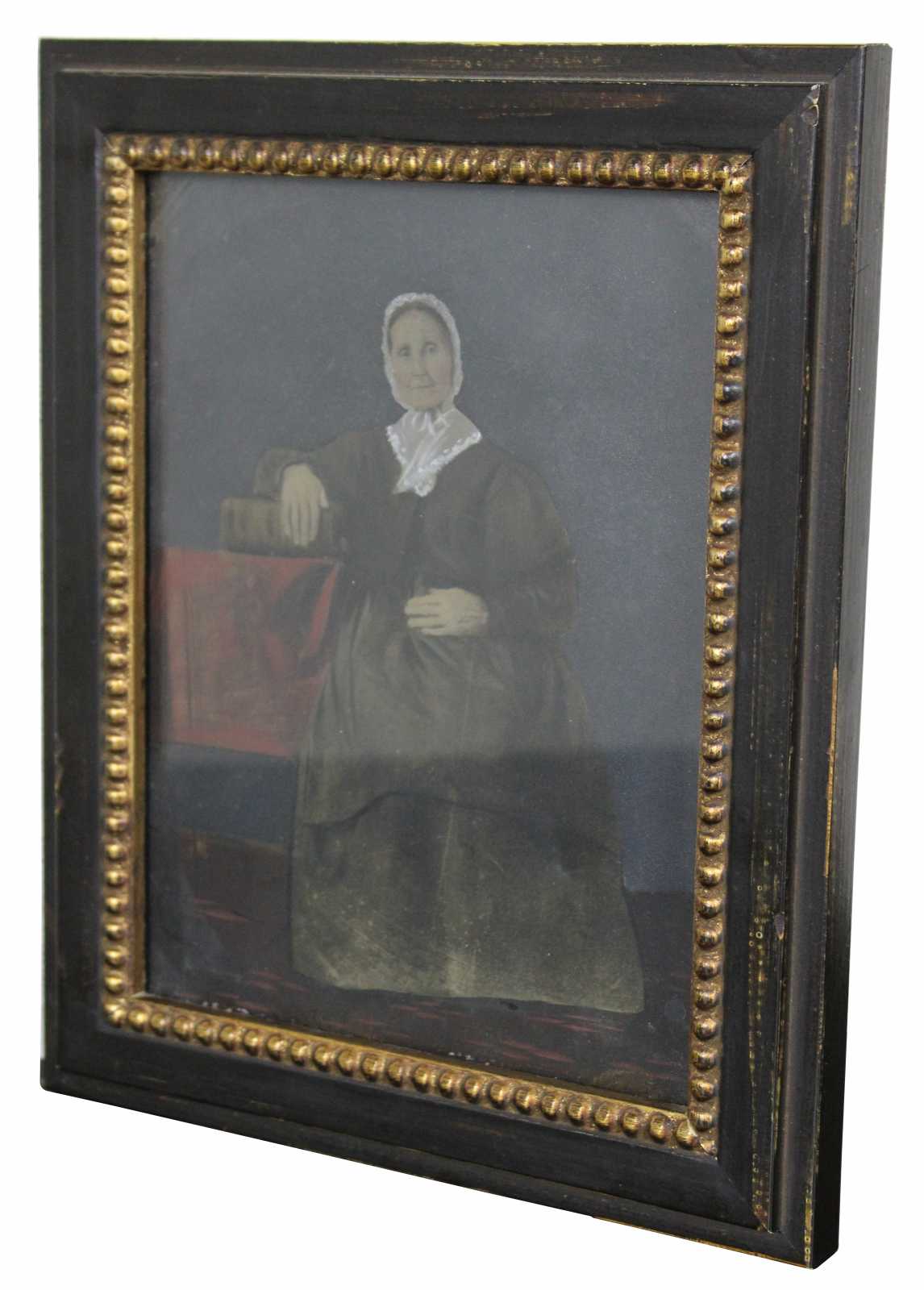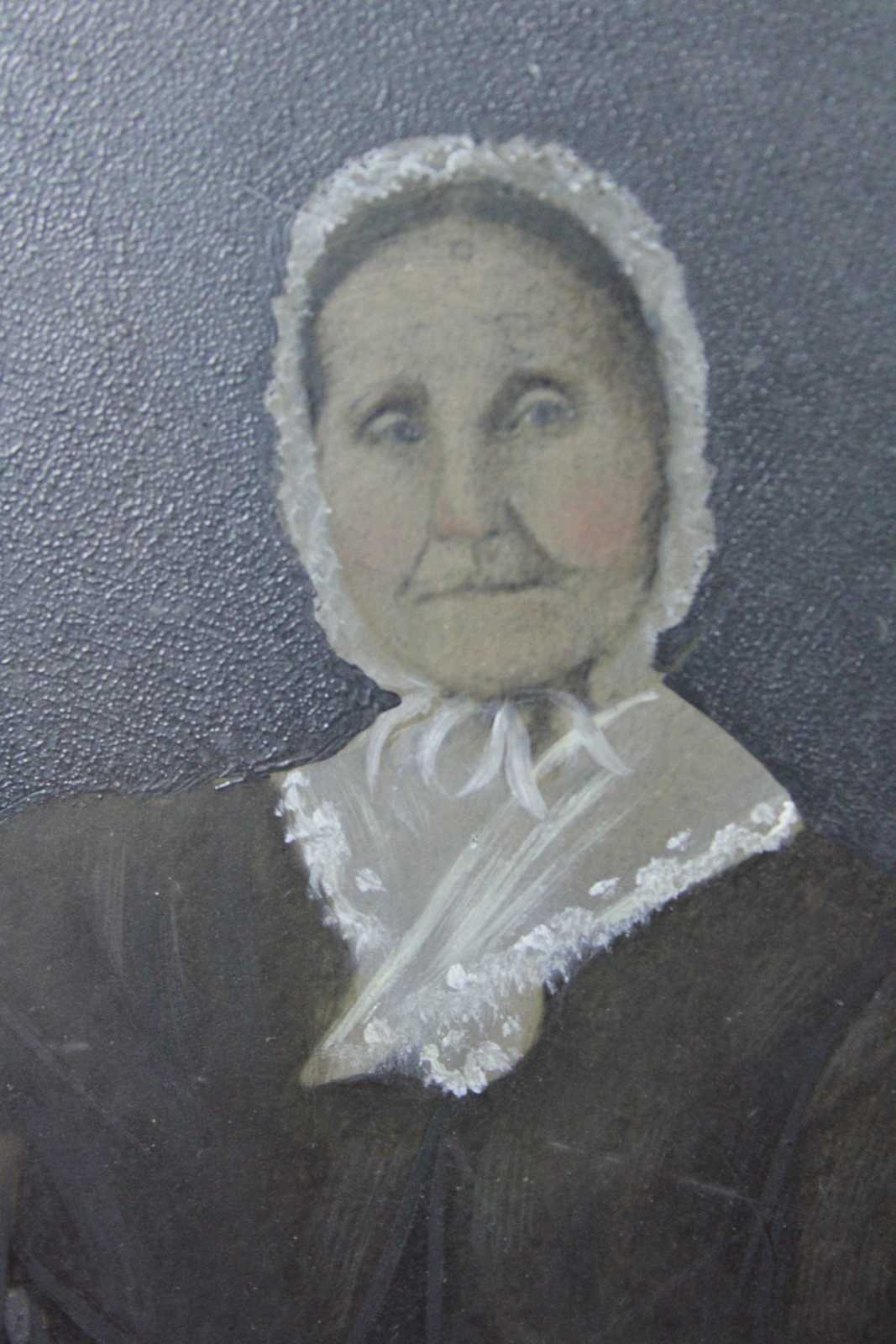 Fine antique oil painting on tin. A portrait painting of an elderly woman in black with a lace fichu bonnet seated at a table with her hand on a book.