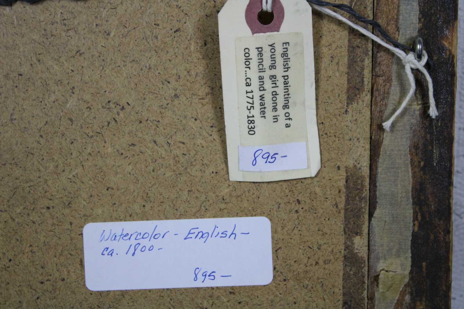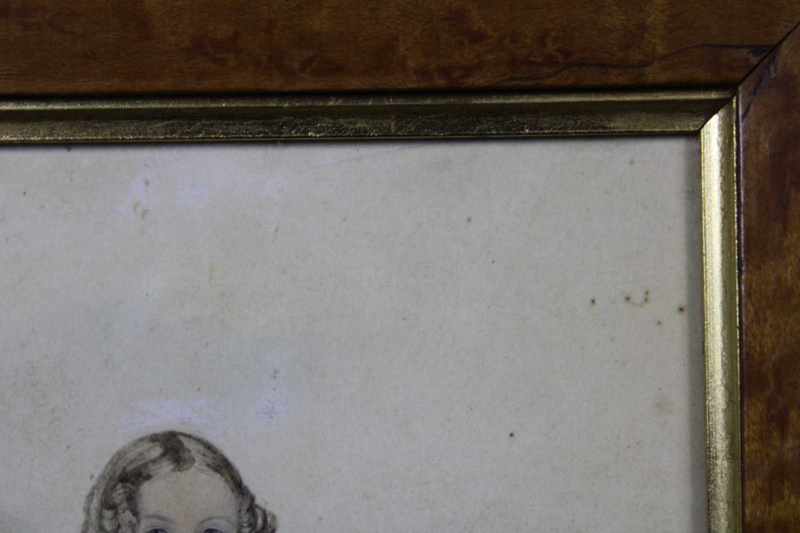Excellently preserved antique English watercolor and pencil portrait of a young girl from the early years of the 19th century, circa 1830s; displayed in a burl wood frame.