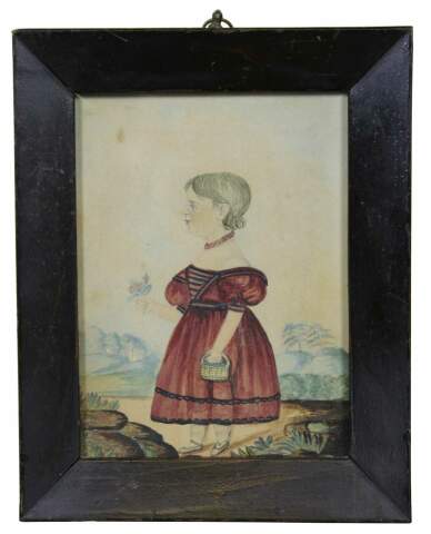Antique miniature early 19th century watercolor portrait painting of a woman or girl in a red dress holding a basket of flowers.
