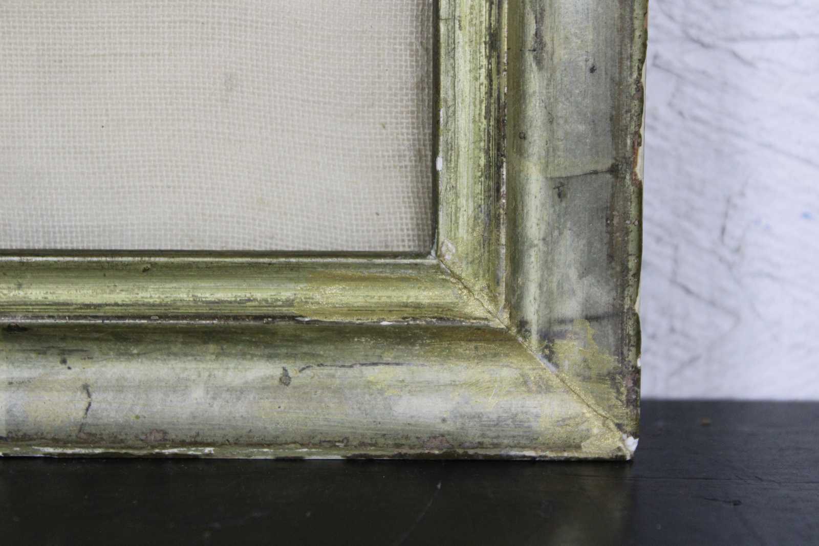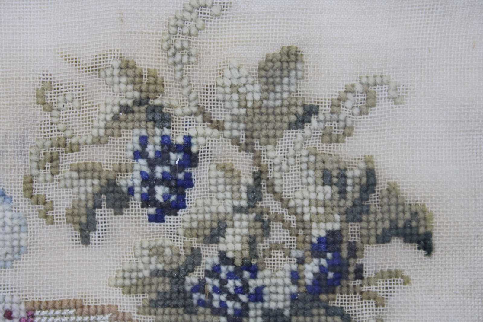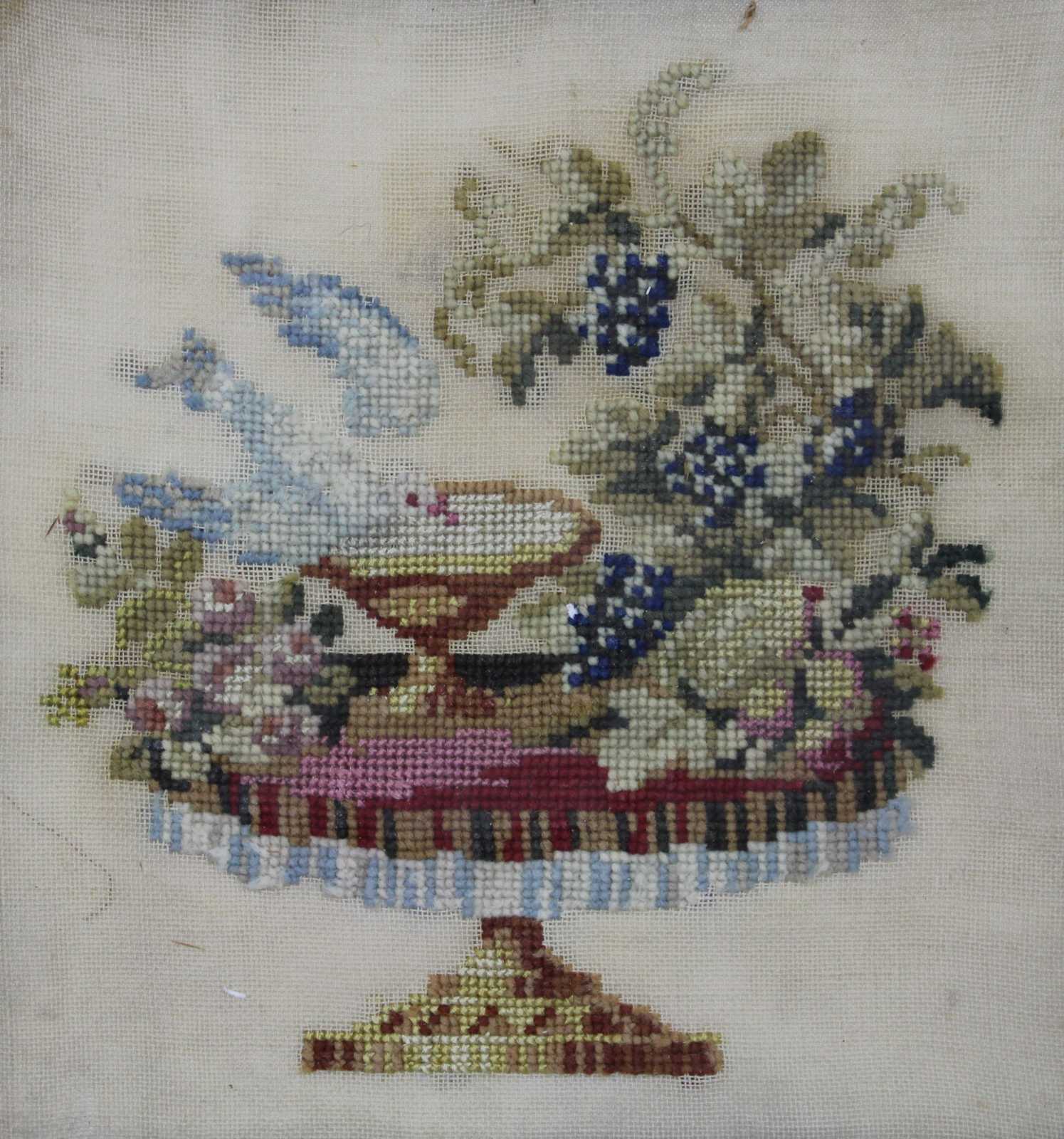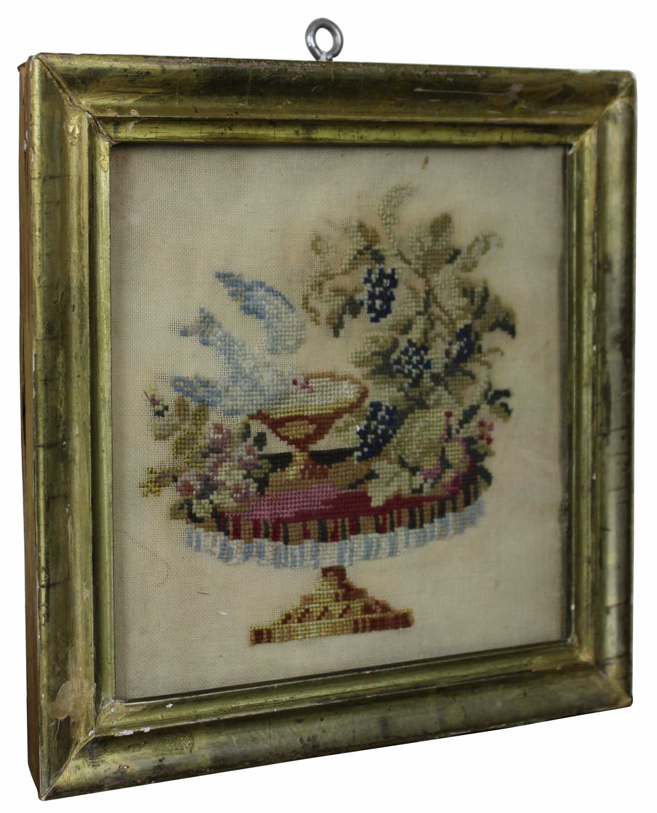 Antique mid 19th century folk art embroidery sampler showing a small pedestal table set with flowers, grapes, and a dove drinking or bathing in a bird bath.