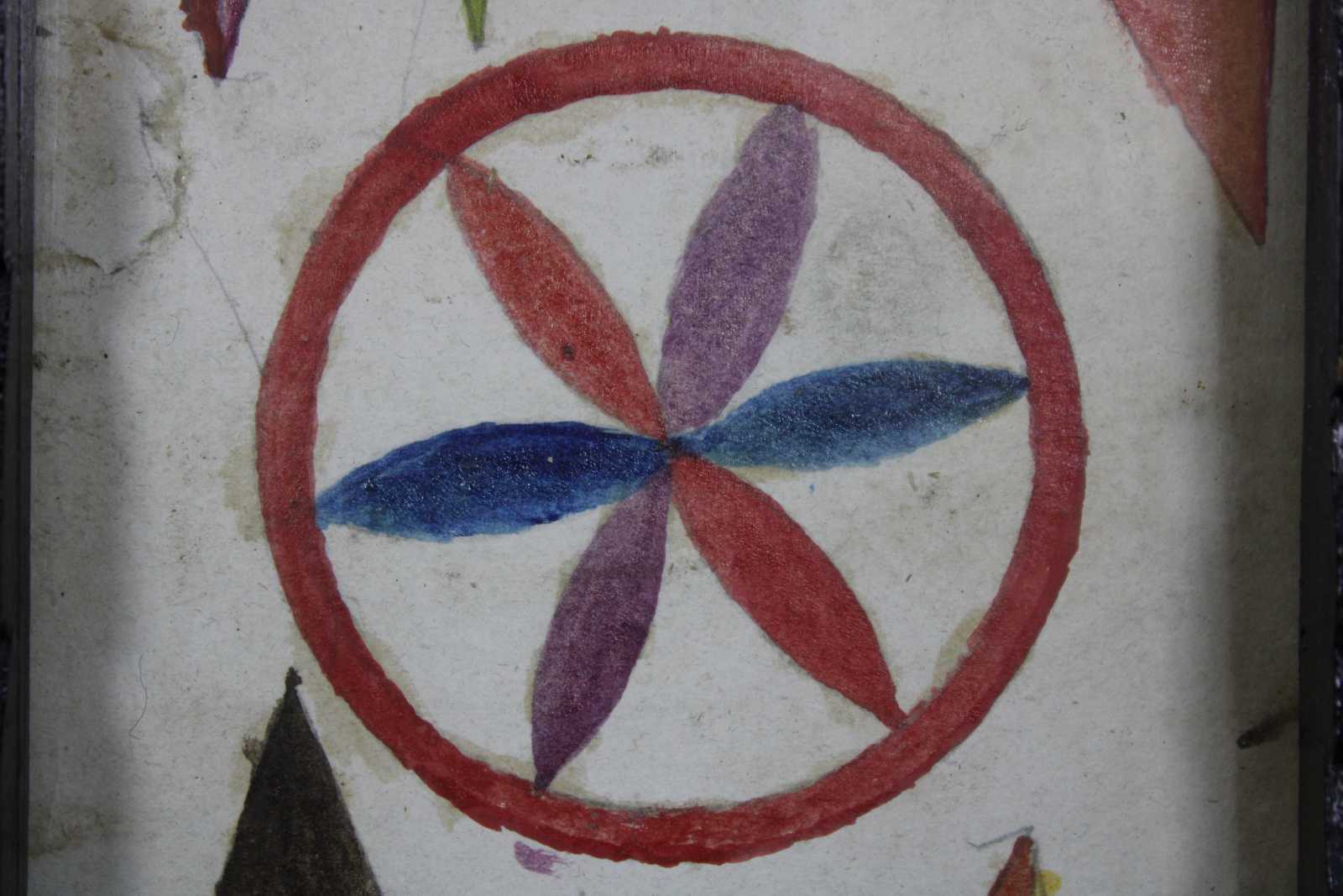 Vintage abstract geometric folk art watercolor painting featuring a pinwheel, American flag and a bunch of triangles, in a rustic carved frame.