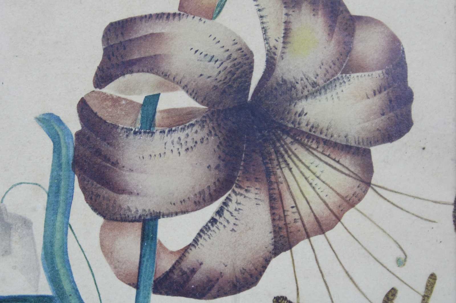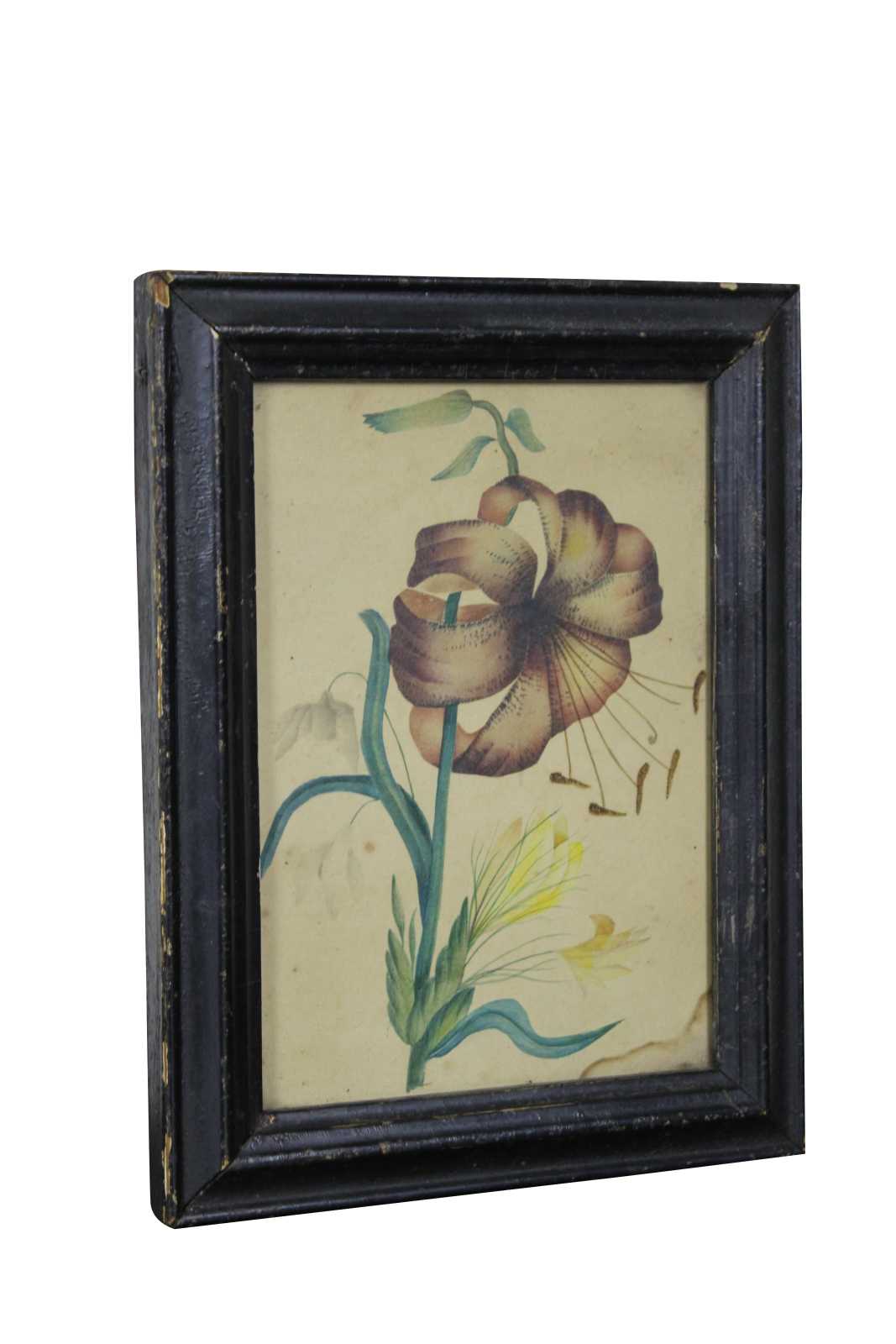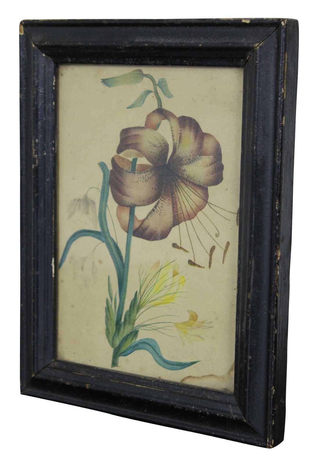 Antique botanical tiger lily watercolor painting in black wood frame.