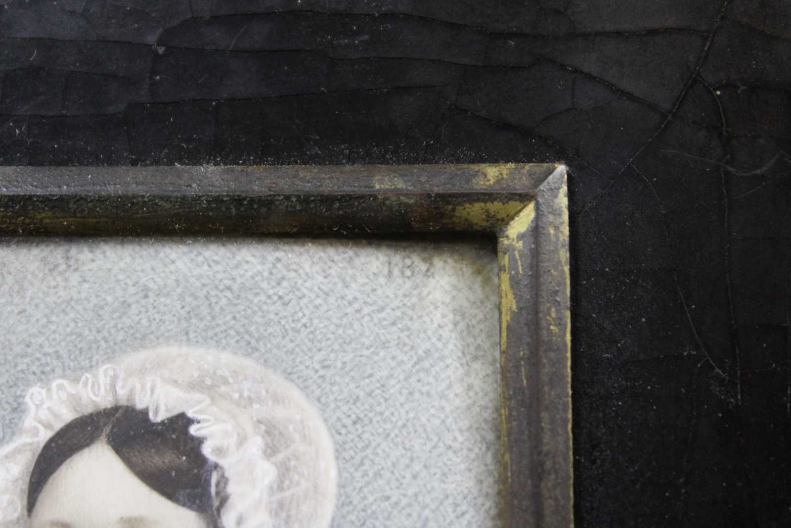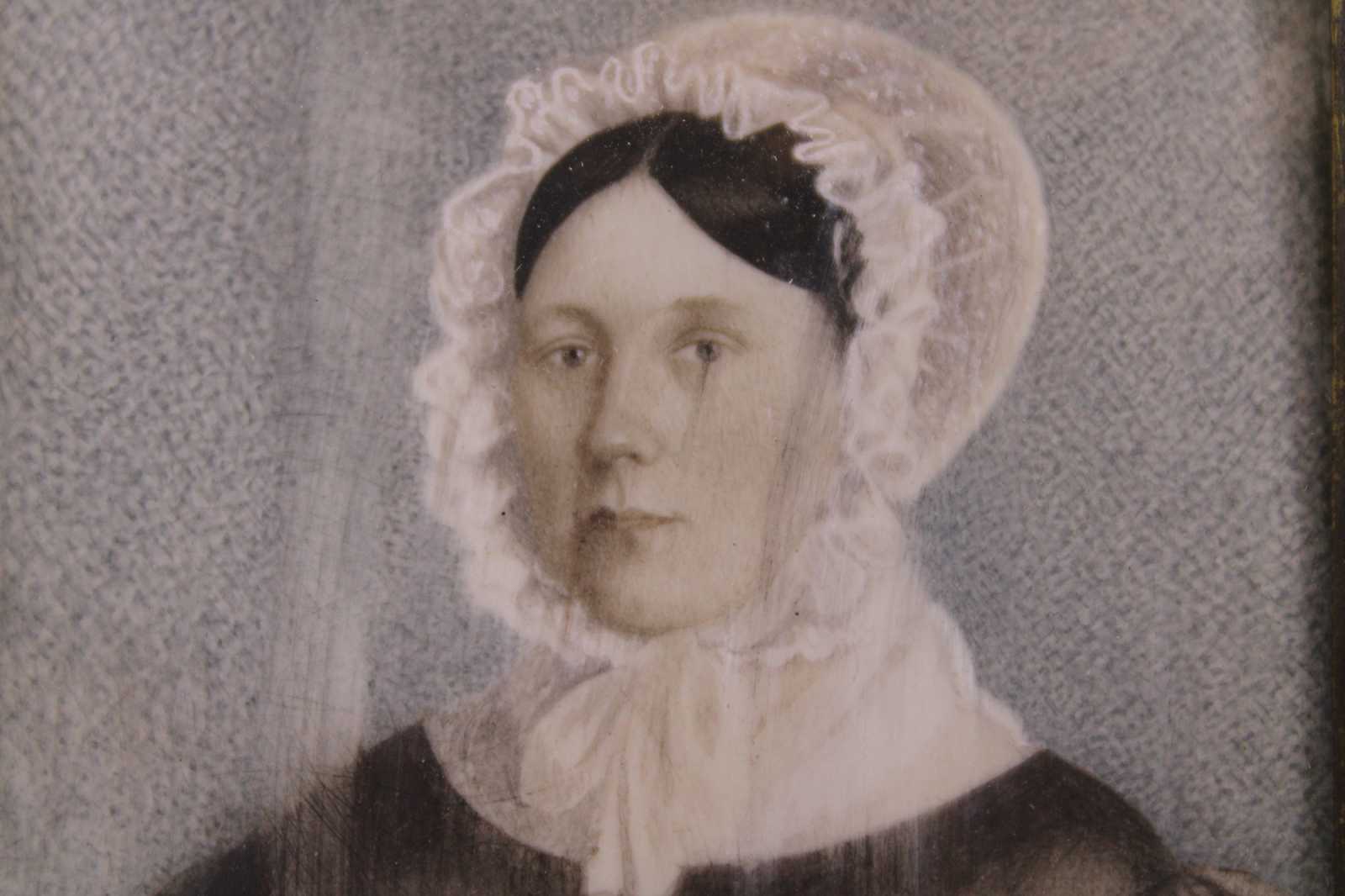 Antique miniature portrait painting showing a woman in a modest black dress and white lace bonnet, a Mrs. S. Wamacote of Newport, painted by J.W. Thomas, 1827.