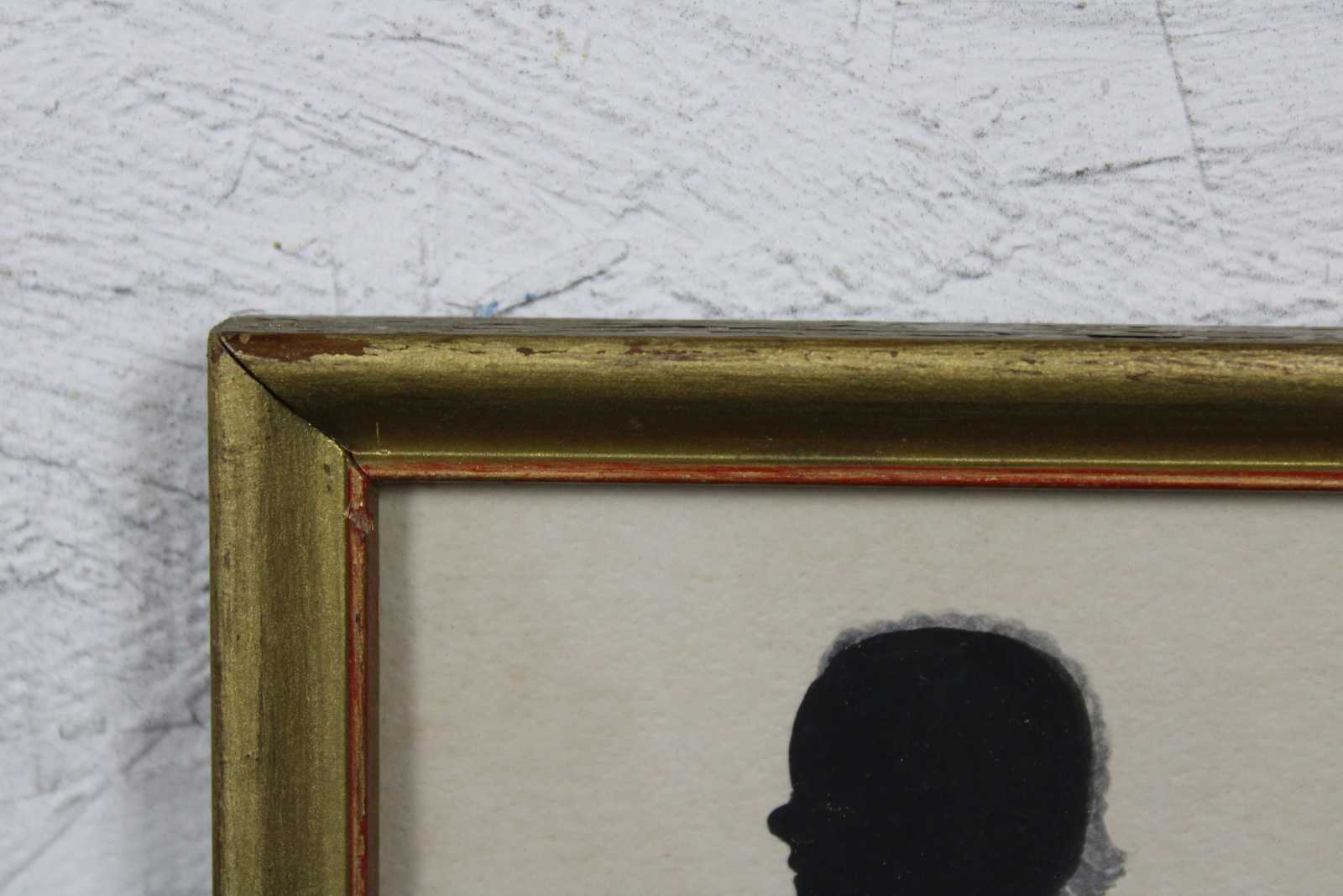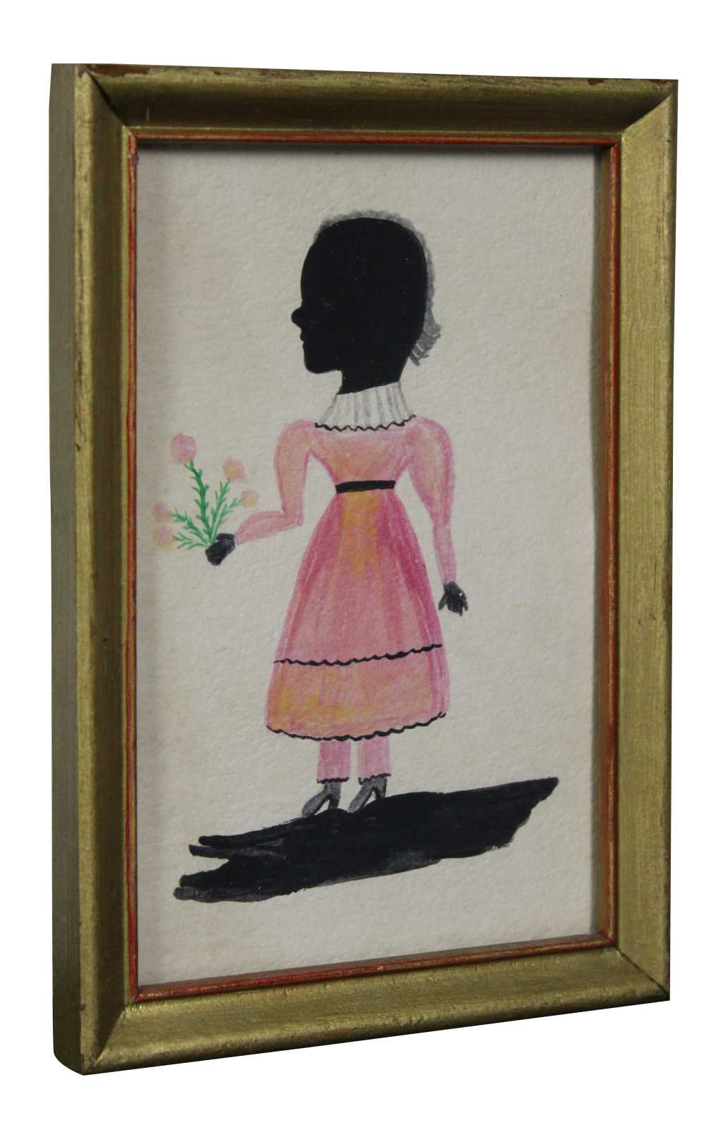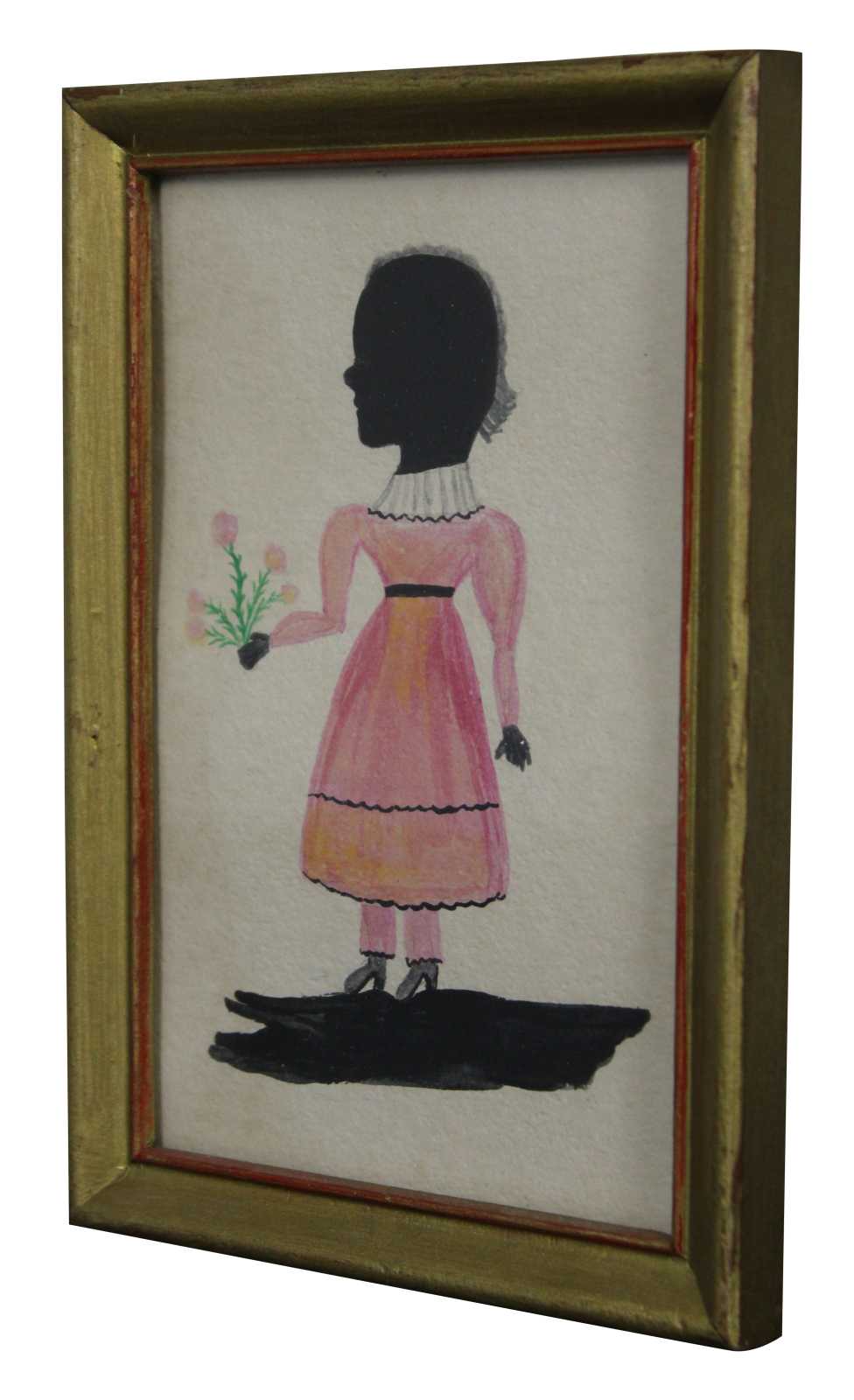 Vintage hand painted, Victorian-style folk art miniature, full body silhouette of a little girl / young woman in heals and pink dress holding a bouquet of flowers.