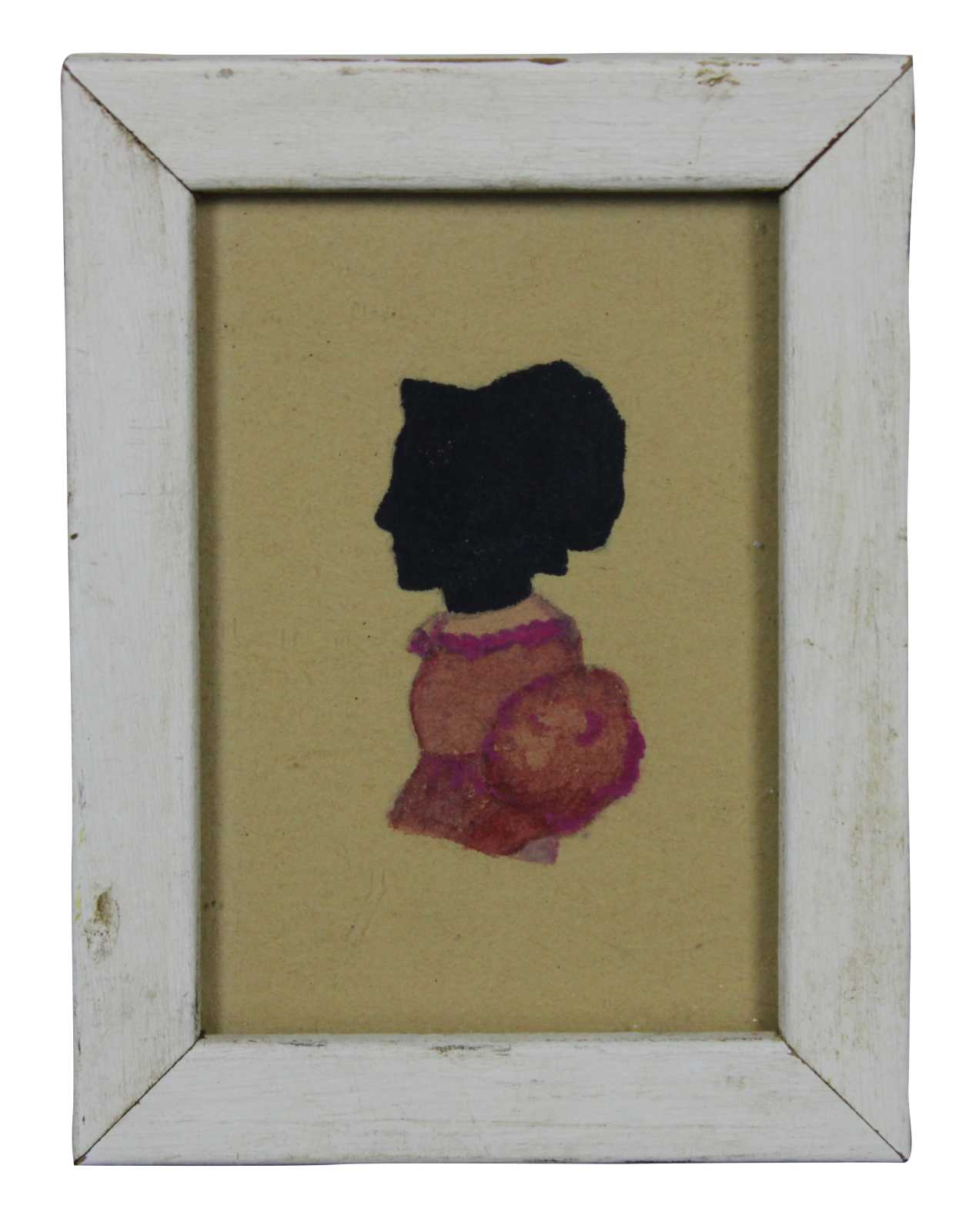 Antique Americana folk art hand painted pair of silhouettes showing a woman in a pink dress with puff sleeves, and a man in a green frock coat.