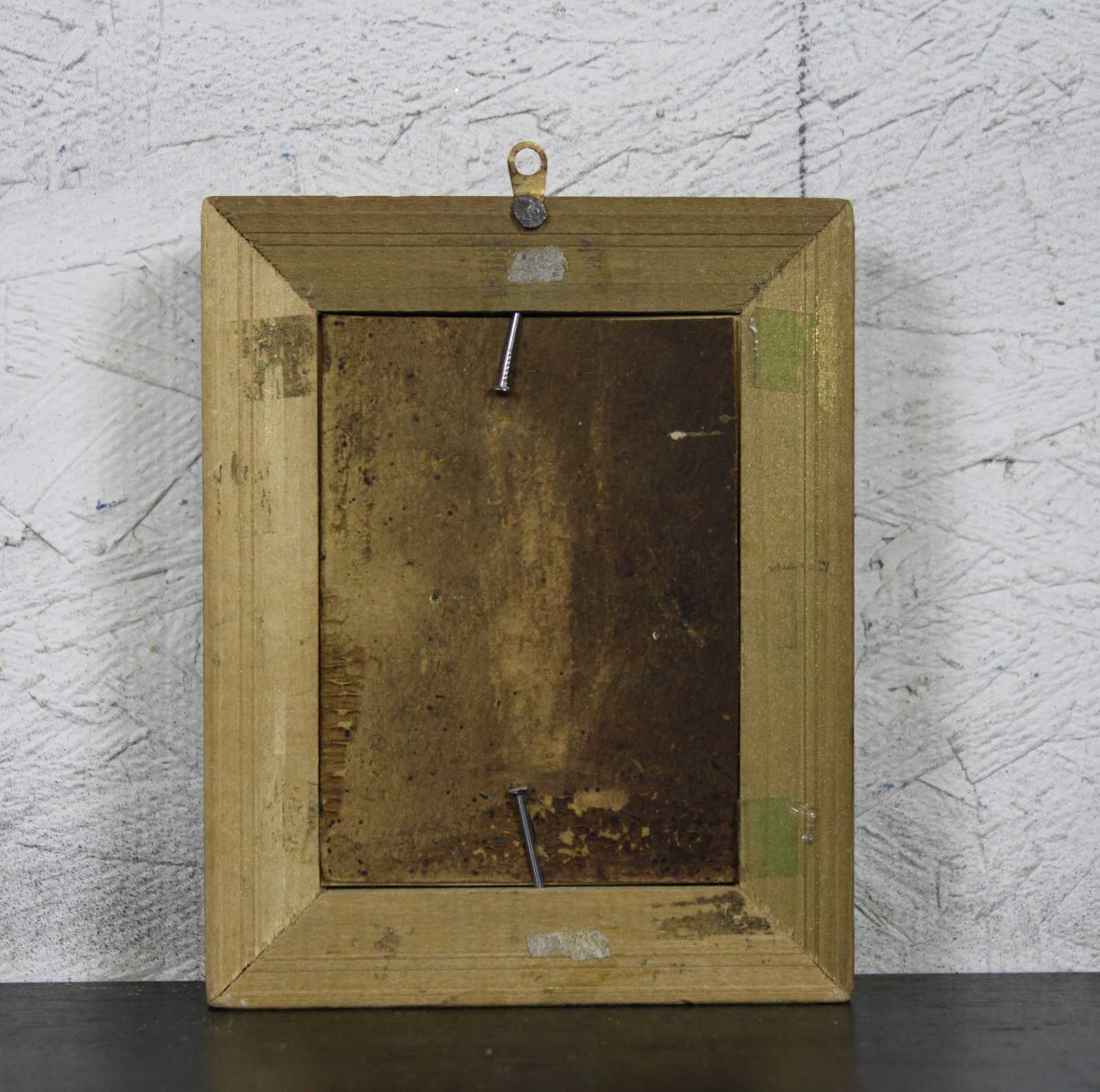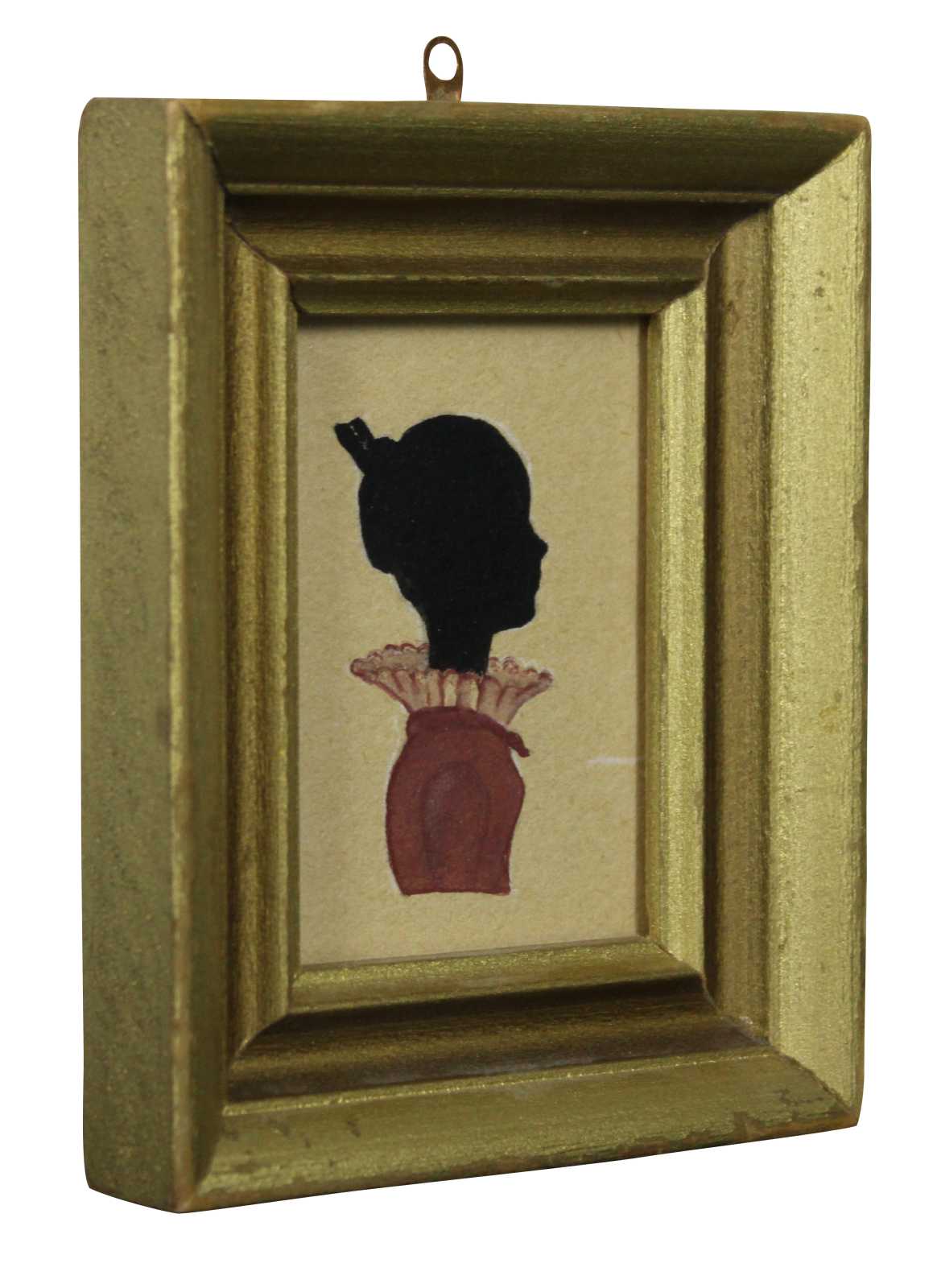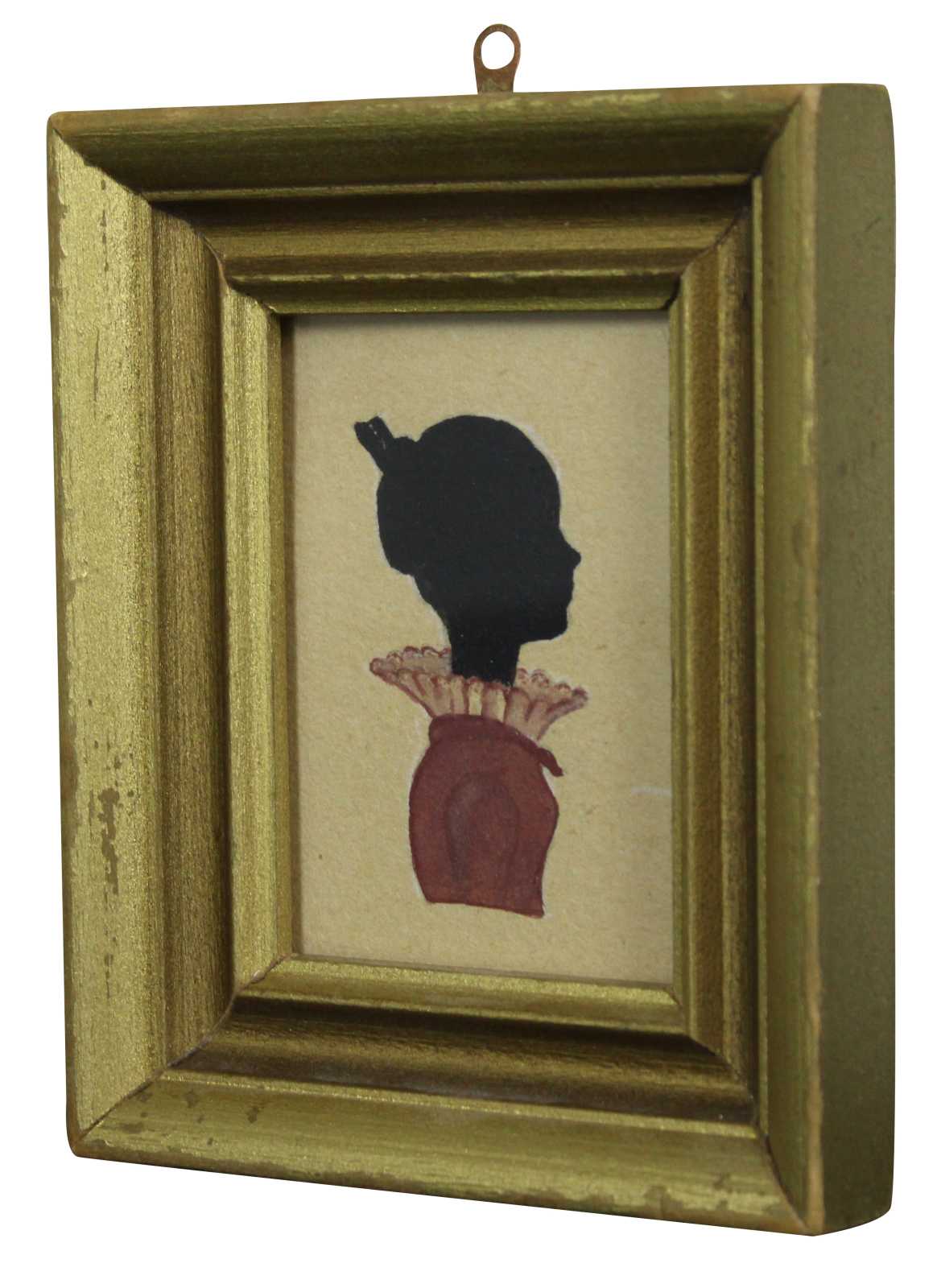 Antique American folk art hand painted Victorian silhouette of a young woman in a pink dress with a high lace collar.