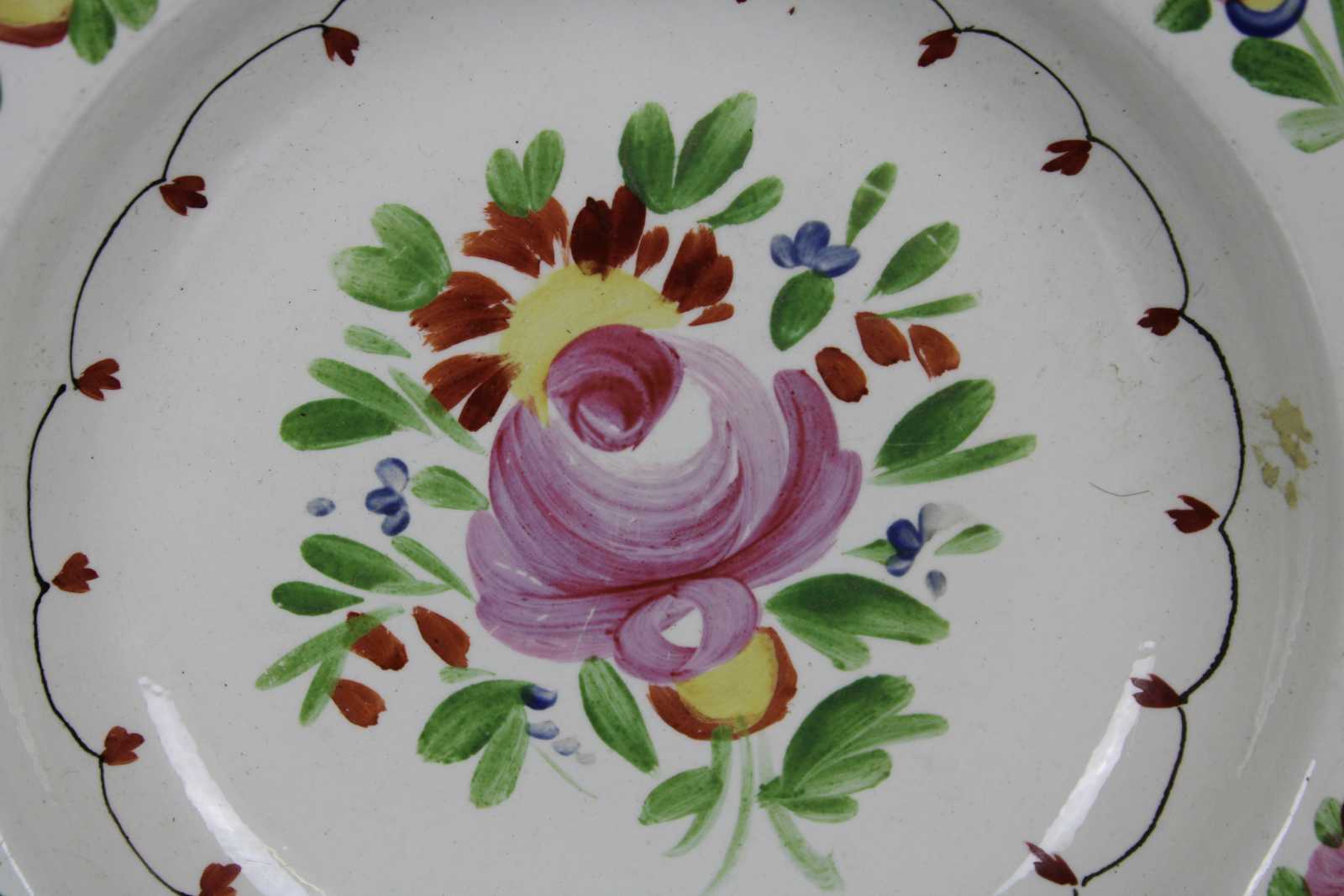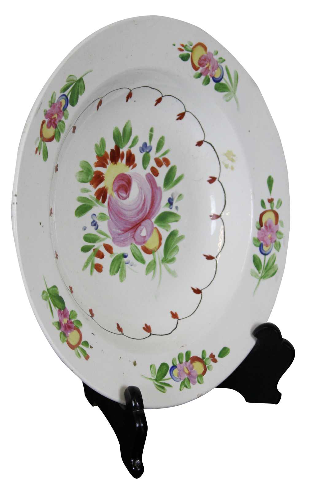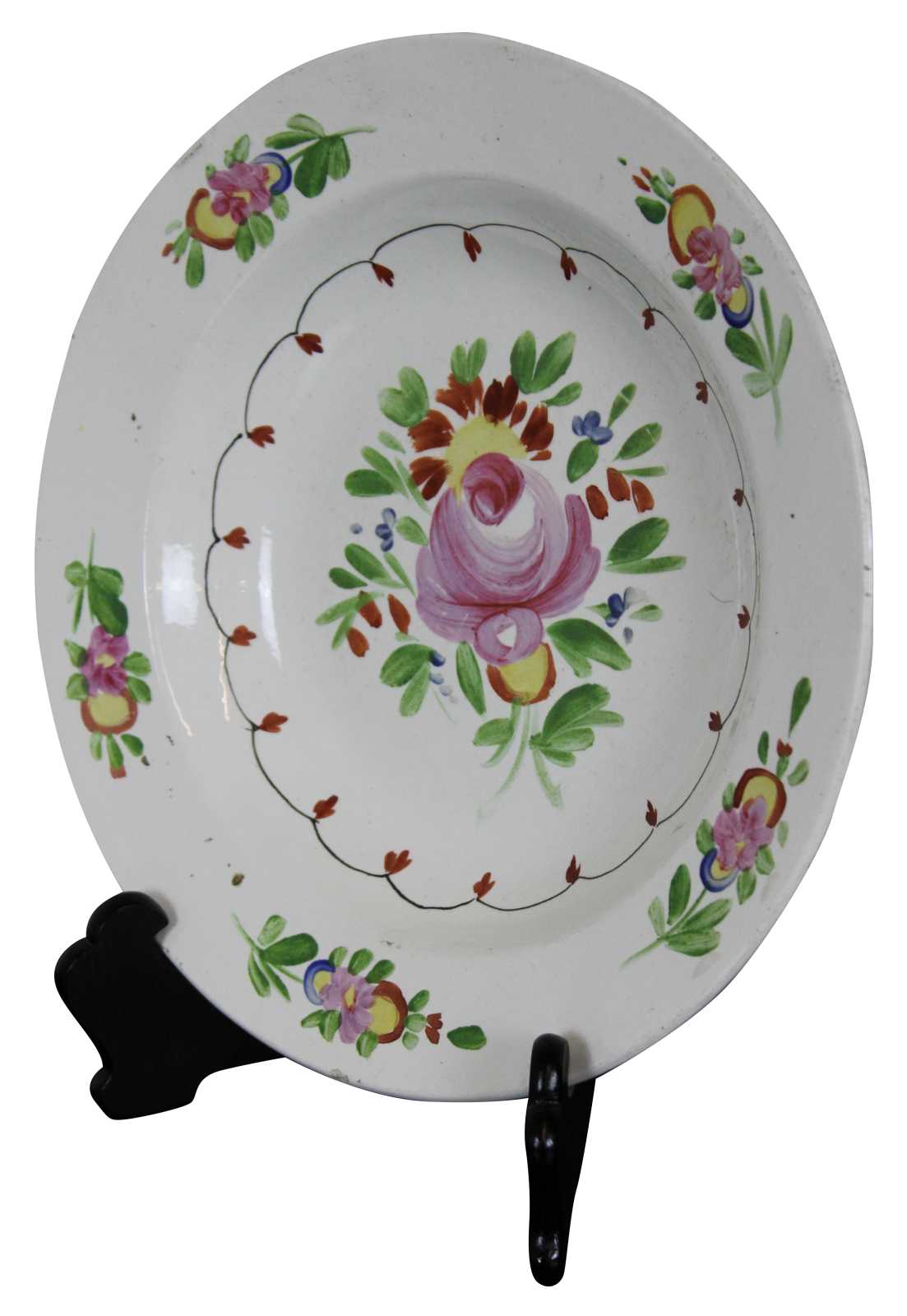 Antique hand painted folk art porcelain plate featuring pink roses and other flowers.