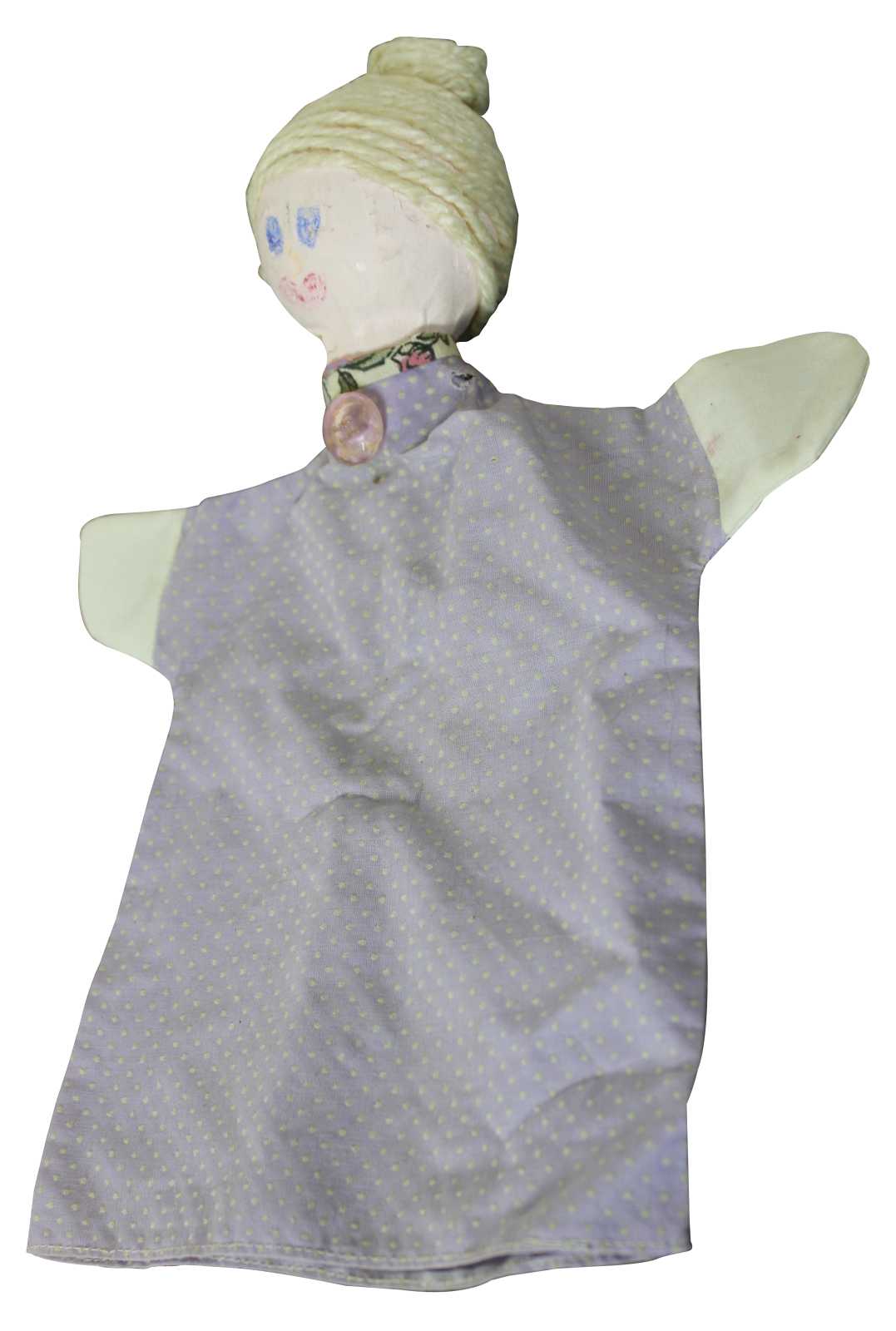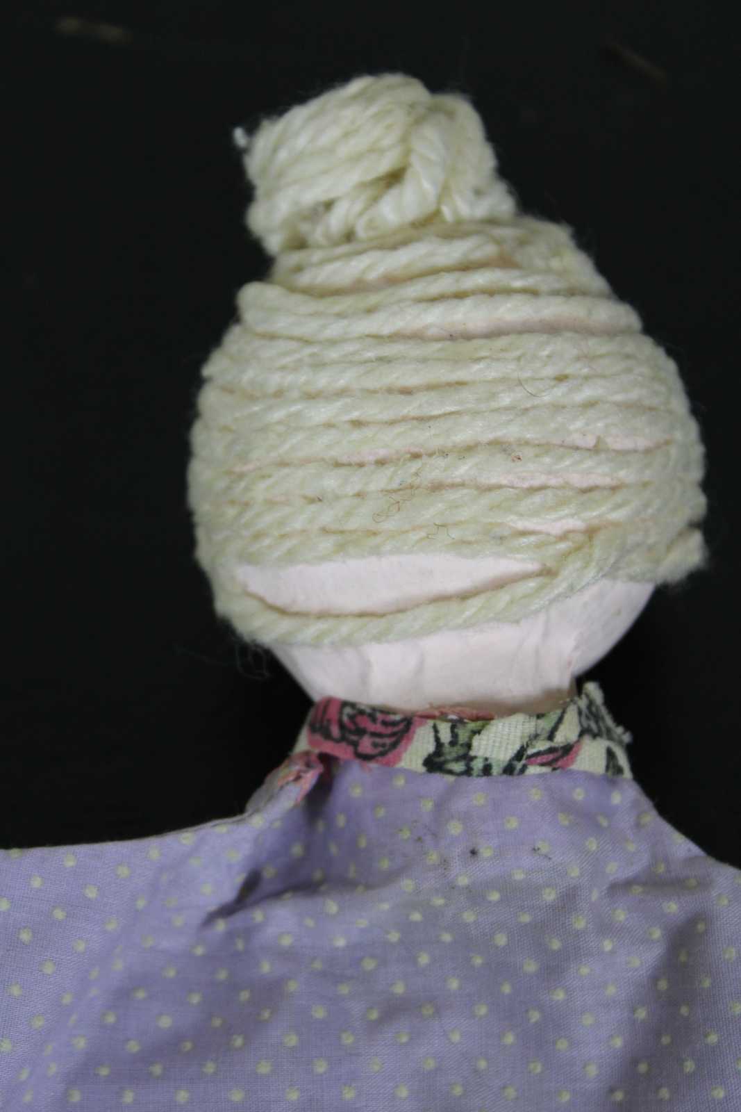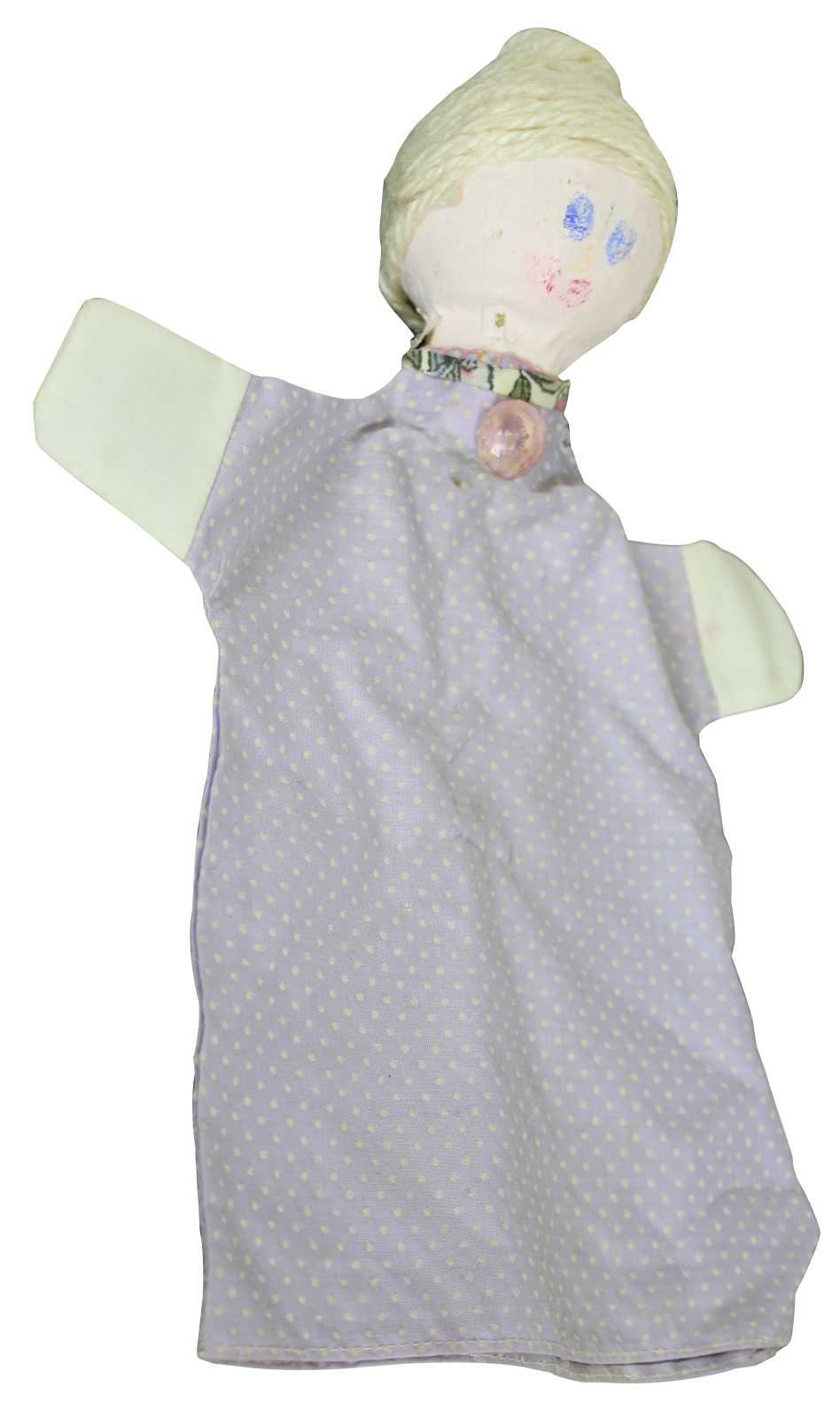 Vintage folk art hand puppet with yarn hair resembling the grandma / grandmother from Little Red Riding Hood.
