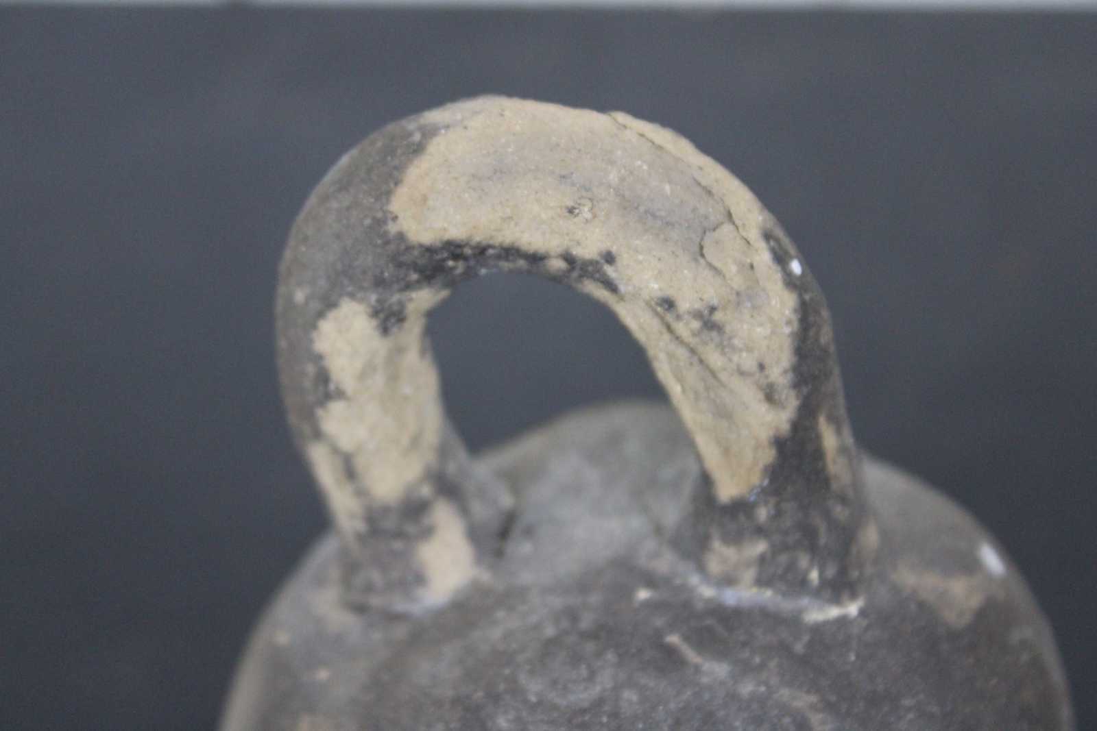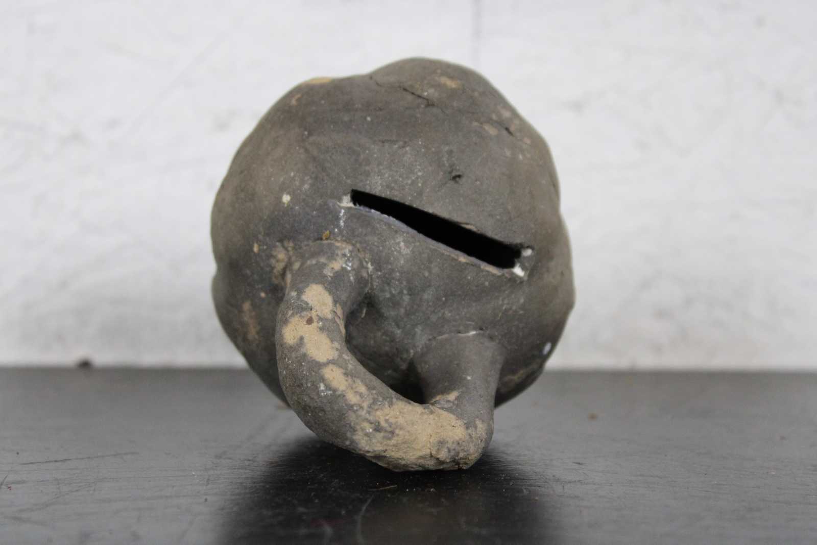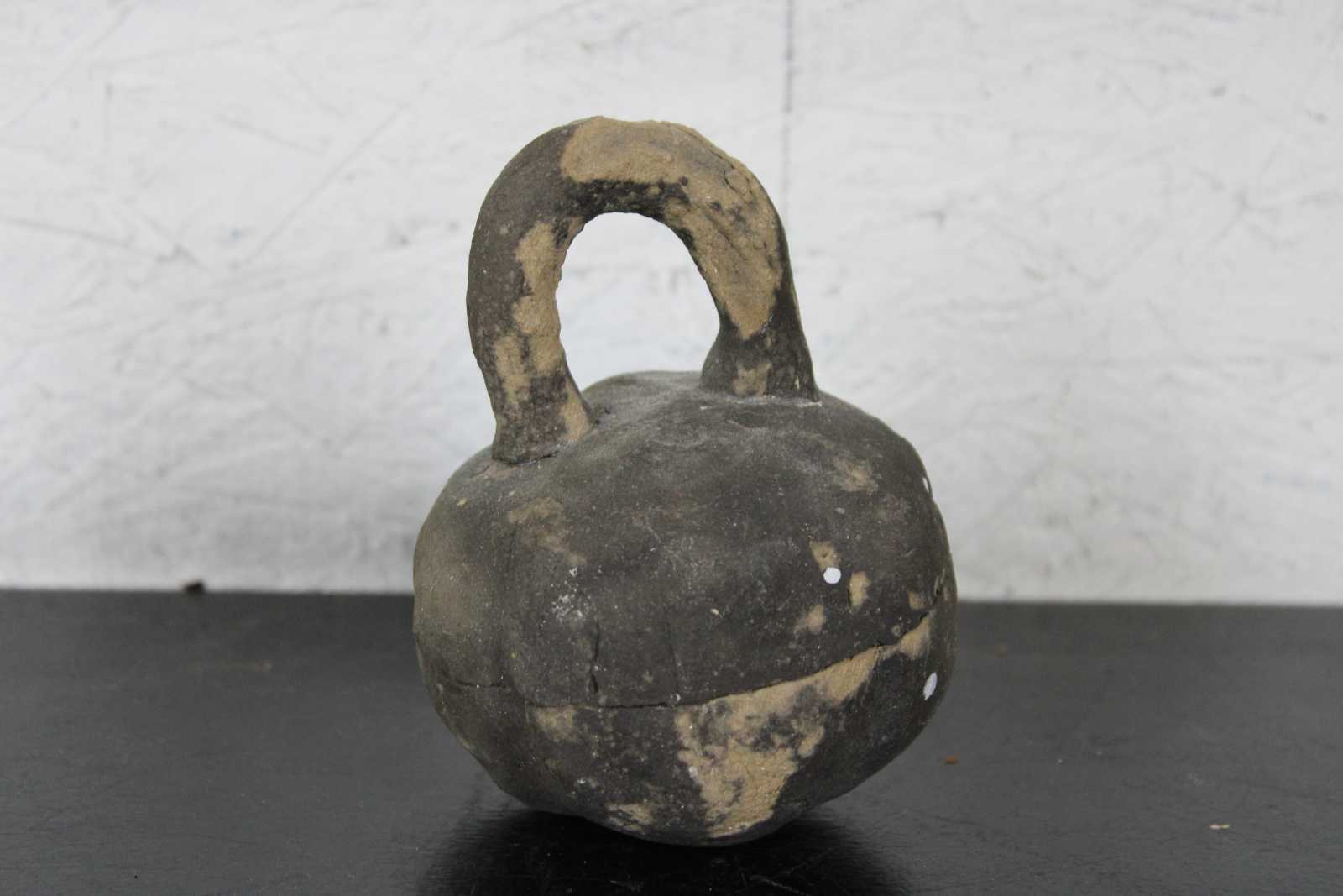Antique primitive hand crafted folk art clay coin bank in the shape of a kettlebell.