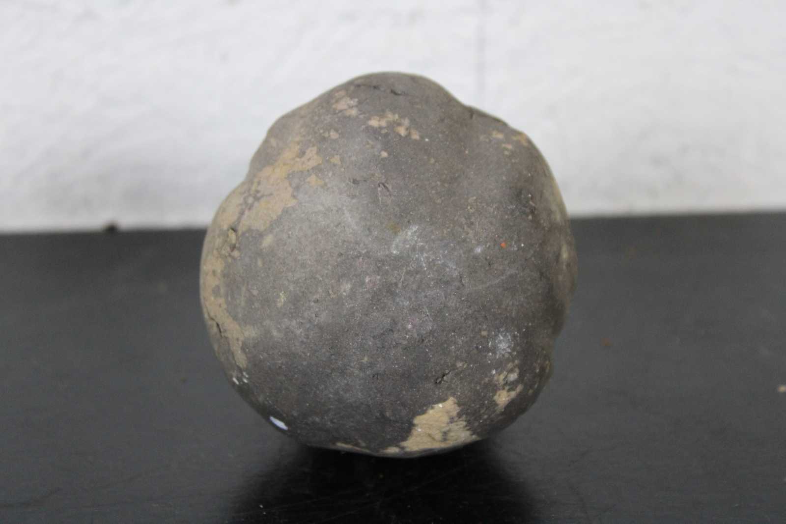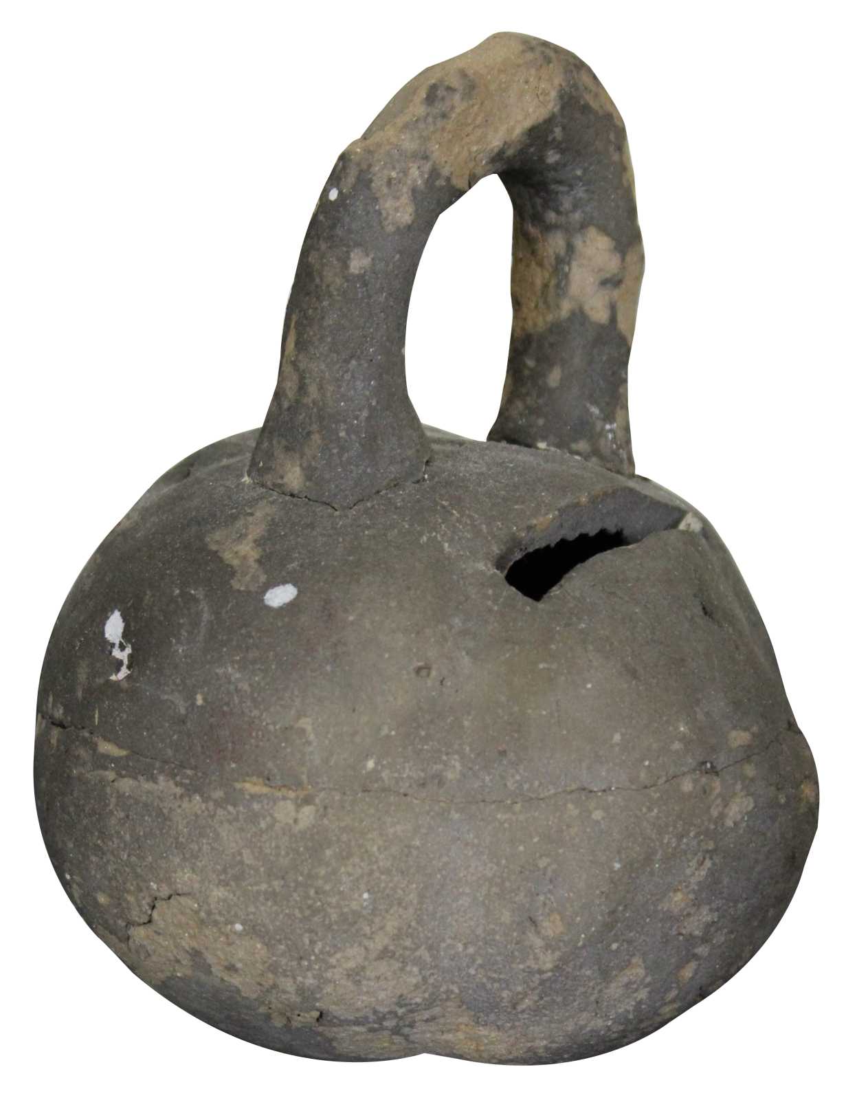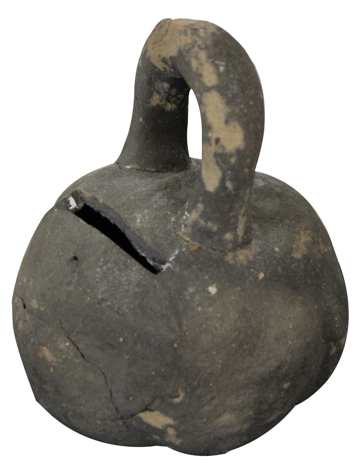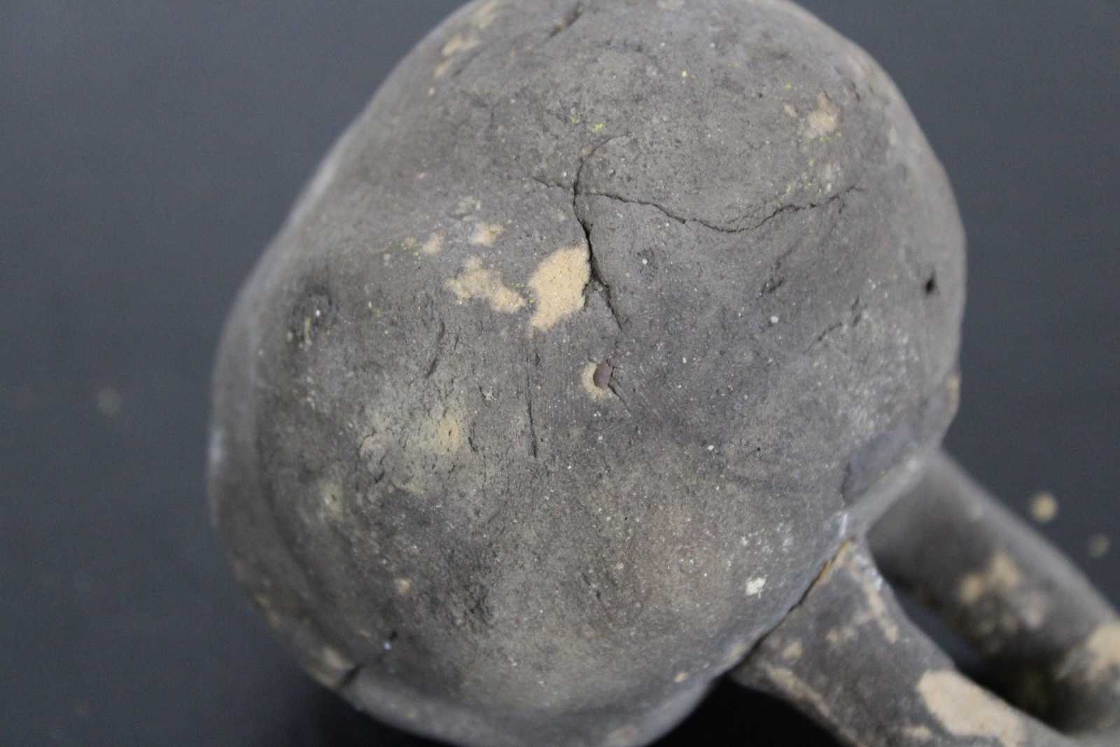 Antique primitive hand crafted folk art clay coin bank in the shape of a kettlebell.