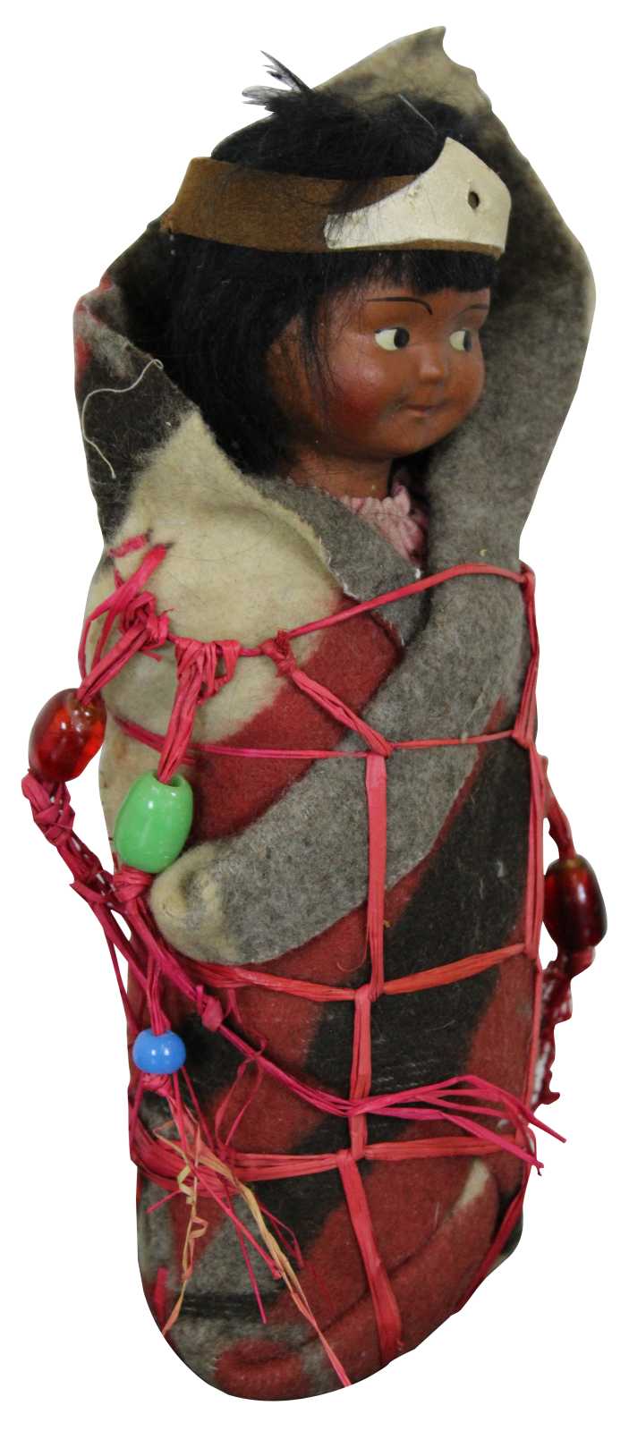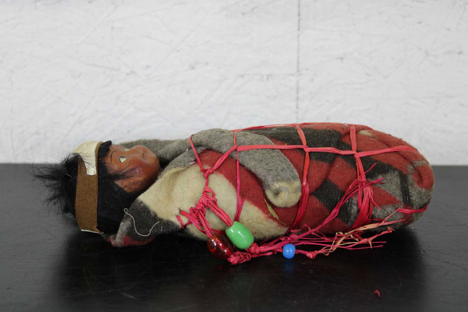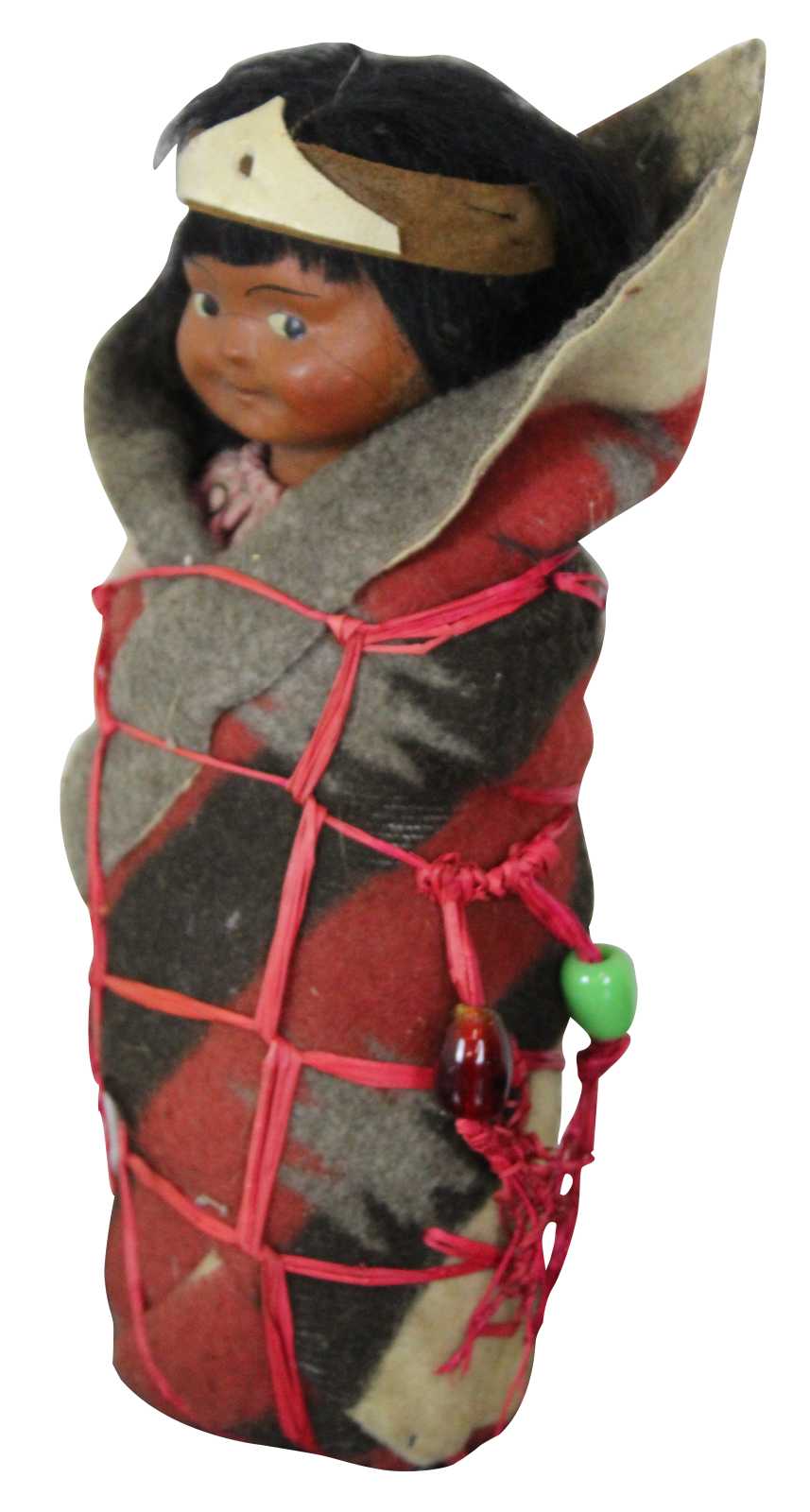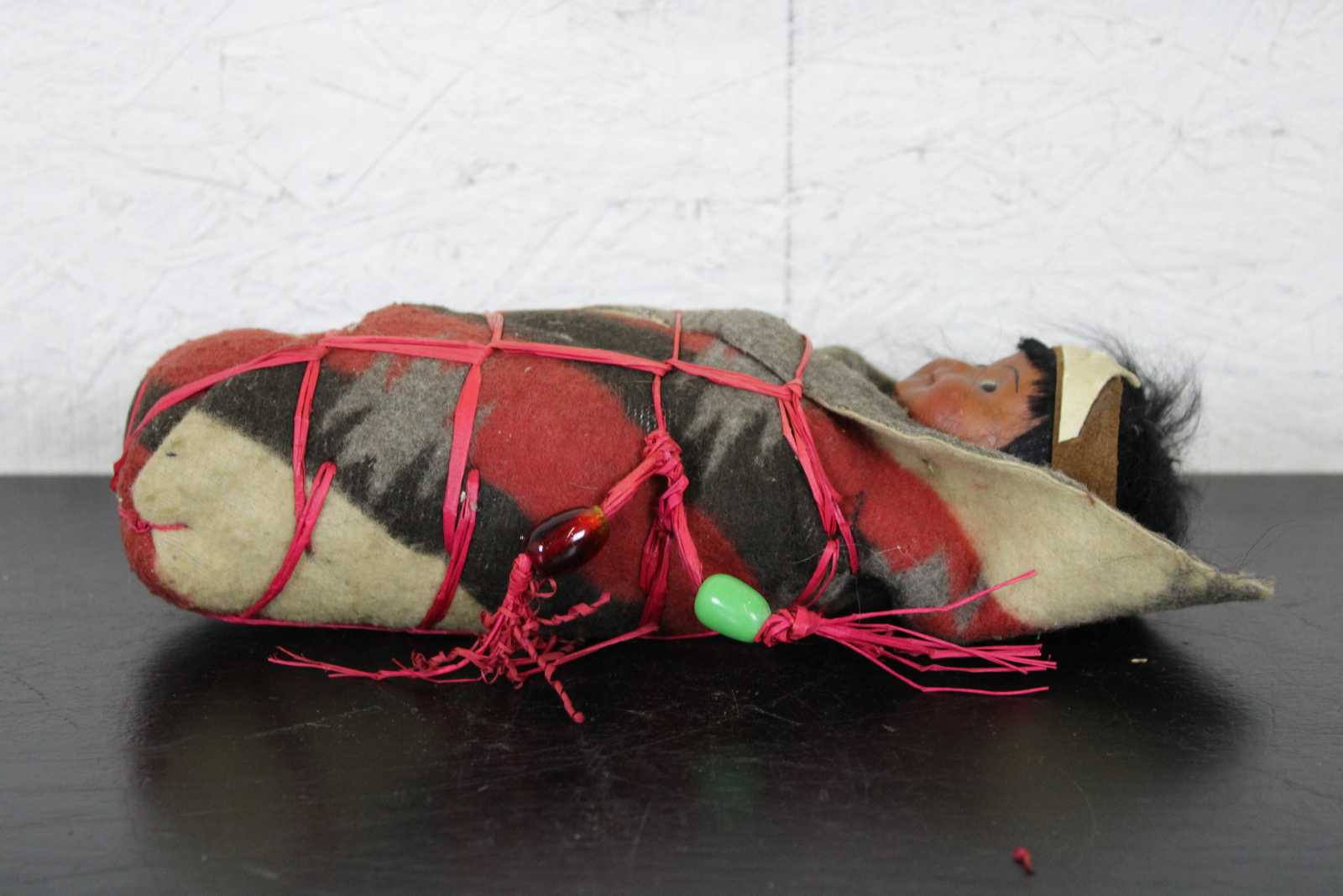 Antique Native American Skookum doll of a small child wrapped in blankets and beaded raffia.