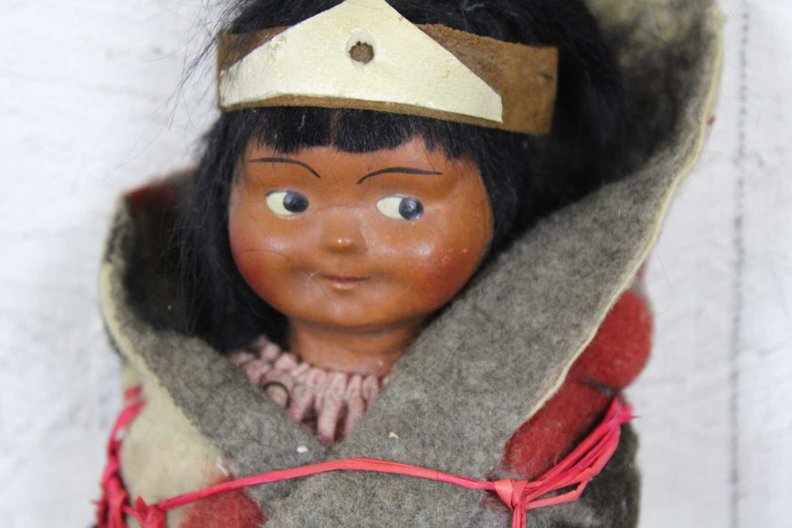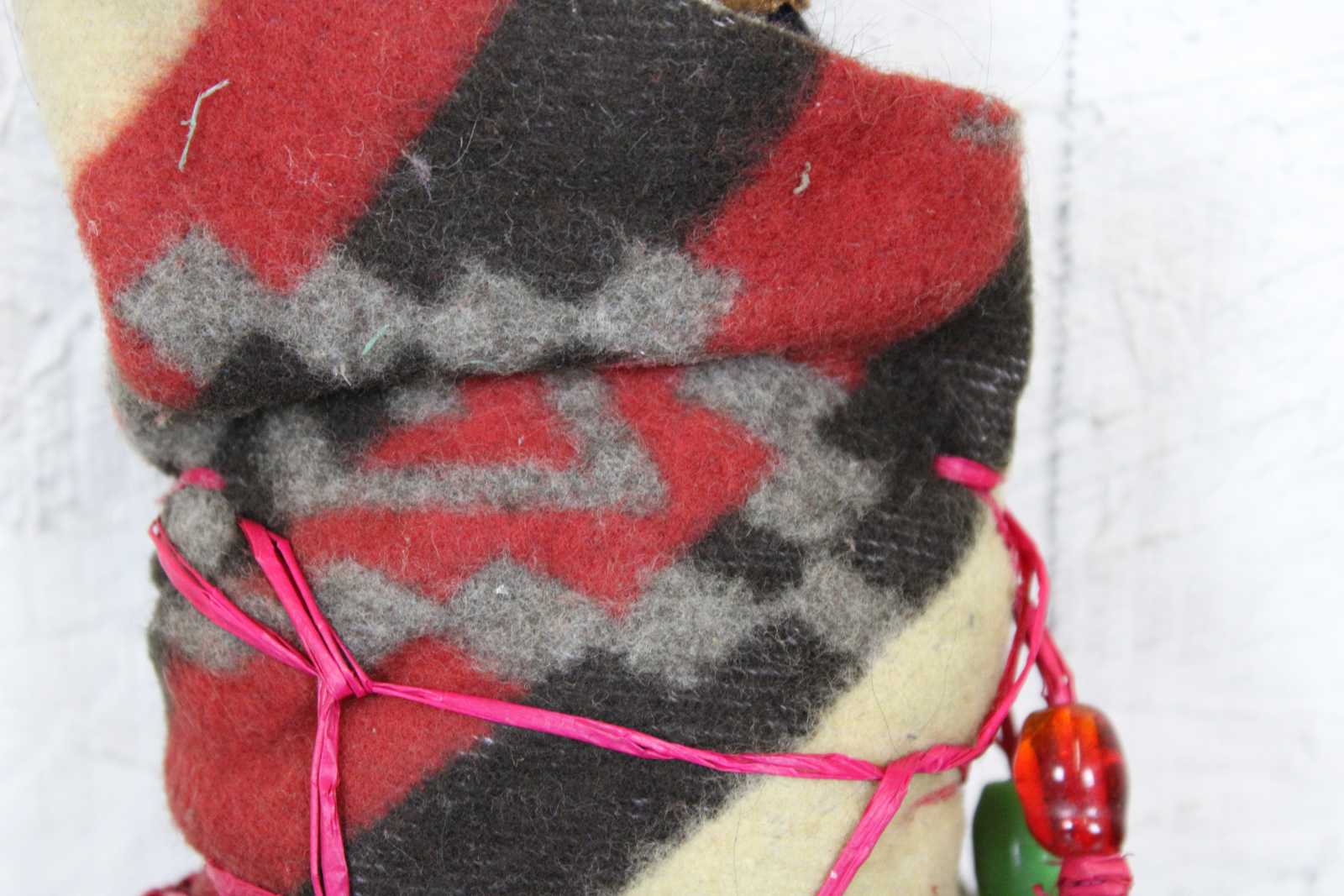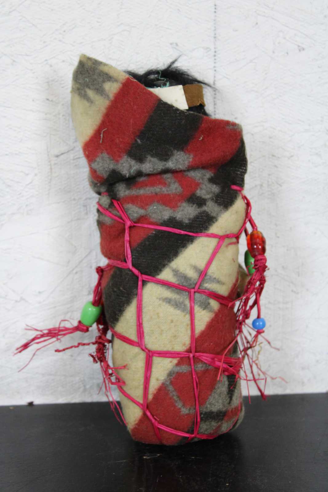 Antique Native American Skookum doll of a small child wrapped in blankets and beaded raffia.