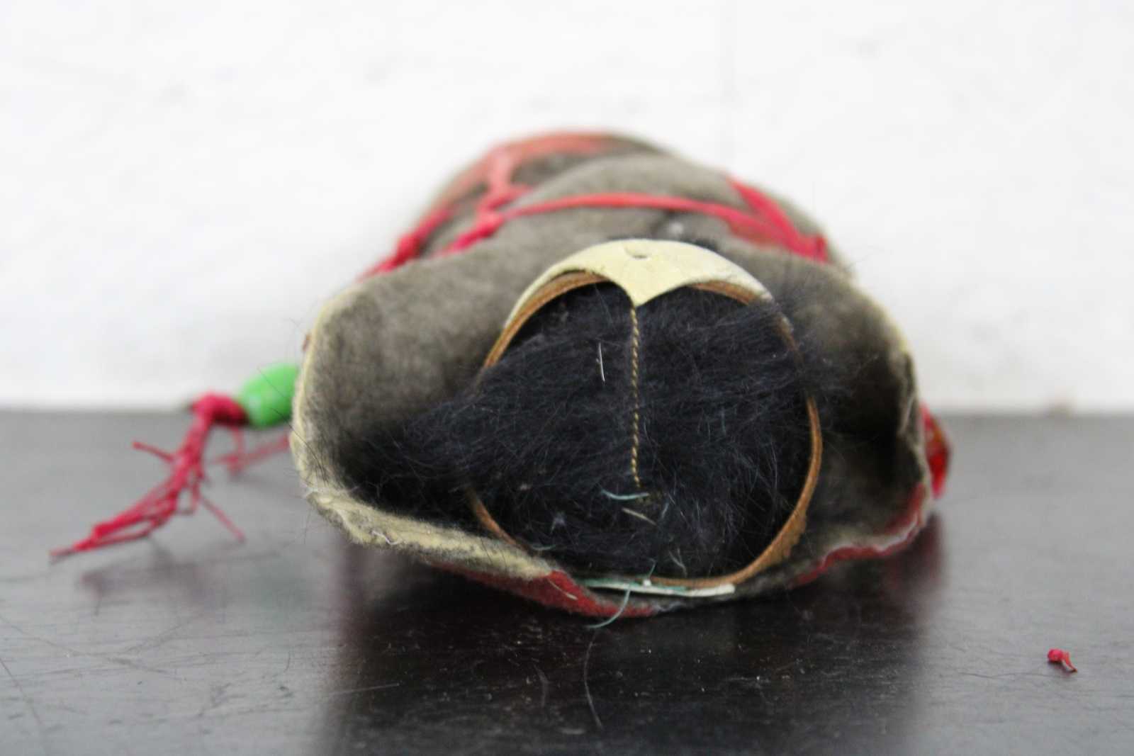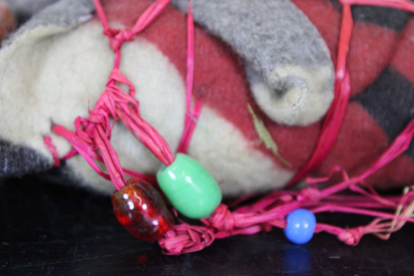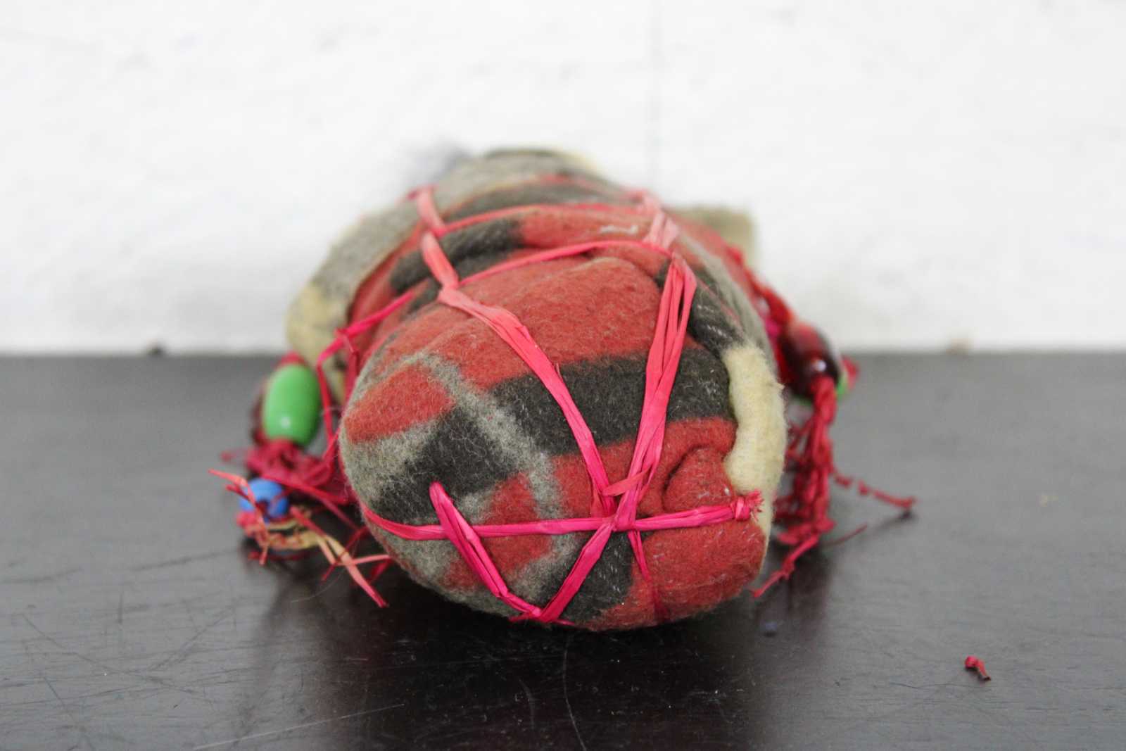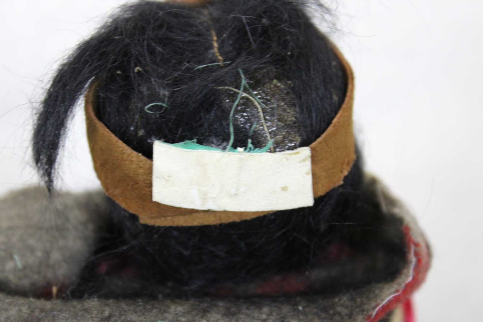 Antique Native American Skookum doll of a small child wrapped in blankets and beaded raffia.