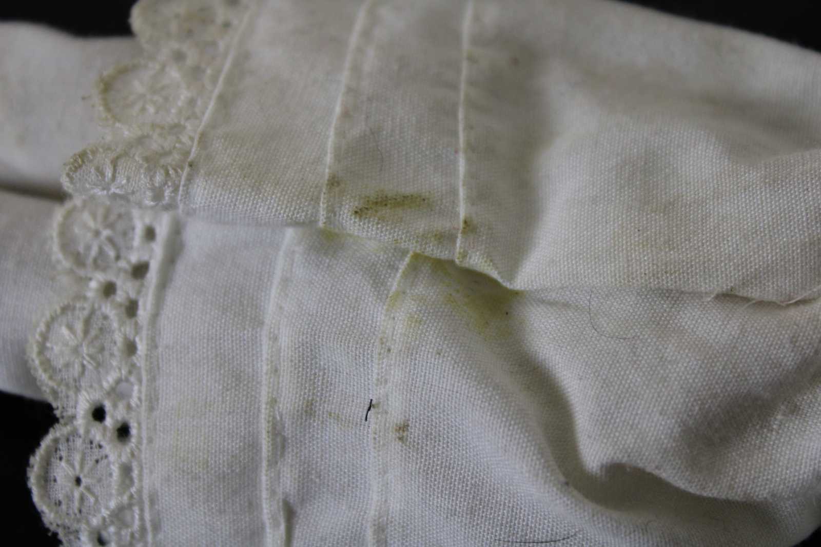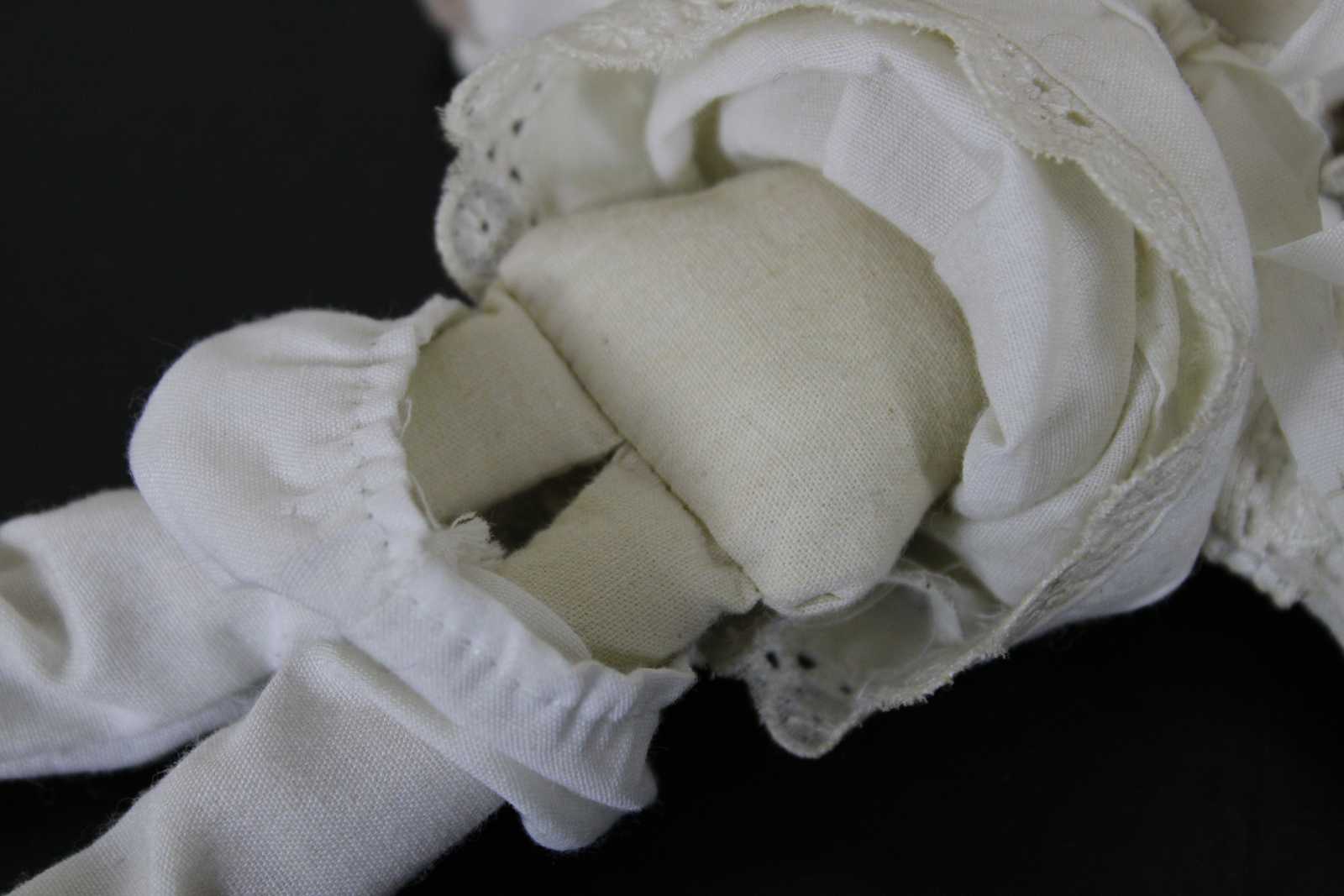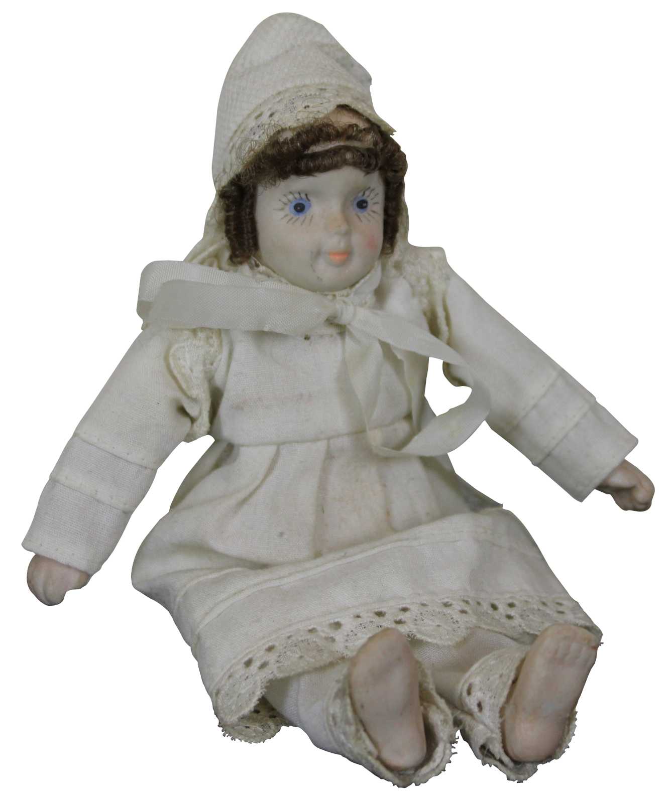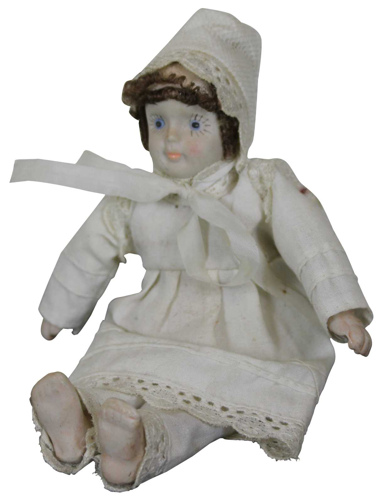 Antique doll with painted bisque head, hands, and feet, brown curls and dressed in white bed clothes.