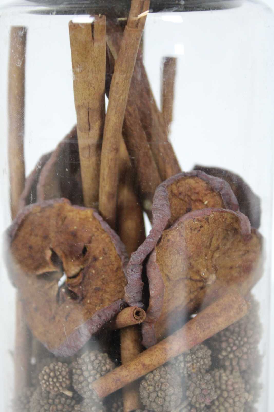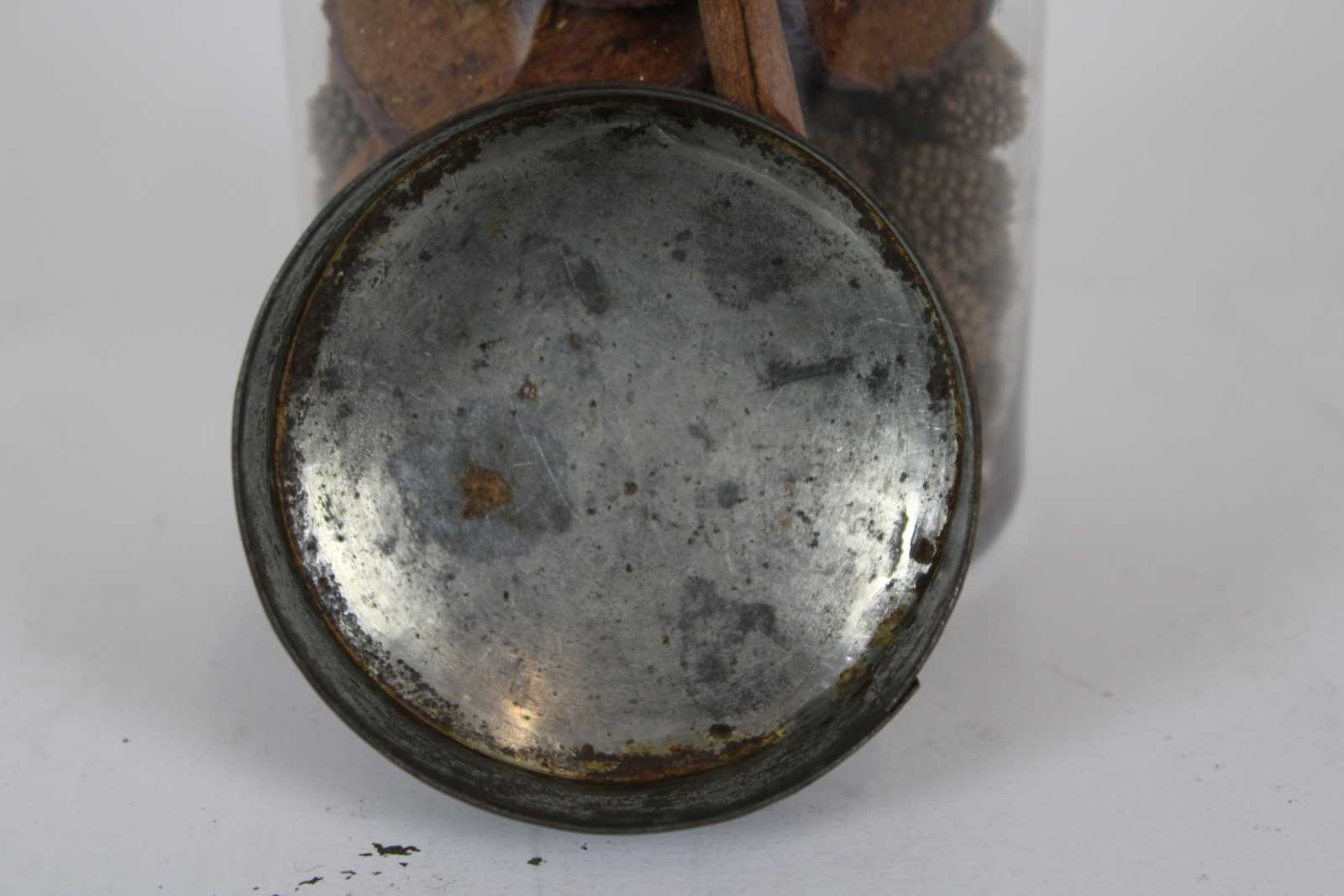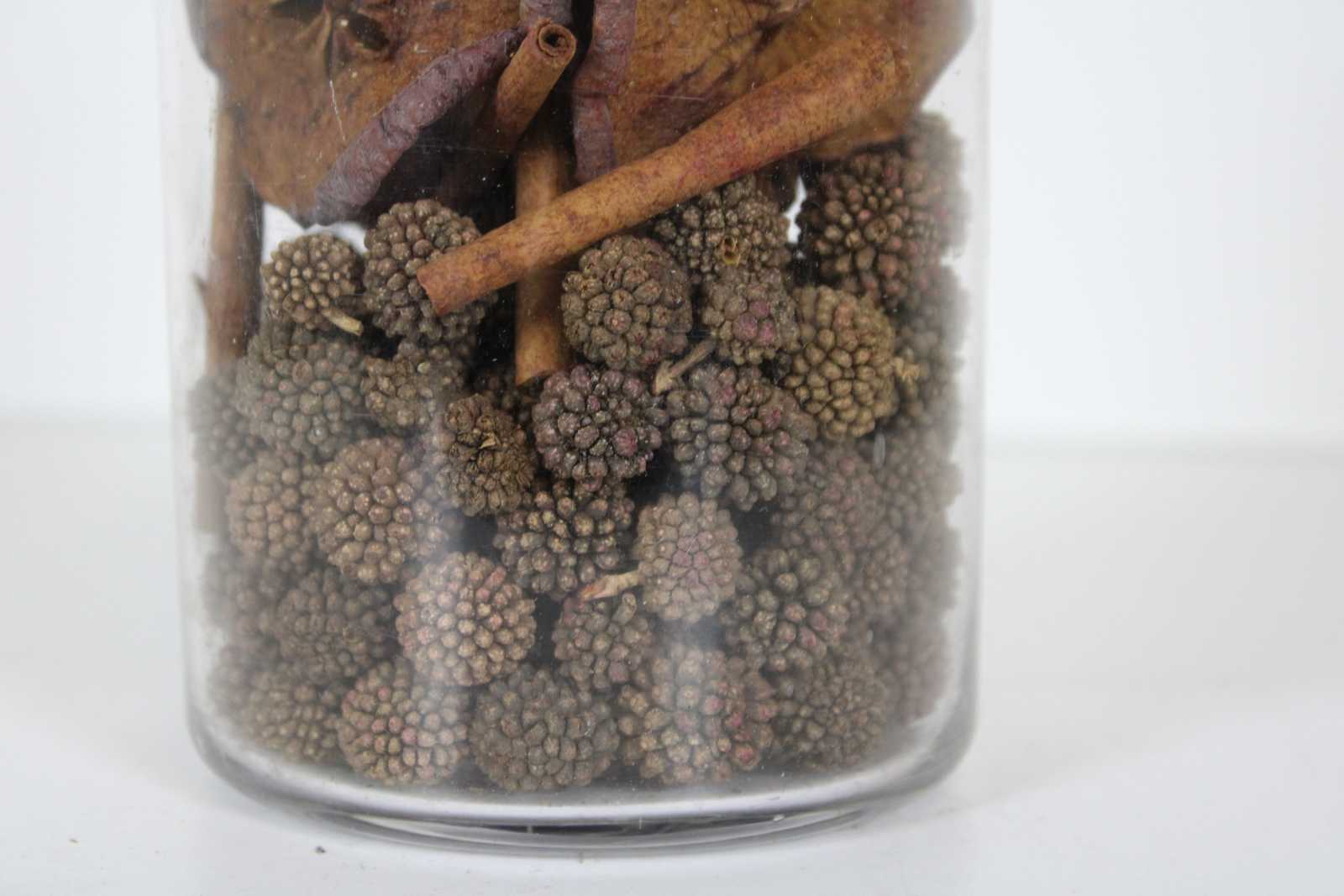 Antique Early American folk art hand blown glass apothecary jar with tin lid, filled with dried oranges/apples, cinnamon sticks and what is probably golpipal (aka Round Pipal, related to long pepper) or blackberries.