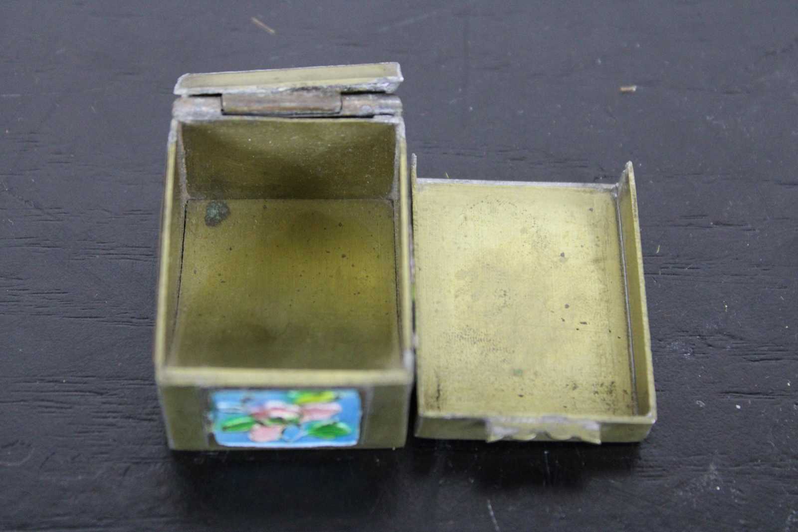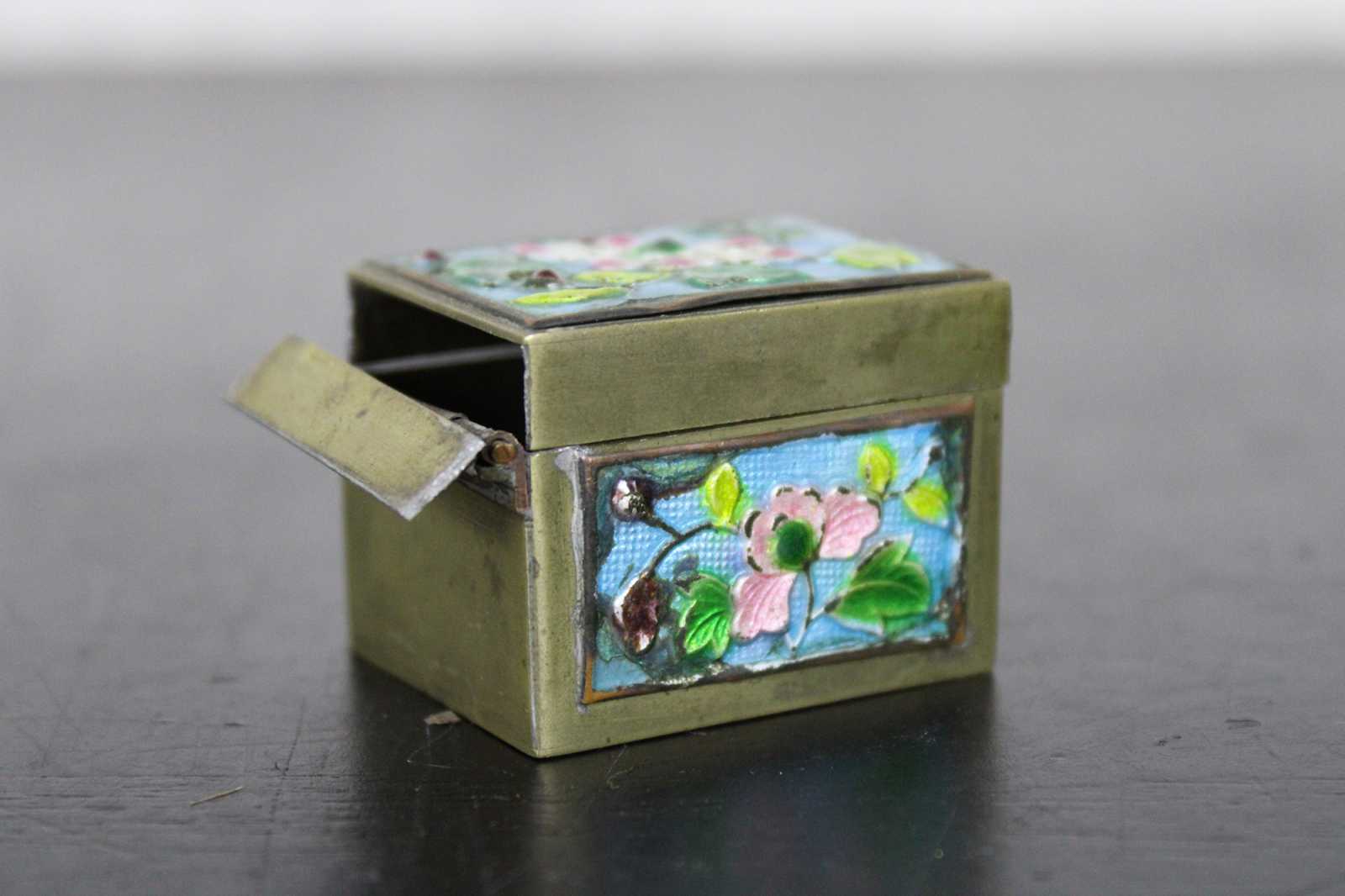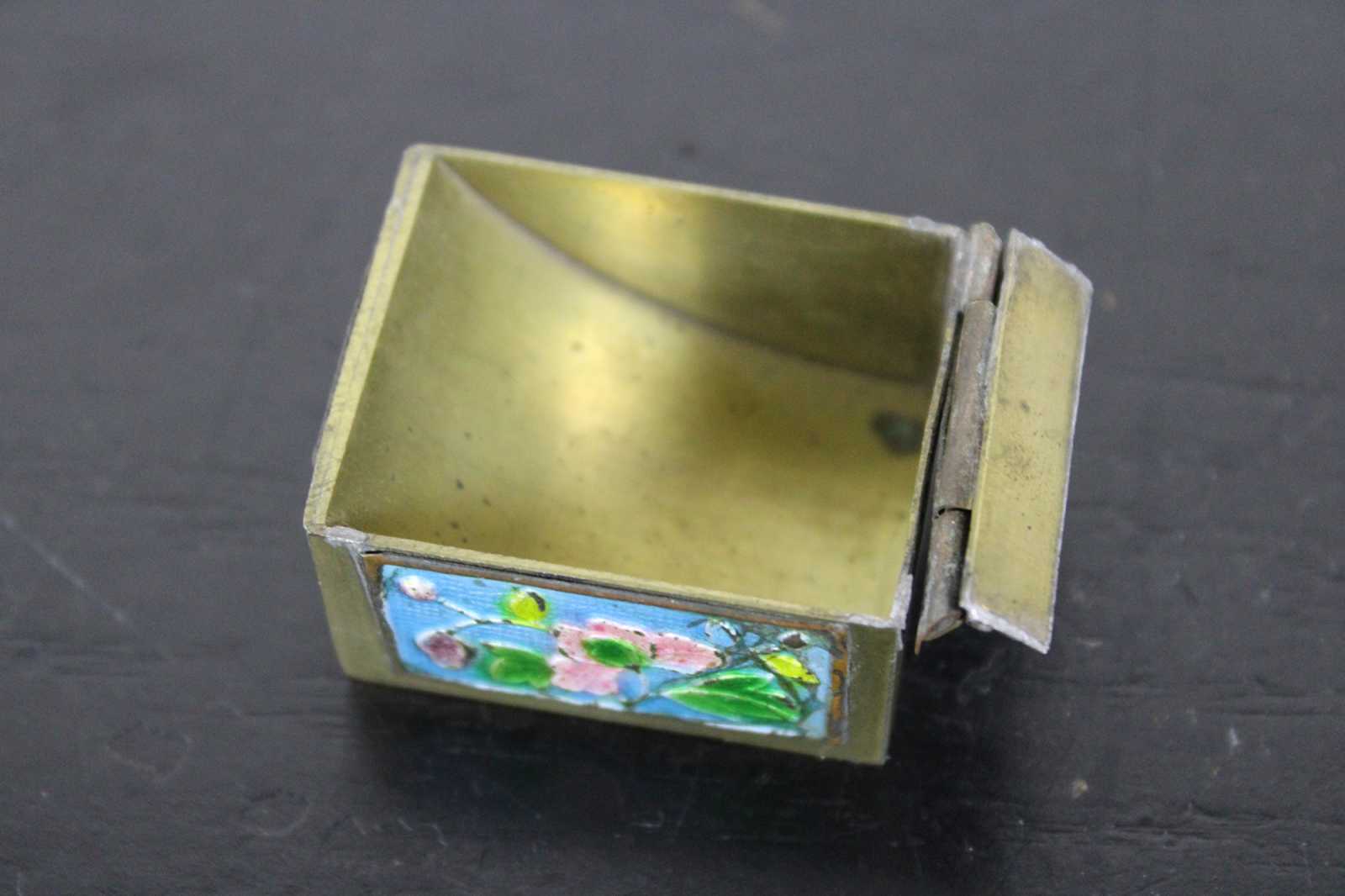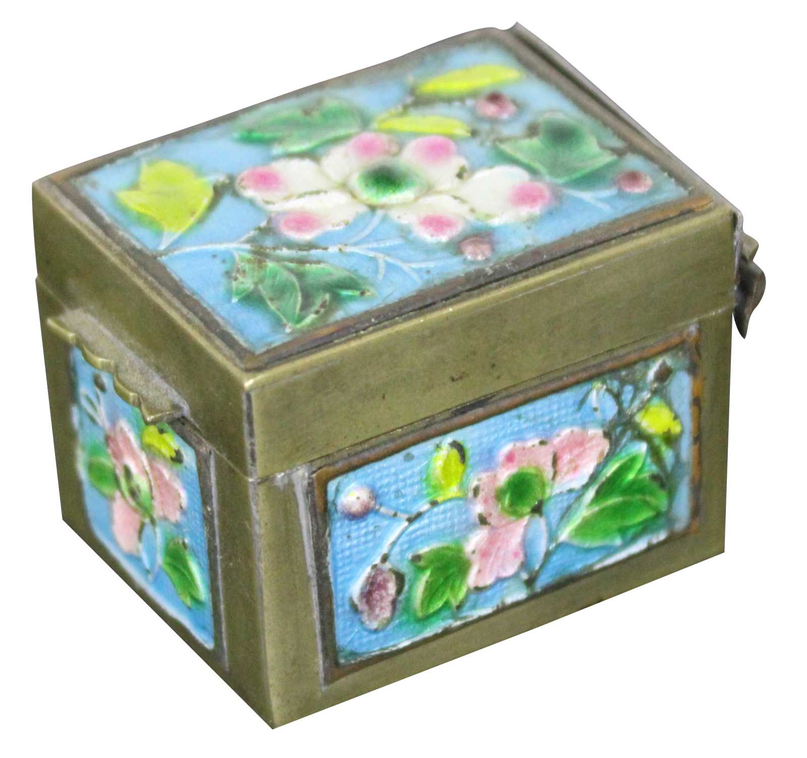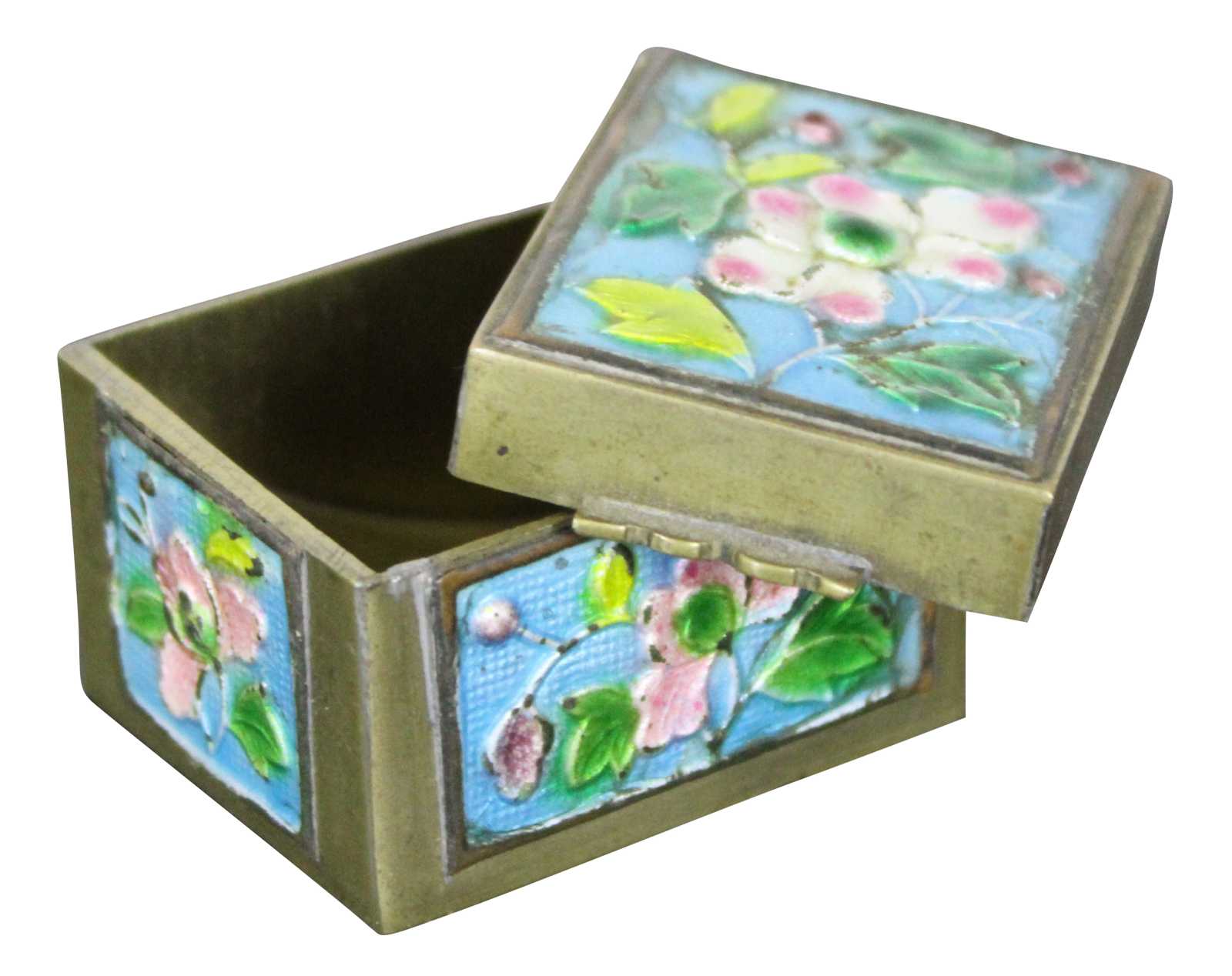 Vintage brass stamp roll holder with blue and pink floral enamel accents; made in China.