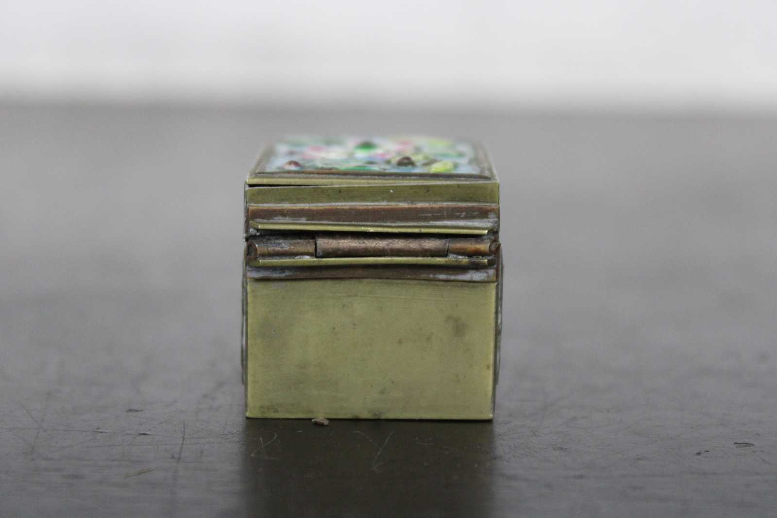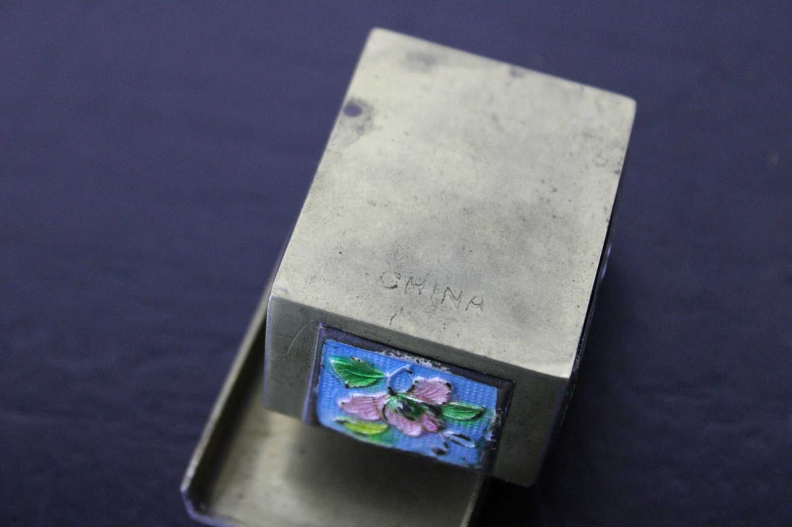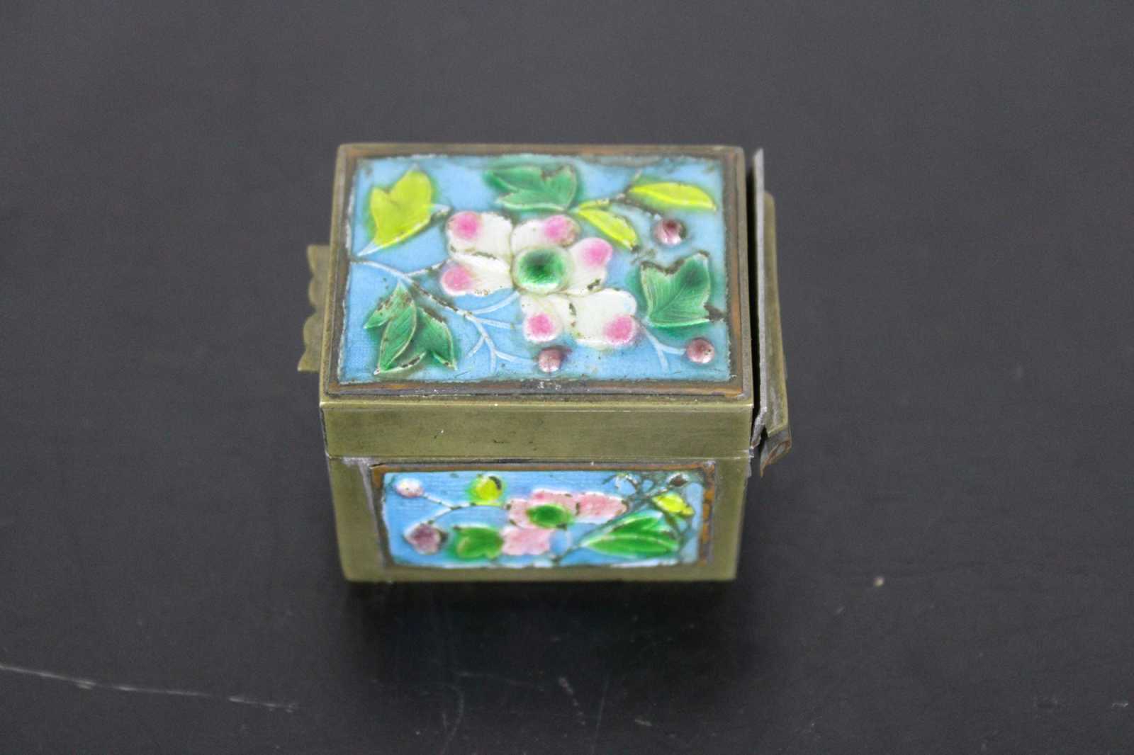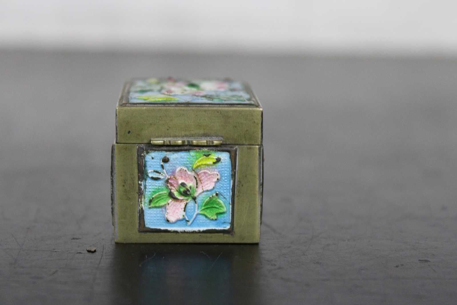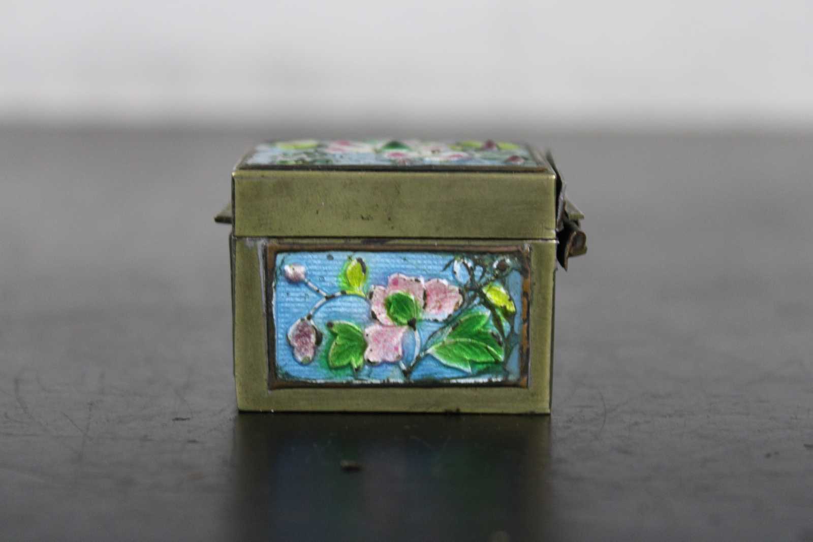 Vintage brass stamp roll holder with blue and pink floral enamel accents; made in China.