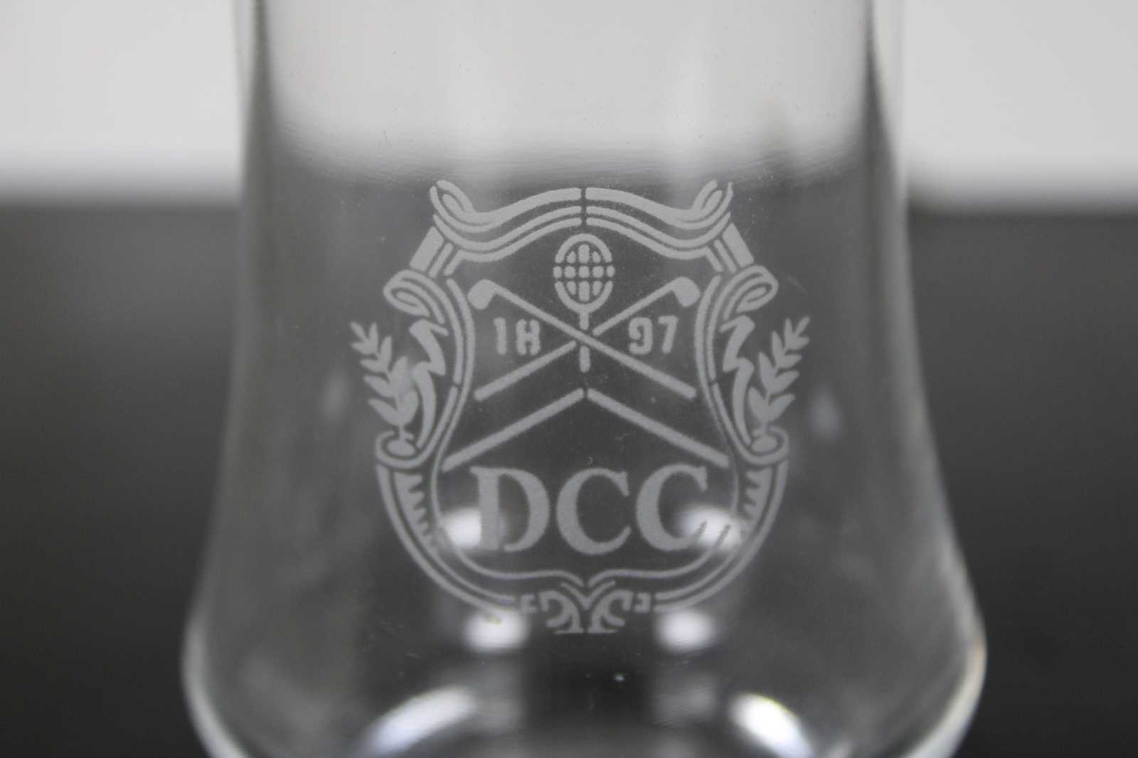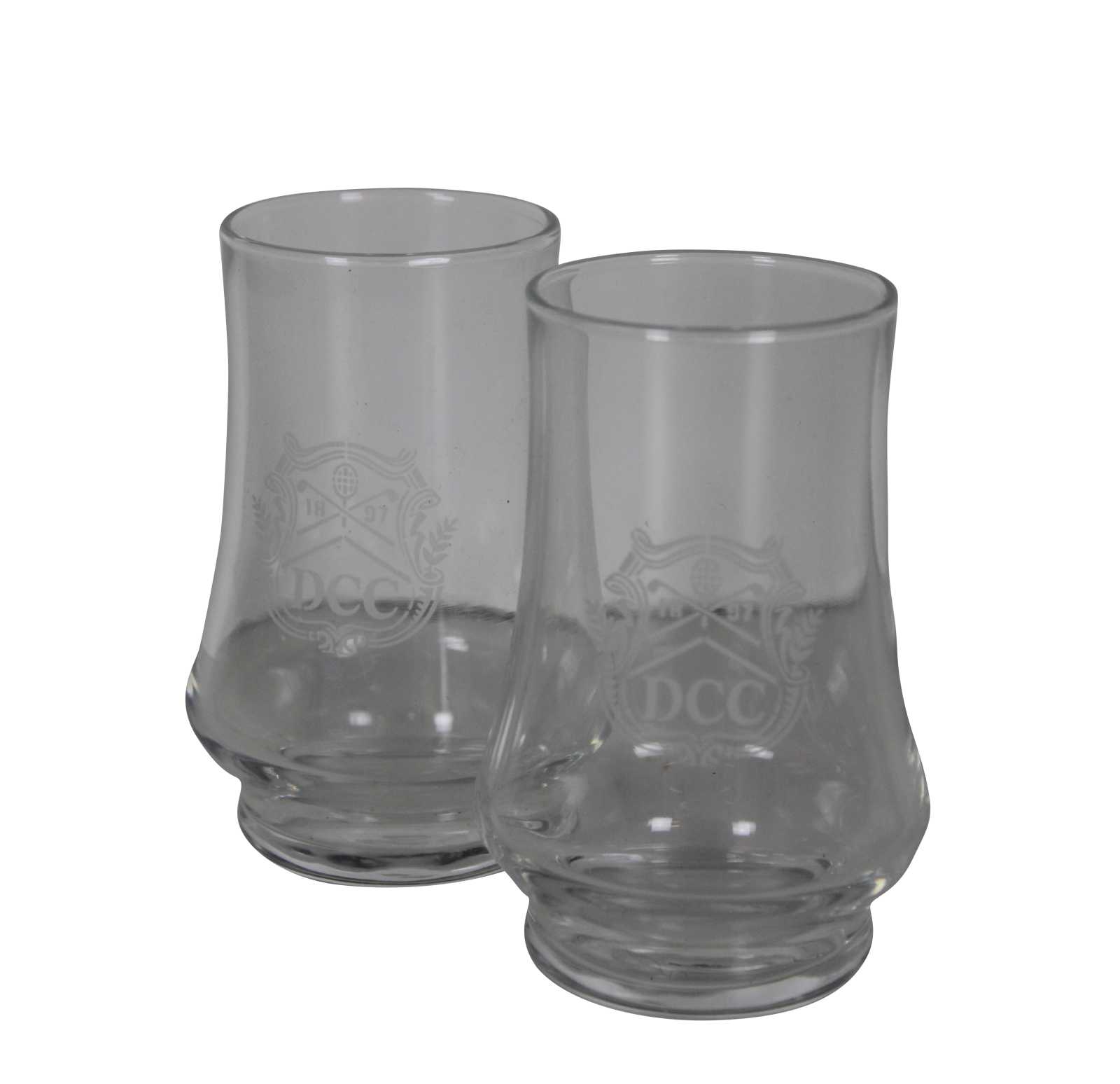 Pair of vintage Dayton Country Club whiskey glasses with frosted logo.