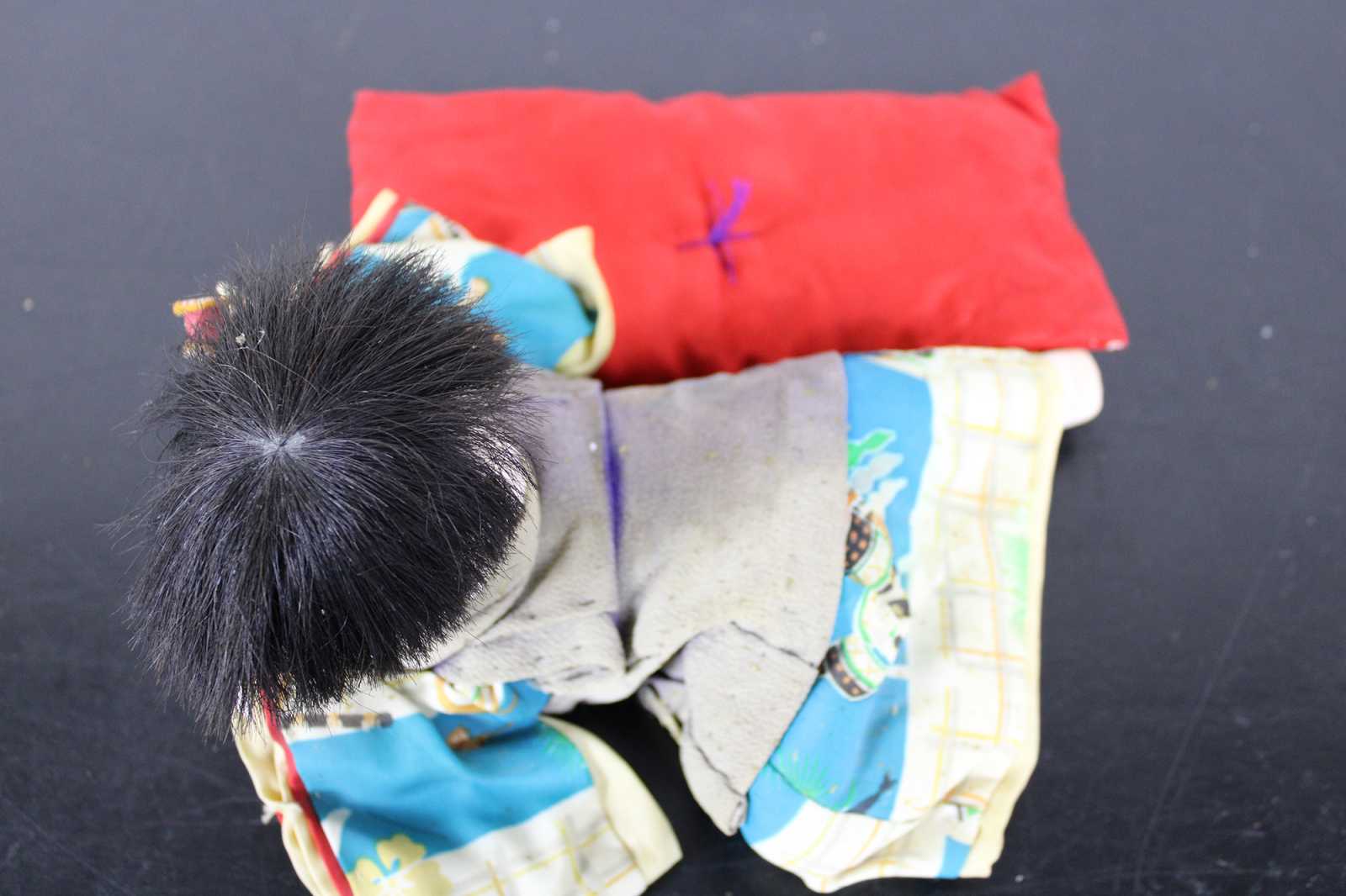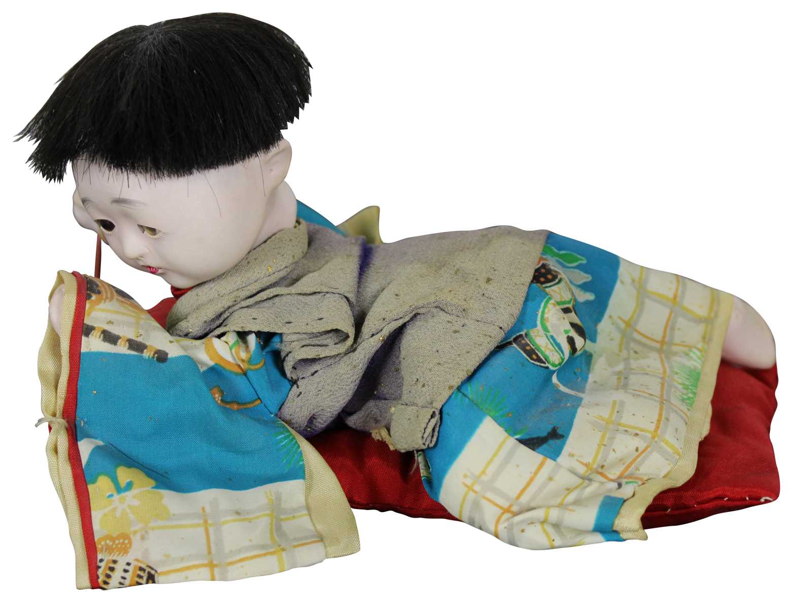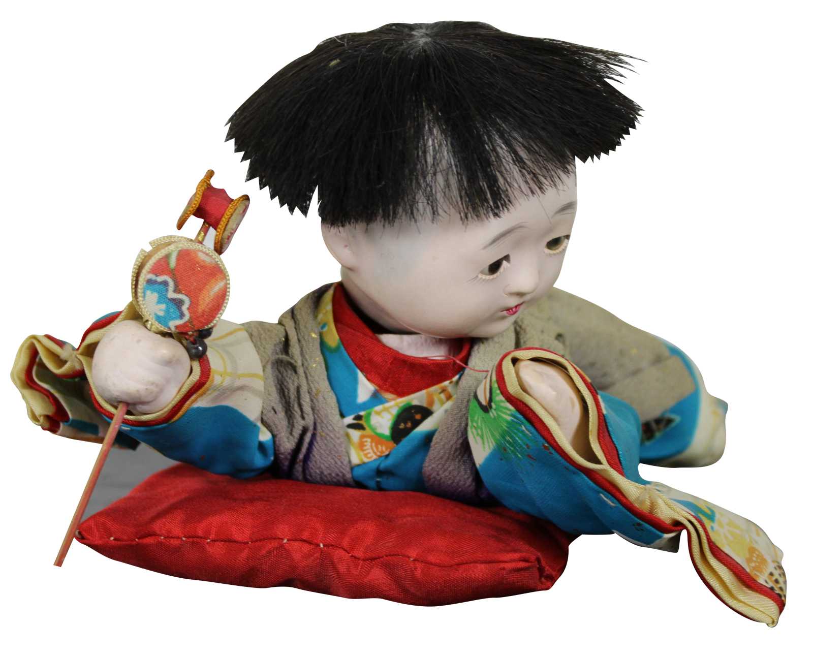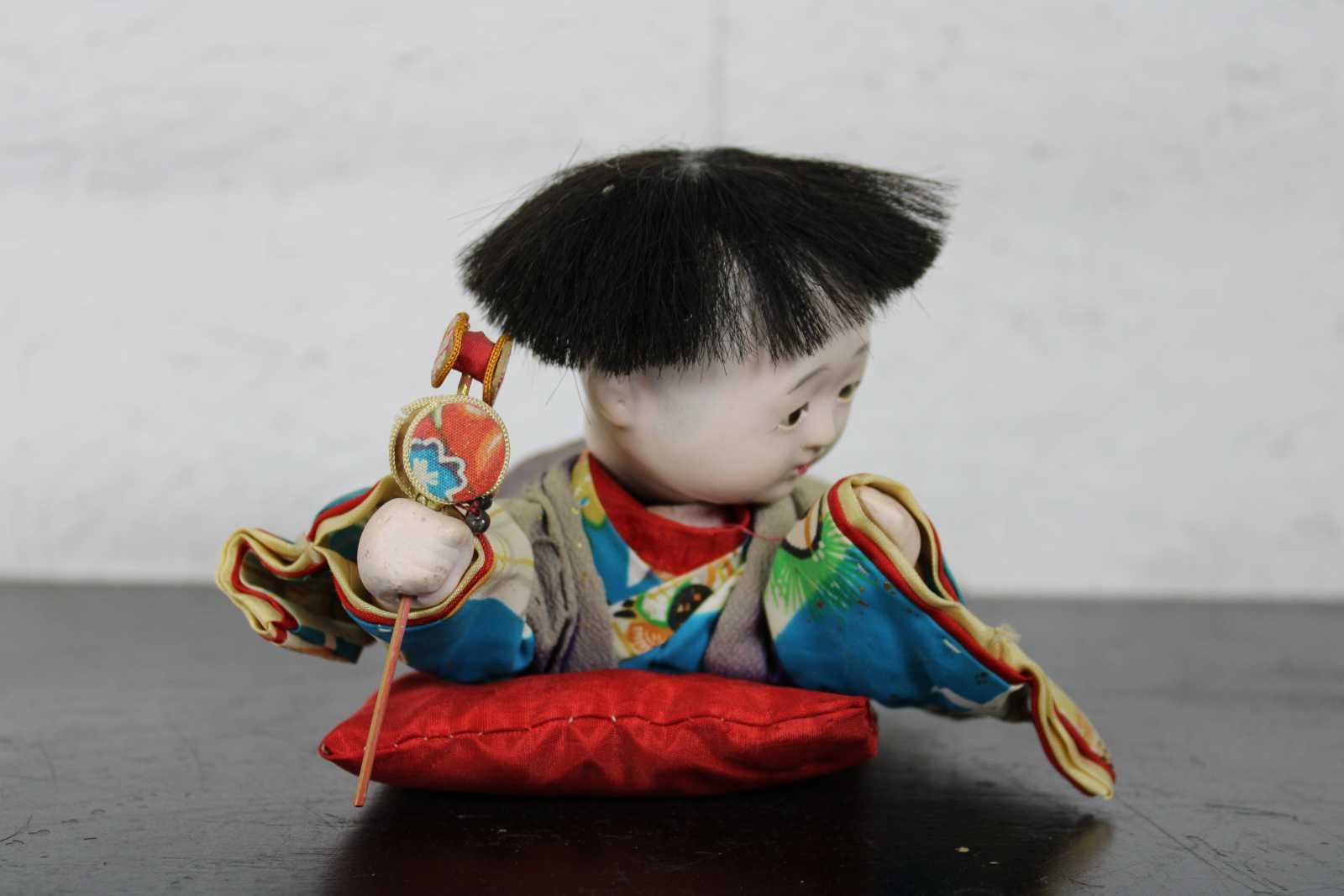 Small vintage Japanese ichimatsu doll in the shape of a crawling baby on a pillow holding a decorative toy or rattle. “Already for the birth of a child dolls, as Kimekomi and Ichimatsu, were given as a present from the relatives.