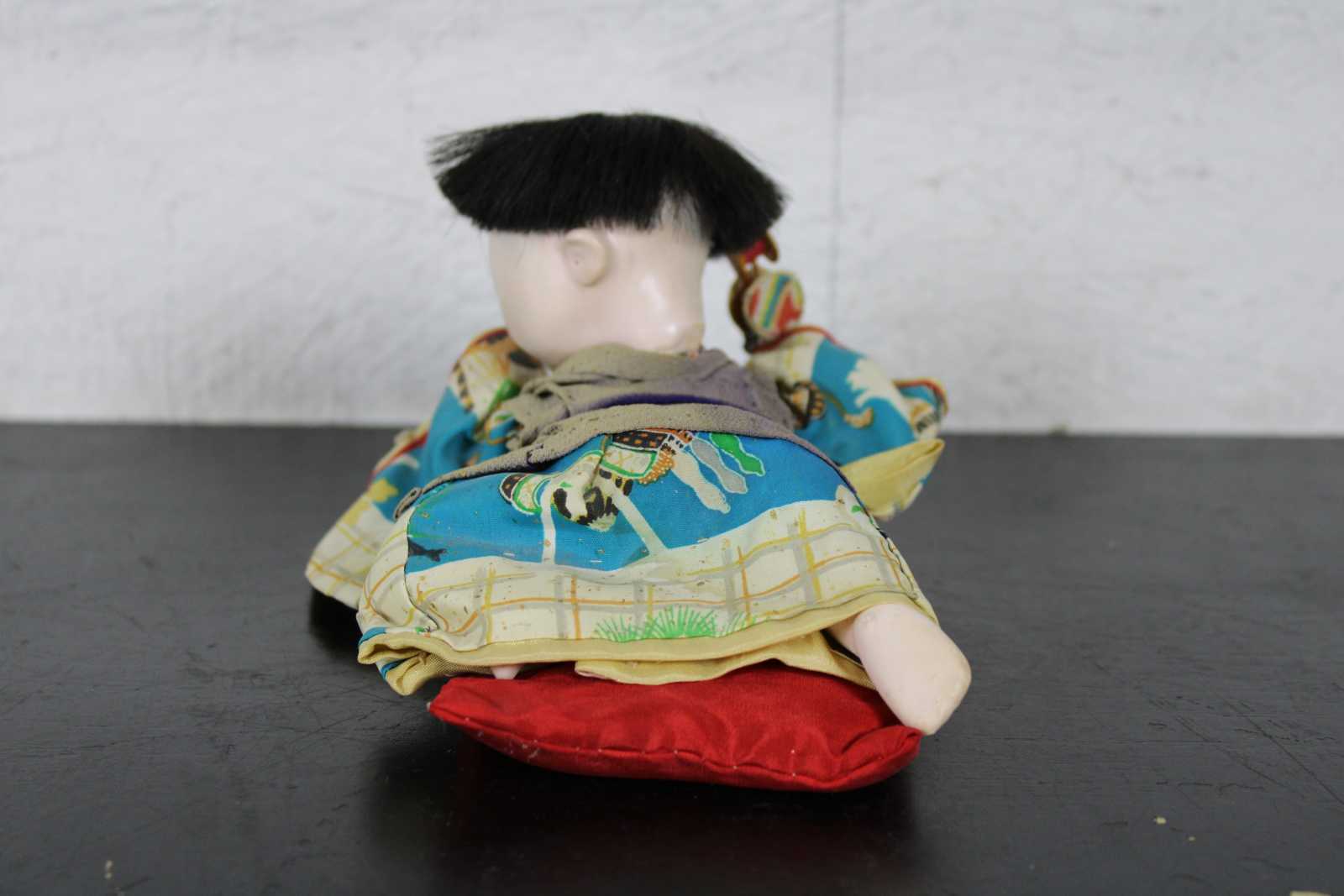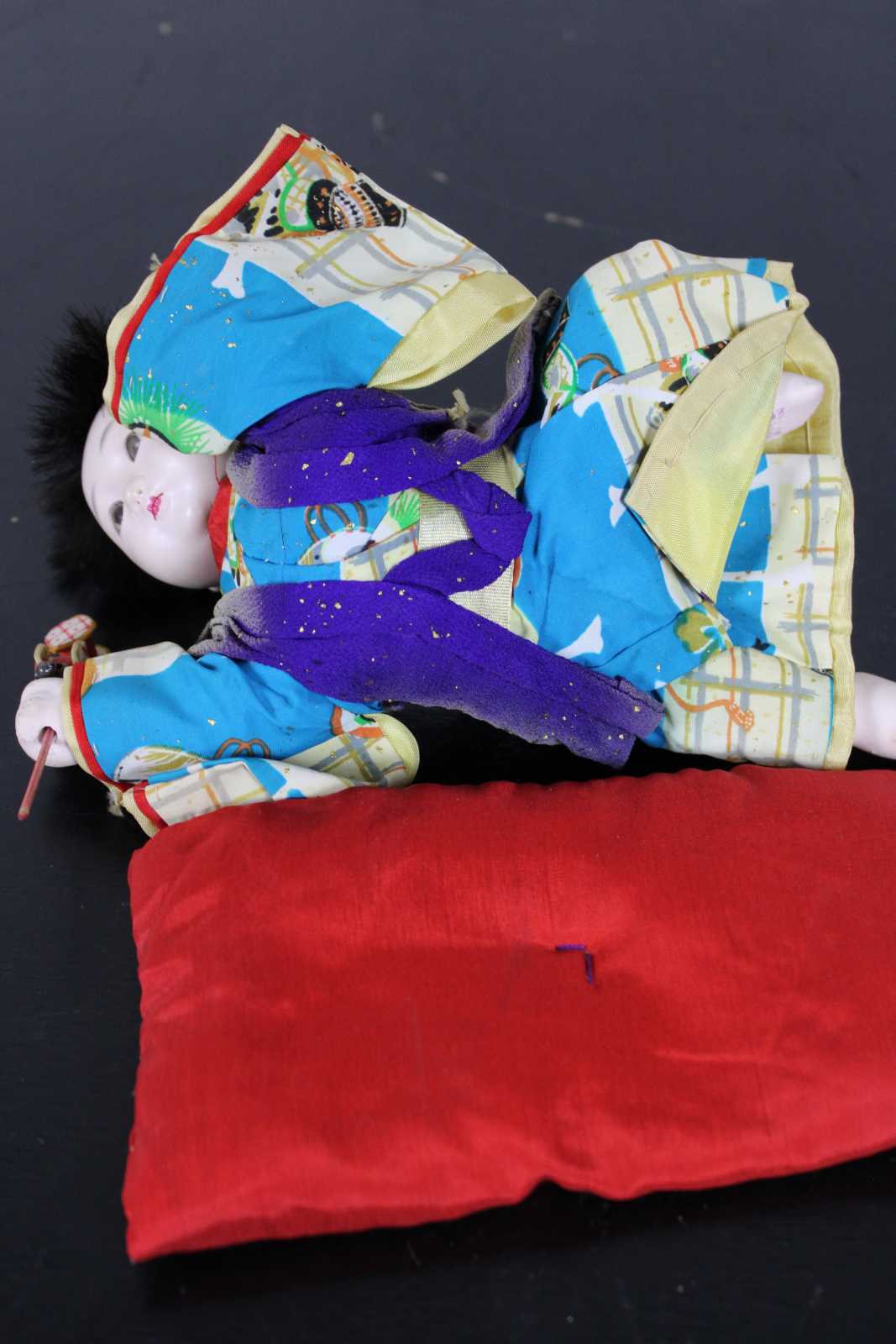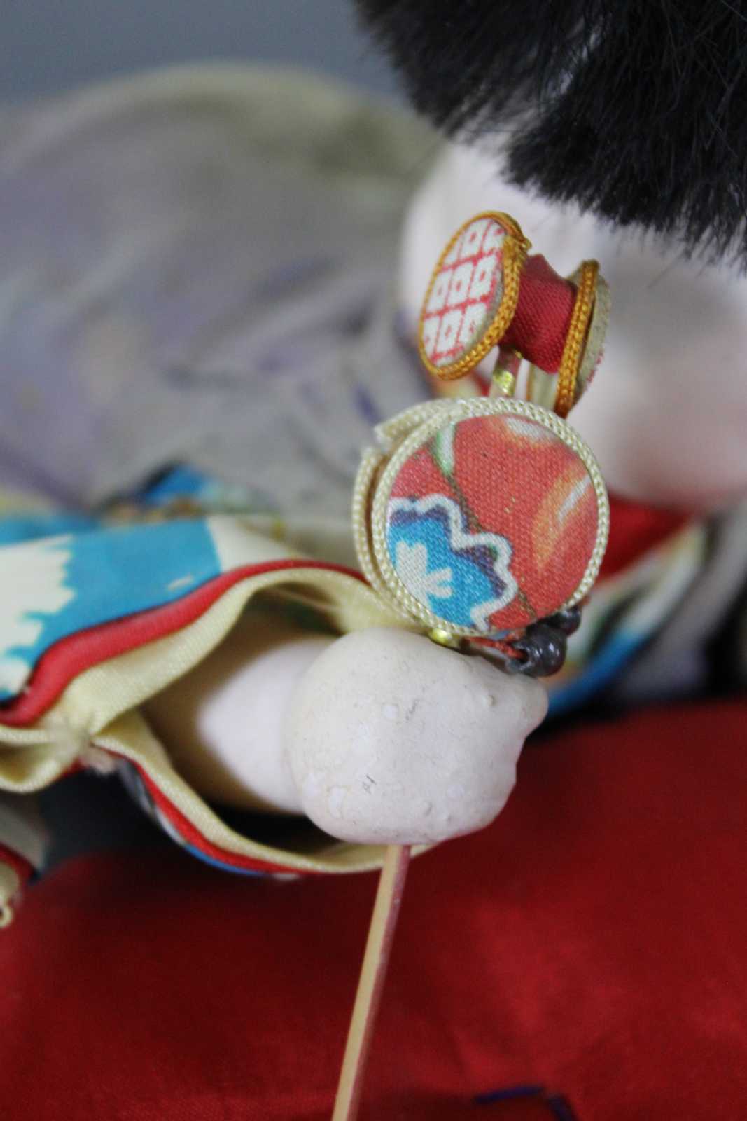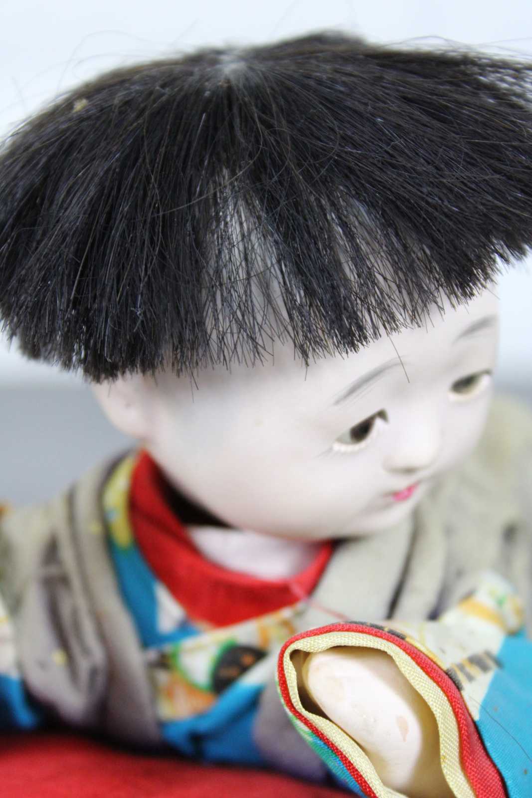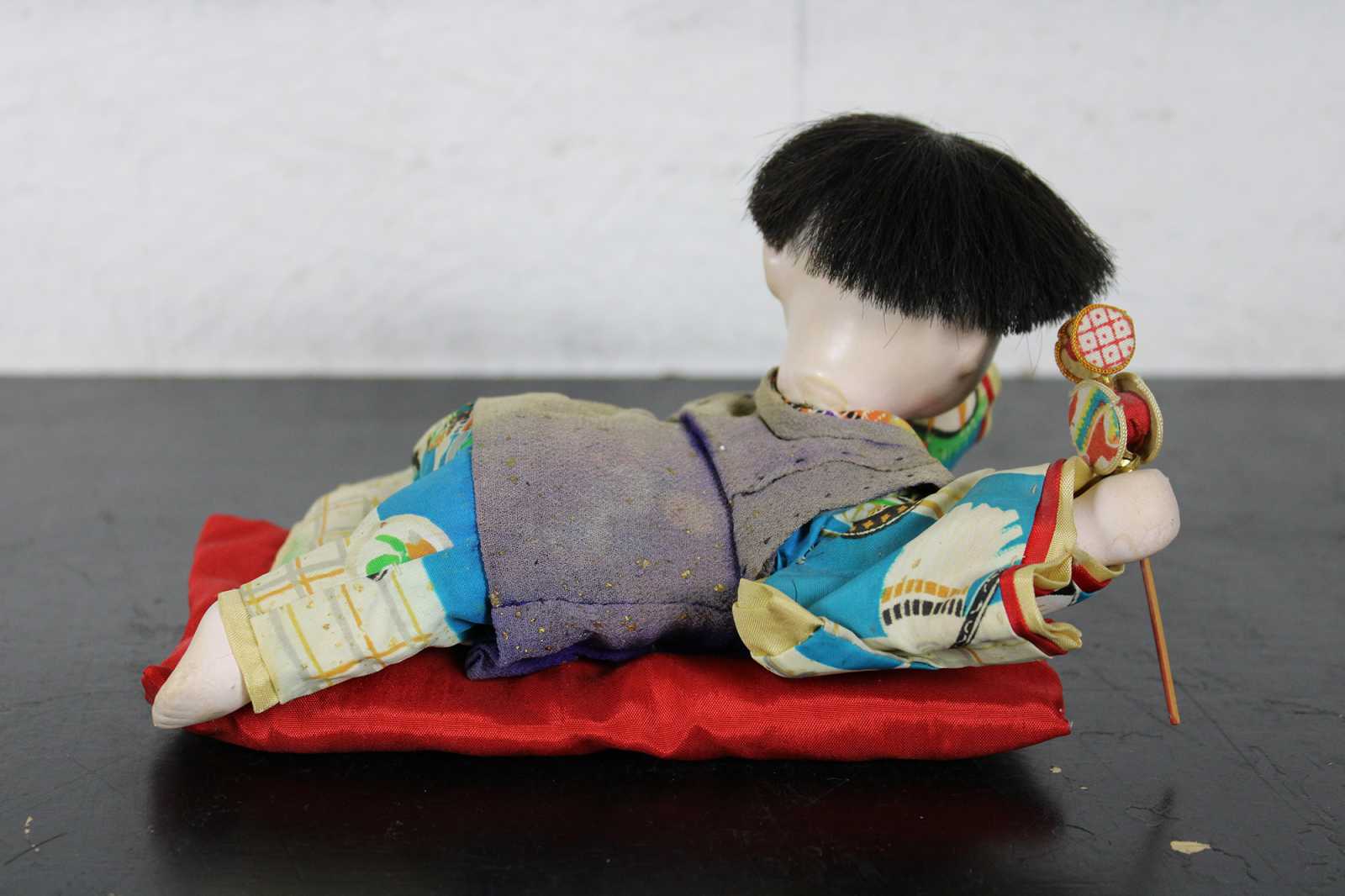 Small vintage Japanese ichimatsu doll in the shape of a crawling baby on a pillow holding a decorative toy or rattle. “Already for the birth of a child dolls, as Kimekomi and Ichimatsu, were given as a present from the relatives.
