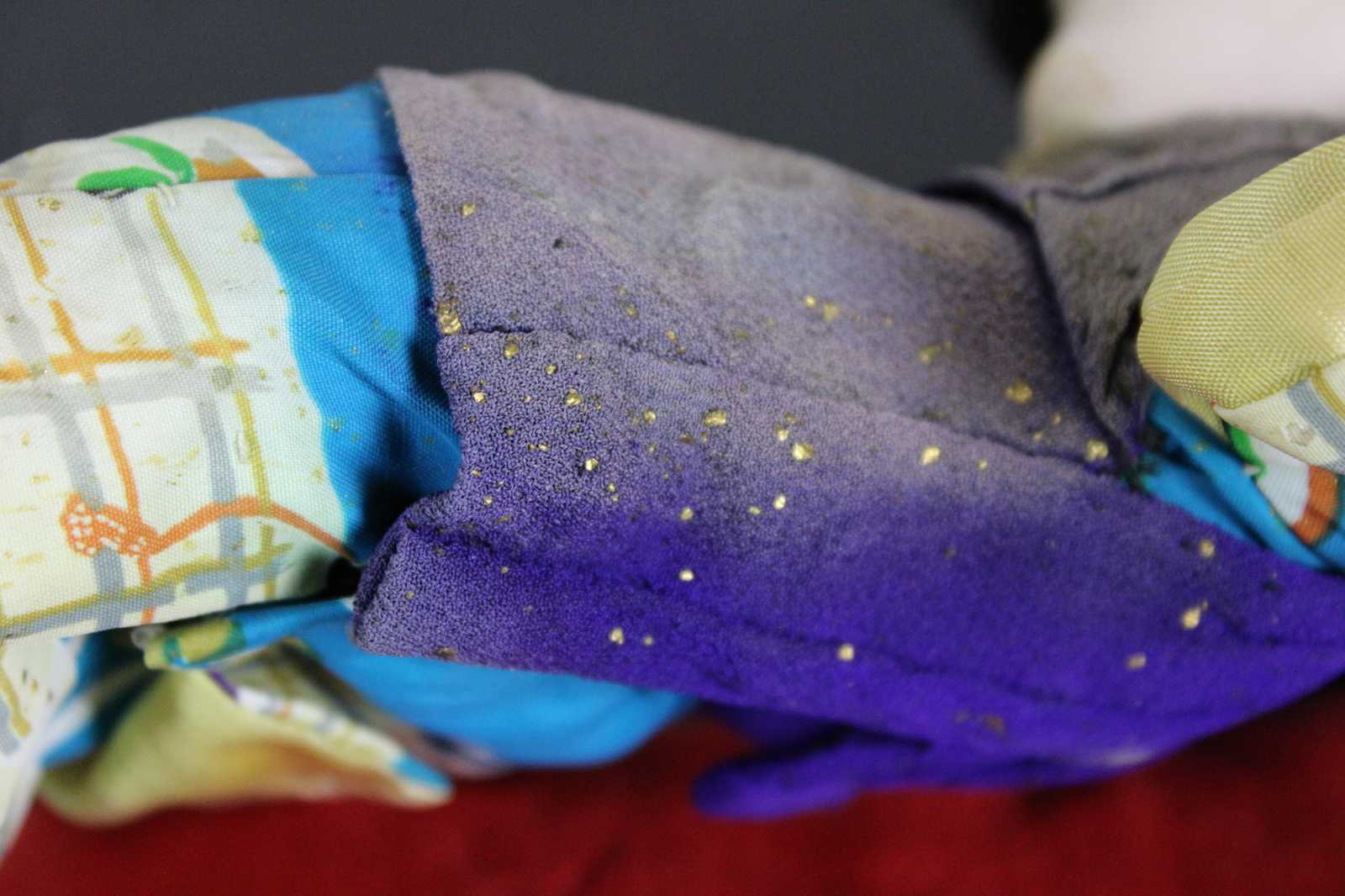 Kimekomi 'means ""tuck in"" in Japanese and refers to a method of making dolls. The ancestors of Kimekomi dolls are the Kamo (""willow-wood"") dolls, small dolls carved of willow and decorated with cloth scraps. Kimekomi dolls start with a carved and/or molded base of wood, wood compo, or paulownia sawdust mixed with glue. A design of different patterned cloth made of silk brocade with traditional Japanese design scraps is planned out, and the base is grooved so that the edges of the cloth can be hidden in the grooves. The cloth is glued on and the edges tucked in. The head and hands (if any) of the doll are usually finished with gofun (crashed oyster shell), doll's face covered in a highly burnished gofun and hand-painted, the hair may be a part of the molded head or be a separate wig. These lovely dolls have become a very popular Japanese craft.