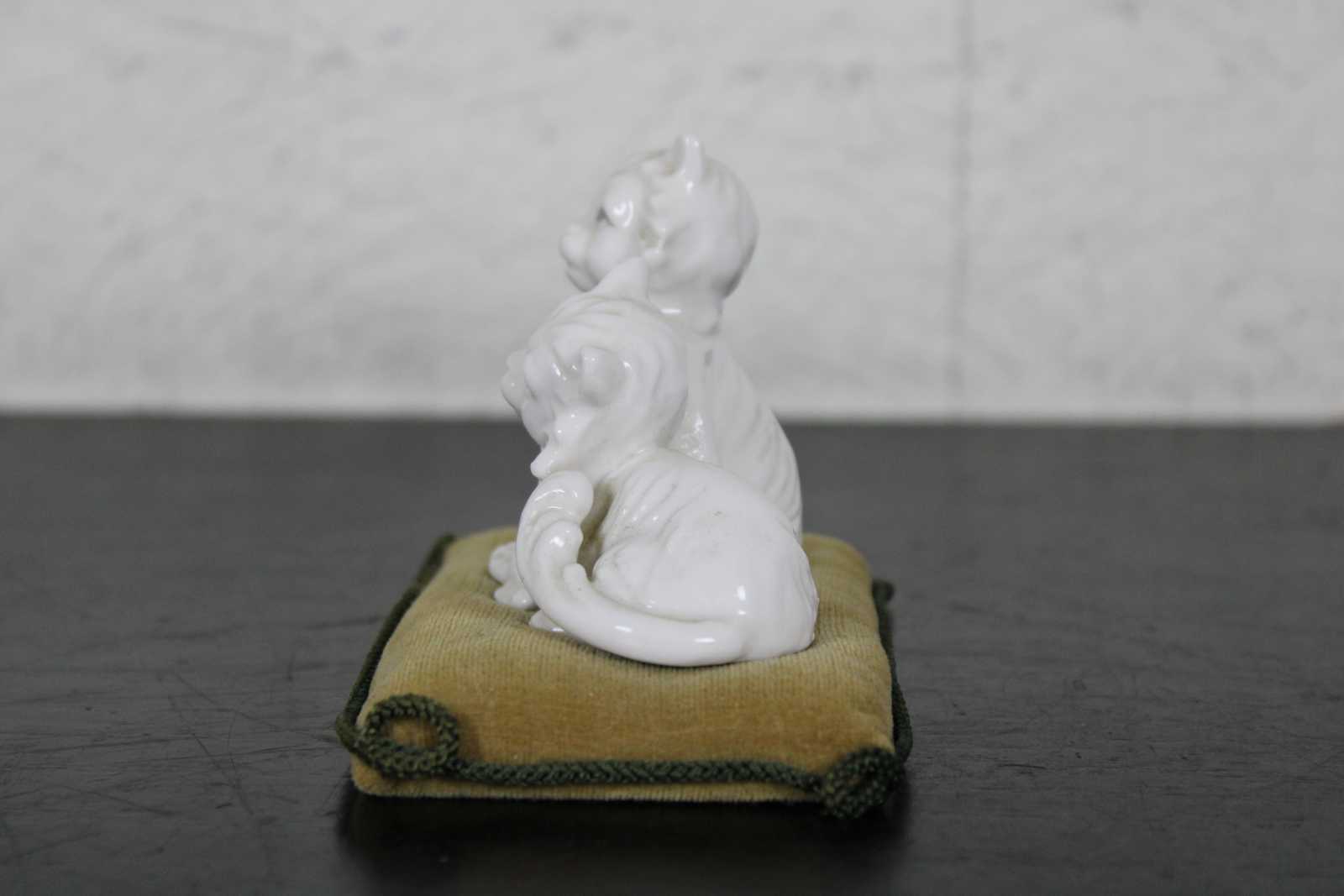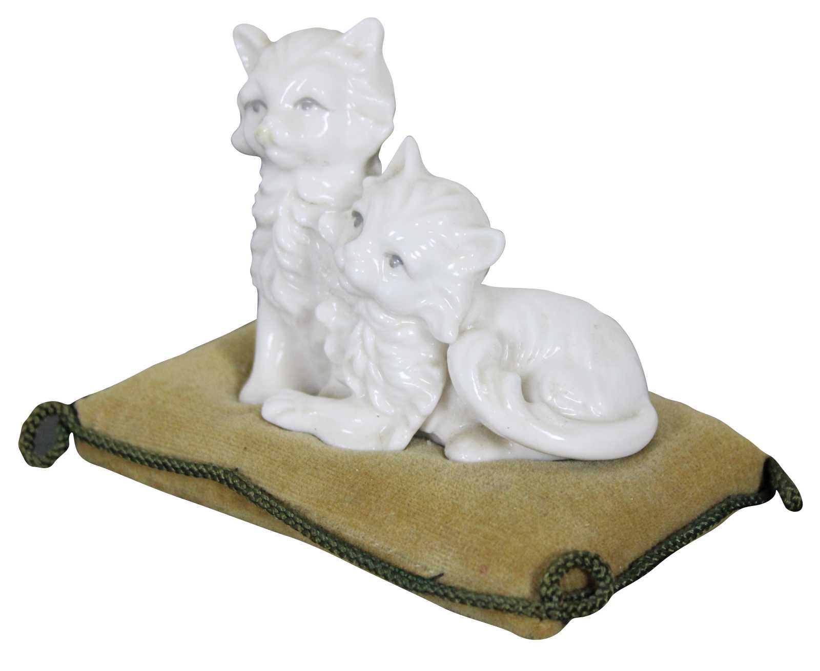 Antique porcelain pair of cats seated on an olive green velvet pillow shaped pin cushion.