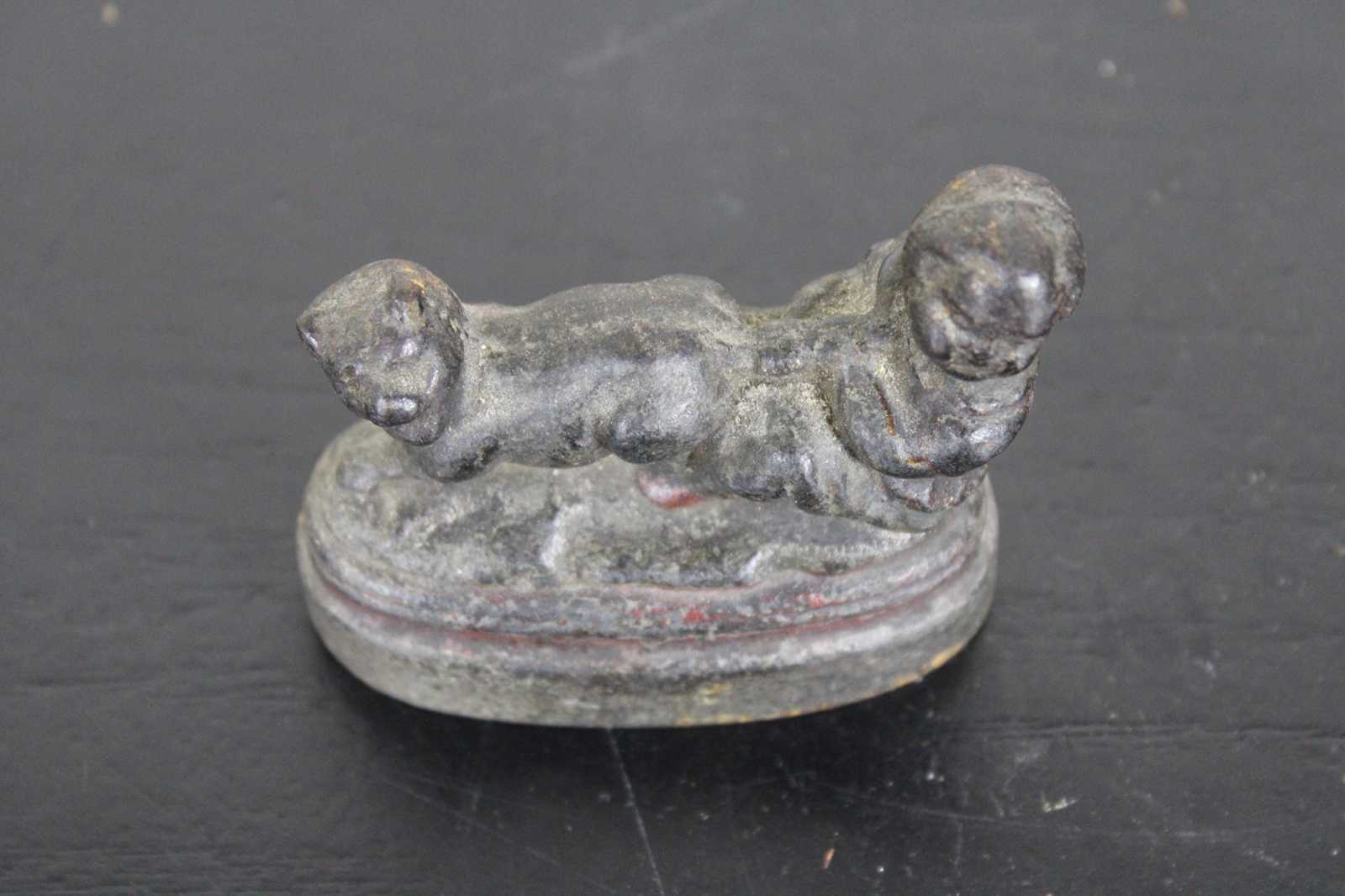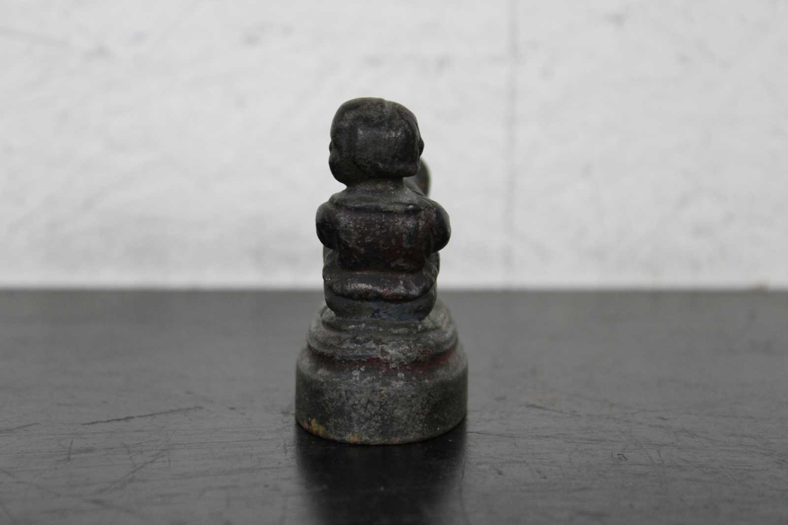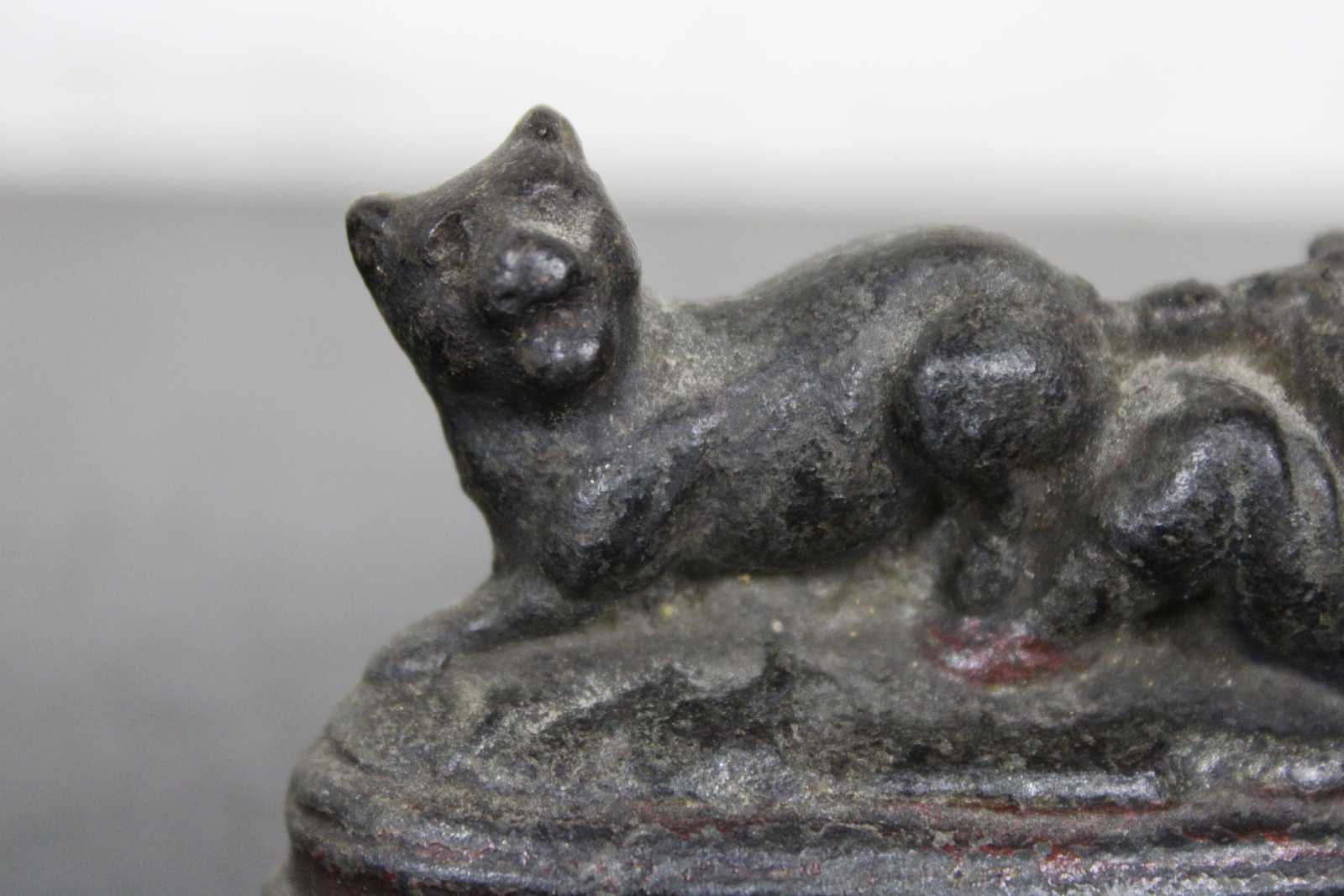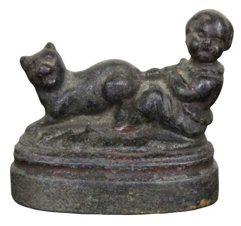 Antique cast iron miniature figurine of a small child pulling a cat’s tail on a flat iron base.