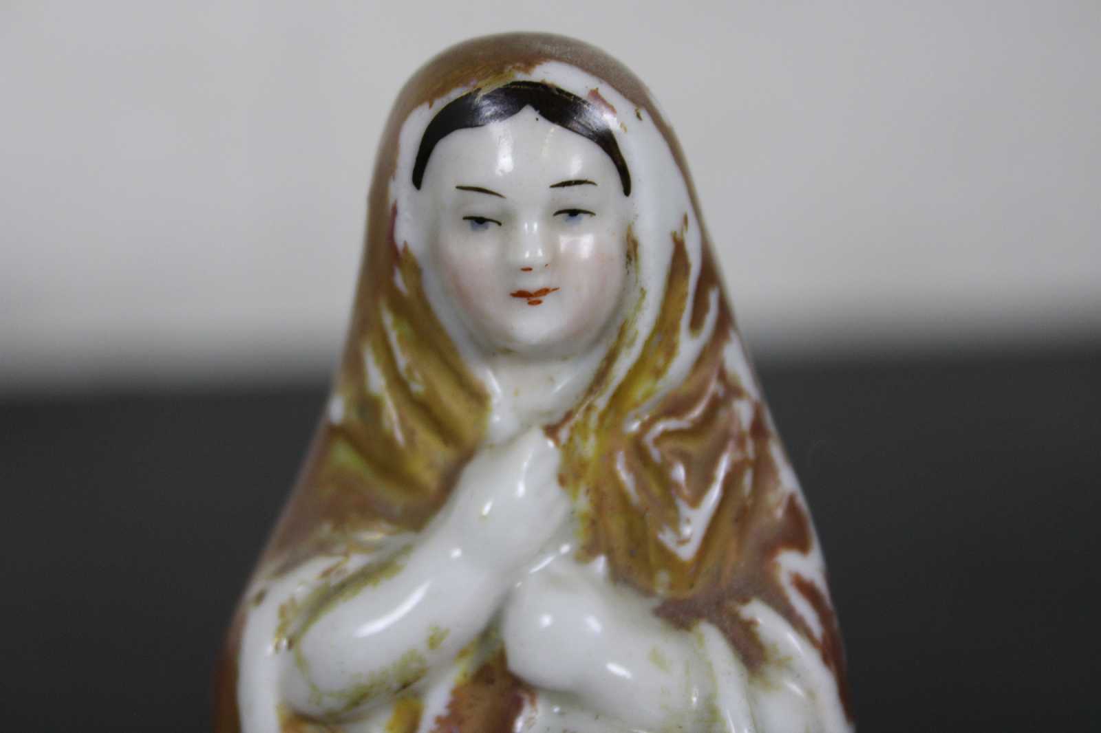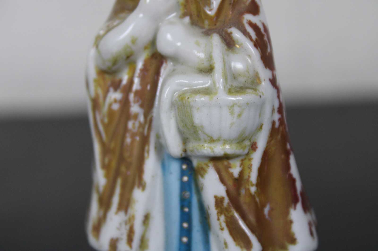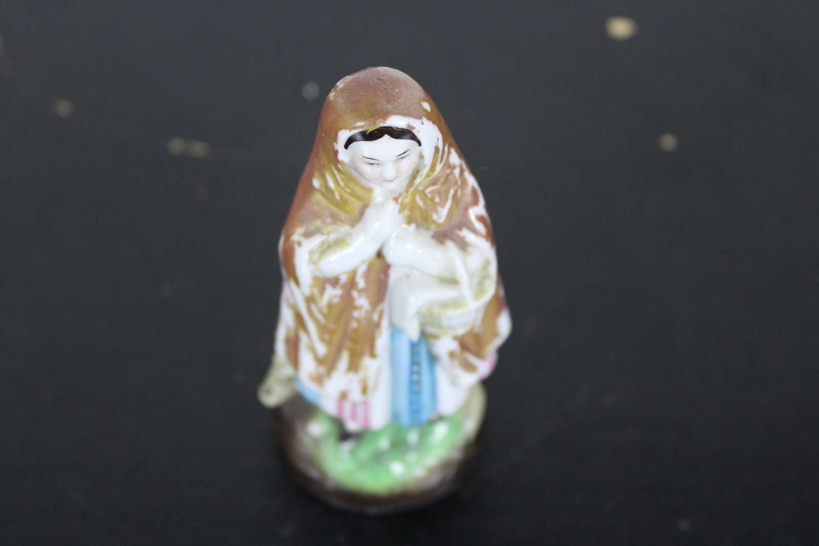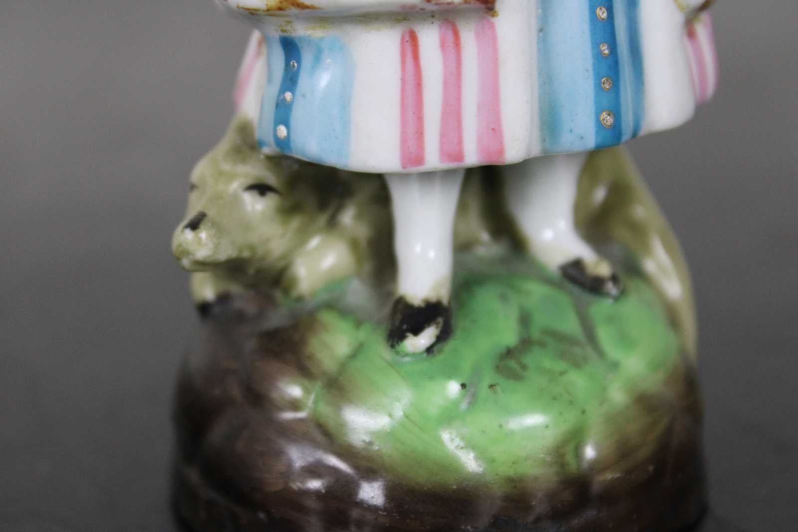 Antique 19th century miniature Staffordshire porcelain figurine of a peasant woman (Red Riding Hood) wrapped in a cloak, holding a basket, with a wolf at her feet.