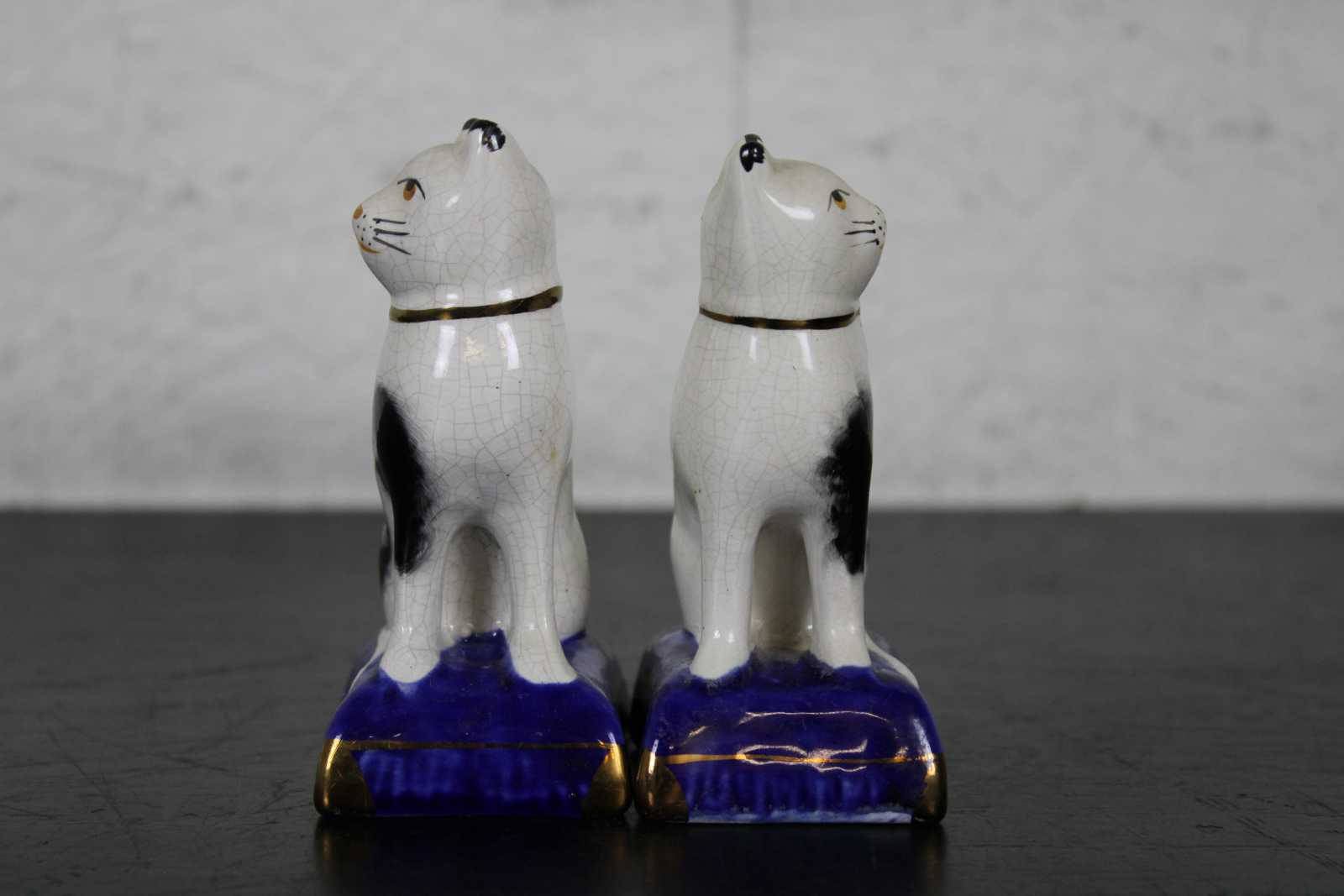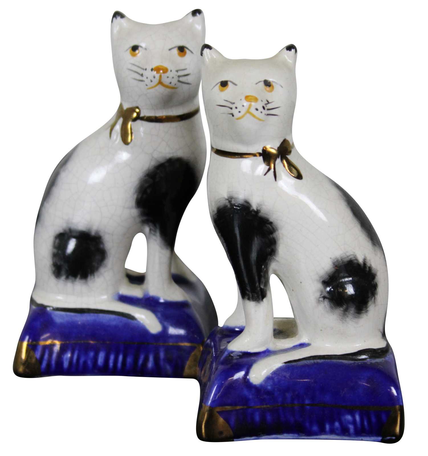 Pair of antique Staffordshire porcelain miniature black and white spotted cat figurines.