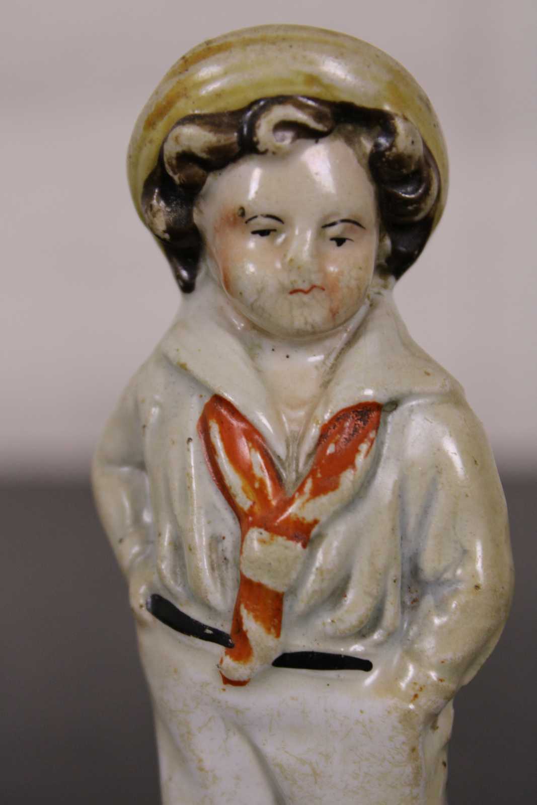 Antique 19th century Staffordshire porcelain miniature figurine in the shape of a young boy dressed for a day at the beach in a hat and sailor suit with his hands in his pockets.